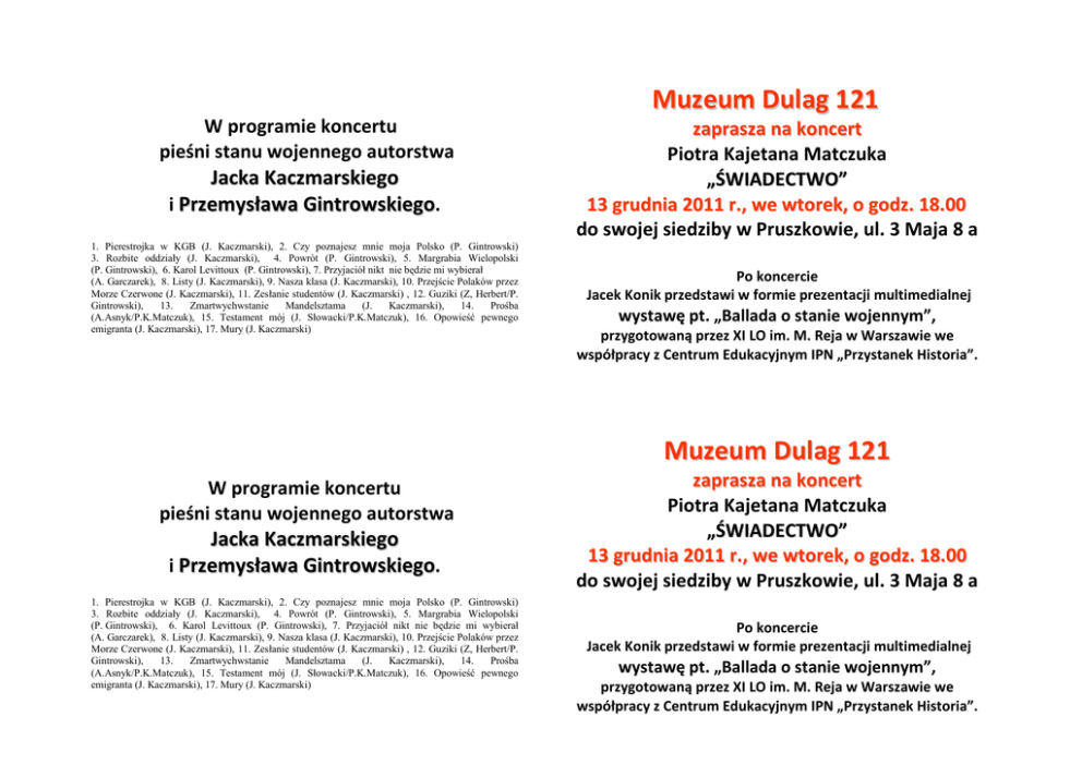 W programie koncertu pieśni stanu wojennego autorstwa Jacka Kaczmarskiego i Przemysława Gintrowskiego. 1. Pierestrojka w KGB (J. Kaczmarski), 2. Czy poznajesz mnie moja Polsko (P. Gintrowski) 3. Rozbite oddziały (J. Kaczmarski), 4. Powrót (P. Gintrowski), 5. Margrabia Wielopolski (P. Gintrowski), 6. Karol Levittoux (P. Gintrowski), 7. Przyjaciół nikt nie będzie mi wybierał (A. Garczarek), 8. Listy (J. Kaczmarski), 9. Nasza klasa (J. Kaczmarski), 10. Przejście Polaków przez Morze Czerwone (J. Kaczmarski), 11. Zesłanie studentów (J. Kaczmarski) , 12. Guziki (Z, Herbert/P. Gintrowski), 13. Zmartwychwstanie Mandelsztama (J. Kaczmarski), 14. Prośba (A.Asnyk/P.K.Matczuk), 15. Testament mój (J. Słowacki/P.K.Matczuk), 16. Opowieść pewnego emigranta (J. Kaczmarski), 17. Mury (J. Kaczmarski) Muzeum Dulag 121 zaprasza na koncert Piotra Kajetana Matczuka „ŚWIADECTWO” 13 grudnia 2011 r., we wtorek, o godz. 18.00 do swojej siedziby w Pruszkowie, ul. 3 Maja 8 a Po koncercie Jacek Konik przedstawi w formie prezentacji multimedialnej wystawę pt. „Ballada o stanie wojennym”, przygotowaną przez XI LO im. M. Reja w Warszawie we współpracy z Centrum Edukacyjnym IPN „Przystanek Historia”. Muzeum Dulag 121 W programie koncertu pieśni stanu wojennego autorstwa Jacka Kaczmarskiego i Przemysława Gintrowskiego. 1. Pierestrojka w KGB (J. Kaczmarski), 2. Czy poznajesz mnie moja Polsko (P. Gintrowski) 3. Rozbite oddziały (J. Kaczmarski), 4. Powrót (P. Gintrowski), 5. Margrabia Wielopolski (P. Gintrowski), 6. Karol Levittoux (P. Gintrowski), 7. Przyjaciół nikt nie będzie mi wybierał (A. Garczarek), 8. Listy (J. Kaczmarski), 9. Nasza klasa (J. Kaczmarski), 10. Przejście Polaków przez Morze Czerwone (J. Kaczmarski), 11. Zesłanie studentów (J. Kaczmarski) , 12. Guziki (Z, Herbert/P. Gintrowski), 13. Zmartwychwstanie Mandelsztama (J. Kaczmarski), 14. Prośba (A.Asnyk/P.K.Matczuk), 15. Testament mój (J. Słowacki/P.K.Matczuk), 16. Opowieść pewnego emigranta (J. Kaczmarski), 17. Mury (J. Kaczmarski) zaprasza na koncert Piotra Kajetana Matczuka „ŚWIADECTWO” 13 grudnia 2011 r., we wtorek, o godz. 18.00 do swojej siedziby w Pruszkowie, ul. 3 Maja 8 a Po koncercie Jacek Konik przedstawi w formie prezentacji multimedialnej wystawę pt. „Ballada o stanie wojennym”, przygotowaną przez XI LO im. M. Reja w Warszawie we współpracy z Centrum Edukacyjnym IPN „Przystanek Historia”.