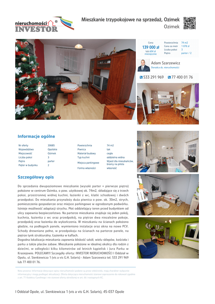 Mieszkanie trzypokojowe na sprzedaż, Ozimek Ozimek Cena 139 000 zł lub 604 zł miesięcznie Powierzchnia Cena za metr Liczba pokoi Piętro 74 m2 1 878 zł 3 parter / 2 Adam Szarzewicz Doradca ds. nieruchomości 533 291 969 Informacje ogólne Nr oferty 30685 Powierzchnia 74 m2 Województwo Opolskie Piwnica tak Miejscowość Ozimek Materiał budowy cegła Liczba pokoi 3 Typ kuchni oddzielna widna Piętro parter Pięter w budynku 2 Miejsca parkingowe Wjazd dla mieszkańców, bramy na pilota Forma własności własność Szczegółowy opis Do sprzedania dwupoziomowe mieszkanie (wysoki parter + pierwsze piętro) położone w centrum Ozimka, o pow. użytkowej ok. 74m2, składające się z trzech pokoi, przestronnej widnej kuchni, łazienki z wc, klatki schodowej i dwóch przedpokoi. Do mieszkania przynależy duża piwnica o pow. ok. 30m2, strych, pomieszczenia gospodarcze oraz miejsce parkingowe w ogrodzonym podwórku. Istnieje możliwość adaptacji strychu. Płot oddzielający teren przed budynkiem od ulicy zapewnia bezpieczeństwo. Na parterze mieszkania znajduje się jeden pokój, kuchnia, łazienka z wc oraz przedpokój, na piętrze dwa niezależne pokoje, przedpokój oraz łazienka do wykończenia. W mieszkaniu na ścianach położono gładzie, na podłogach panele, wymieniono instalacje oraz okna na nowe PCV. Schody drewniane pełne, w przedpokoju na ścianach na parterze panele, na piętrze tynk strukturalny. Łazienka w kaflach. Dogodna lokalizacja mieszkania zapewnia bliskość szkół, wielu sklepów, kościoła i parku a także placów zabaw. Mieszkanie położone w idealnej okolicy dla rodzin z dziećmi, w odległości kilku kilometrów od letnich kąpielisk i Jura Parku w Krasiejowie. POLECAM!!! Szczegóły oferty: INVESTOR NIERUCHOMOŚCI I Oddział w Opolu, ul. Sienkiewicza 1 (vis a vis G.H. Solaris) - Adam Szarzewicz tel. 533 291 969 lub 77 400 01 76. Nota prawna: Informacje dotyczące opisu nieruchomości podane są przez właściciela, mają charakter wyłącznie informacyjny i mogą podlegać aktualizacji. Oferta dotycząca nieruchomości stanowi zaproszenie do rokowań zgodnie z art. 71 Kodeksu Cywilnego i nie stanowi oferty określonej w art. 66 i następnych KC. I Oddział Opole, ul. Sienkiewicza 1 (vis a vis G.H. Solaris), 45-037 Opole 77 400 01 76 77 400 01 76 • [email protected] • www.investor.net.pl 2017-03-08 18:17:05 Strona 1 z 1