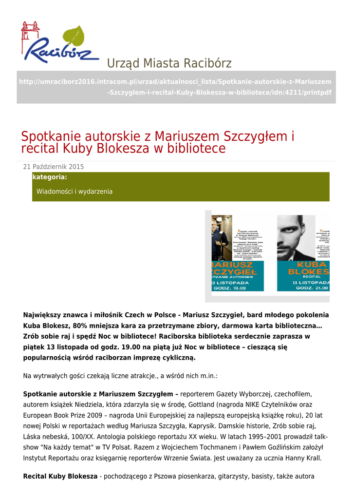 Urząd Miasta Racibórz http://umraciborz2016.intracom.pl/urzad/aktualnosci_lista/Spotkanie-autorskie-z-Mariuszem -Szczyglem-i-recital-Kuby-Blokesza-w-bibliotece/idn:4211/printpdf Spotkanie autorskie z Mariuszem Szczygłem i recital Kuby Blokesza w bibliotece 21 Październik 2015 kategoria: Wiadomości i wydarzenia Największy znawca i miłośnik Czech w Polsce - Mariusz Szczygieł, bard młodego pokolenia Kuba Blokesz, 80% mniejsza kara za przetrzymane zbiory, darmowa karta biblioteczna… Zrób sobie raj i spędź Noc w bibliotece! Raciborska biblioteka serdecznie zaprasza w piątek 13 listopada od godz. 19.00 na piątą już Noc w bibliotece – cieszącą się popularnością wśród raciborzan imprezę cykliczną. Na wytrwałych gości czekają liczne atrakcje., a wśród nich m.in.: Spotkanie autorskie z Mariuszem Szczygłem – reporterem Gazety Wyborczej, czechofilem, autorem książek Niedziela, która zdarzyła się w środę, Gottland (nagroda NIKE Czytelników oraz European Book Prize 2009 – nagroda Unii Europejskiej za najlepszą europejską książkę roku), 20 lat nowej Polski w reportażach według Mariusza Szczygła, Kaprysik. Damskie historie, Zrób sobie raj, Láska nebeská, 100/XX. Antologia polskiego reportażu XX wieku. W latach 1995–2001 prowadził talkshow "Na każdy temat" w TV Polsat. Razem z Wojciechem Tochmanem i Pawłem Goźlińskim założył Instytut Reportażu oraz księgarnię reporterów Wrzenie Świata. Jest uważany za ucznia Hanny Krall. Recital Kuby Blokesza - pochodzącego z Pszowa piosenkarza, gitarzysty, basisty, także autora tekstów i kompozytora; Blokesz to artysta, który siłą swojego głosu porywa słuchaczy w świat poezji i muzyki. Zdobywca nagród i wyróżnień na wielu festiwalach piosenki w całej Polsce (m.in. Studenckiego Festiwalu Piosenki w Krakowie, Pamiętajmy o Osieckiej w Warszawie). Występował u boku takich znakomitych artystów jak Grzegorz Turnau, Zbigniew Zamachowski, Piotr Bukartyk czy Artur Andrus. W 2015r. wydał debiutancki album "Lwów. Szkice miejskie". Płyta została nagrana z udziałem Piotra Machalicy, gościnnie można usłyszeć na niej również Joannę LewandowskąZbudniewek. Wszyscy, którzy zechcą się zapisać do biblioteki w trakcie imprezy, mogą liczyć na darmową kartę biblioteczną a kary zapominalskich zostaną zmniejszone o 80% (z wyjątkiem kosztów wysyłania upomnień). Nie zawiodą się także miłośnicy czeskiej literatury i kinematografii a także łowcy nowości książkowych, filmowych i muzycznych! Pamiętaj, jest taka noc kiedy biblioteka nie zasypia: Noc w bibliotece 13 listopada, godz. 19.00 Biblioteka, ul. Kasprowicza 12