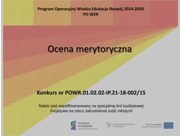 Program Operacyjny Wiedza Edukacja Rozwój 2014-2020 PO WER Ocena merytoryczna Konkurs nr POWR.01.02.02-IP.21-18-002/15 Nabór jest współfinansowany ze specjalnej linii budżetowej Inicjatywa na rzecz zatrudnienia ludzi młodych Ocena merytoryczna projektu obejmuje sprawdzenie, czy projekt spełnia: a) ogólne kryteria horyzontalne, b) ogólne kryteria merytoryczne, c) kryteria premiujące. Ocena jest dokonywana przez dwóch członków Komisji Oceny Projektów (KOP) wybranych w drodze losowania. Oceny merytorycznej dokonuje się przy pomocy karty oceny merytorycznej wniosku o dofinansowanie projektu konkursowego w ramach PO WER (załącznik nr 6.1.6 do Regulaminu konkursu). KRYTERIA HORYZONTALNE: 1) zgodnośd z właściwymi politykami i zasadami wspólnotowymi (w tym: polityką równych szans i koncepcją zrównoważonego rozwoju) oraz prawodawstwem wspólnotowym, 2) zgodnośd z prawodawstwem krajowym, 3) zgodnośd z właściwym celem szczegółowym POWER, 4) zgodnośd z Szczegółowym Opisem Osi Priorytetowych POWER. KRYTERIA MERYTORYCZNE: 3.1 Adekwatnośd doboru i opisu wskaźników realizacji projektu (w tym wskaźników dotyczących właściwego celu szczegółowego PO WER) oraz sposobu ich pomiaru. • lista wskaźników - wybranie wszystkich adekwatnych wskaźników z listy wskaźników określonych w PO WER, • w jaki sposób i na jakiej podstawie mierzone będą poszczególne wskaźniki realizacji celu projektu (źródła danych, sposobu pomiaru), 3.2 Adekwatnośd doboru grupy docelowej do właściwego celu szczegółowego PO WER oraz jakości diagnozy specyfiki tej grupy. • opis grupy docelowej (projekt jest skierowany do grupy kwalifikującej się do otrzymania wsparcia), • uzasadnienie wyboru grupy docelowej, z uwzględnieniem jej specyfiki (cechy, potrzeby, oczekiwania, bariery) oraz celu głównego projektu, opis powinien świadczyd o znajomości grupy docelowej projektu i możliwości efektywnego wsparcia tej grupy poprzez planowane działania, • rekrutacja - kryteria, techniki i metody rekrutacji dostosowane do grupy odbiorców oraz charakteru projektu (z uwzględnieniem sytuacji kobiet i mężczyzn). KRYTERIA MERYTORYCZNE: 3.3 Trafnośd opisanej analizy ryzyka nie osiągnięcia założeo projektu. • diagnoza sytuacji, których wystąpienie utrudni lub uniemożliwi osiągnięcie wartości docelowej wskaźników rezultatu, • sposób identyfikacji wystąpienia takich sytuacji (zajścia ryzyka); • działania, które zostaną podjęte, aby zapobiec wystąpieniu ryzyka/minimalizowad skutki wystąpienia ryzyka, 4.1 Spójnośd zadao przewidzianych do realizacji w ramach projektu oraz trafnośd doboru i opisu tych zadao. • uzasadnienie potrzeby realizacji zadao , • planowany sposób realizacji zadao, • dobór instrumentów i planowanych działao do zidentyfikowanych w PO WER problemów, specyficznych potrzeb grupy docelowej, obszaru na jakim realizowany jest projekt oraz innych warunków i ograniczeo, • adekwatne przyporządkowanie wartości wskaźników, które zostaną osiągnięte w ramach poszczególnych zadao. KRYTERIA MERYTORYCZNE: 4.3 Zaangażowanie potencjału wnioskodawcy i partnerów (o ile dotyczy). • potencjał kadrowy i sposób jego wykorzystania w ramach projektu , • potencjał techniczny, w tym sprzęt i warunki lokalowe oraz sposób jego wykorzystania w ramach projektu, • zasoby finansowe, jakie wnioskodawca wniesie do projektu. 4.4 Adekwatnośd opisu potencjału społecznego wnioskodawcy i partnerów (o ile dotyczy) do zakresu realizacji projektu. • • uzasadnienie dlaczego doświadczenie wnioskodawcy jest adekwatne do zakresu realizacji projektu, z uwzględnieniem dotychczasowej działalności prowadzonej : • w obszarze wsparcia projektu, • na rzecz grupy docelowej, do której skierowany będzie projekt oraz • na określonym terytorium, którego będzie dotyczyd realizacja projektu, wskazanie instytucji, które mogą potwierdzid wskazany potencjał społeczny. KRYTERIA MERYTORYCZNE: 4.5 Adekwatnośd sposobu zarządzania projektem do zakresu zadao w projekcie. • sposób zarządzania projektem, • podział ról i zadao w zespole zarządzającym , • sposób podejmowania decyzji w projekcie, • kadra zaangażowana w realizację projektu (zakres zadao, doświadczenie zawodowe, najważniejsze kwalifikacje). V. Prawidłowośd sporządzenia budżetu projektu. • kwalifikowalnośd wydatków, • niezbędnośd wydatków do realizacji projektu i osiągania jego celów, • racjonalnośd i efektywnośd wydatków projektu, • poprawnośd uzasadnienia wydatków w ramach kwot ryczałtowych (o ile dotyczy), • zgodnośd z cenami rynkowymi określonymi w regulaminie konkursu. KRYTERIA MERYTORYCZNE: • ocena spełniania kryteriów merytorycznych dokonywana jest w skali punktowej od 0 do 100 punktów , • spełnienie przez projekt kryteriów merytorycznych w minimalnym zakresie oznacza uzyskanie od każdego z obydwu oceniających co najmniej 60% punktów za spełnienie poszczególnych kryteriów. KRYTERIA PREMIUJĄCE: 1. Minimum 50% uczestników projektu stanowią osoby niepełnosprawne (typ projektów: 1-6 ). Waga punktowa: 10 2. Projekt skierowany jest wyłącznie do osób młodych w przedziale wiekowym 15-24 lata (typ projektów: 1-6 ). Waga punktowa: 5 3. Projektodawca lub Partner na dzieo złożenia wniosku posiada co najmniej roczne doświadczenie w prowadzeniu działalności w obszarze aktywizacji zawodowej osób młodych do 29 roku życia (typ projektów: 1-6 ). Waga punktowa: 5 4. Każde szkolenie realizowane samodzielnie bądź w połączeniu z praktyką zawodową/stażem/zatrudnieniem subsydiowanym jest dostosowane do potrzeb konkretnego pracodawcy, który zaoferuje zatrudnienie uczestnikom po zakooczeniu udziału w projekcie (typ projektów: 2, 3). Waga punktowa: 15 5. Projekt zapewnia wykorzystanie rezultatów PIW EQUAL i/lub rozwiązao wypracowanych w projektach innowacyjnych PO KL (typ projektów: 1-6) Waga punktowa: 5