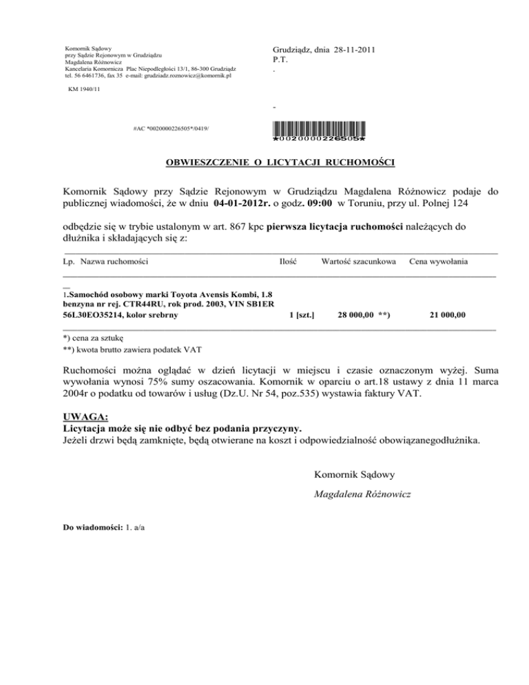 Komornik Sądowy przy Sądzie Rejonowym w Grudziądzu Magdalena Różnowicz Kancelaria Komornicza Plac Niepodległości 13/1, 86-300 Grudziądz tel. 56 6461736, fax 35 e-mail: [email protected] Grudziądz, dnia 28-11-2011 P.T. . KM 1940/11 #AC *0020000226505*/0419/ *0020000226505* OBWIESZCZENIE O LICYTACJI RUCHOMOŚCI Komornik Sądowy przy Sądzie Rejonowym w Grudziądzu Magdalena Różnowicz podaje do publicznej wiadomości, że w dniu 04-01-2012r. o godz. 09:00 w Toruniu, przy ul. Polnej 124 odbędzie się w trybie ustalonym w art. 867 kpc pierwsza licytacja ruchomości należących do dłużnika i składających się z: _______________________________________________________________________________________________________________________ Lp. Nazwa ruchomości Ilość Wartość szacunkowa Cena wywołania _______________________________________________________________________________________________________________________ __ 1.Samochód osobowy marki Toyota Avensis Kombi, 1.8 benzyna nr rej. CTR44RU, rok prod. 2003, VIN SB1ER 56L30EO35214, kolor srebrny 1 [szt.] 28 000,00 **) 21 000,00 _______________________________________________________________________________________________________________________ *) cena za sztukę **) kwota brutto zawiera podatek VAT Ruchomości można oglądać w dzień licytacji w miejscu i czasie oznaczonym wyżej. Suma wywołania wynosi 75% sumy oszacowania. Komornik w oparciu o art.18 ustawy z dnia 11 marca 2004r o podatku od towarów i usług (Dz.U. Nr 54, poz.535) wystawia faktury VAT. UWAGA: Licytacja może się nie odbyć bez podania przyczyny. Jeżeli drzwi będą zamknięte, będą otwierane na koszt i odpowiedzialność obowiązanegodłużnika. Komornik Sądowy Magdalena Różnowicz Do wiadomości: 1. a/a