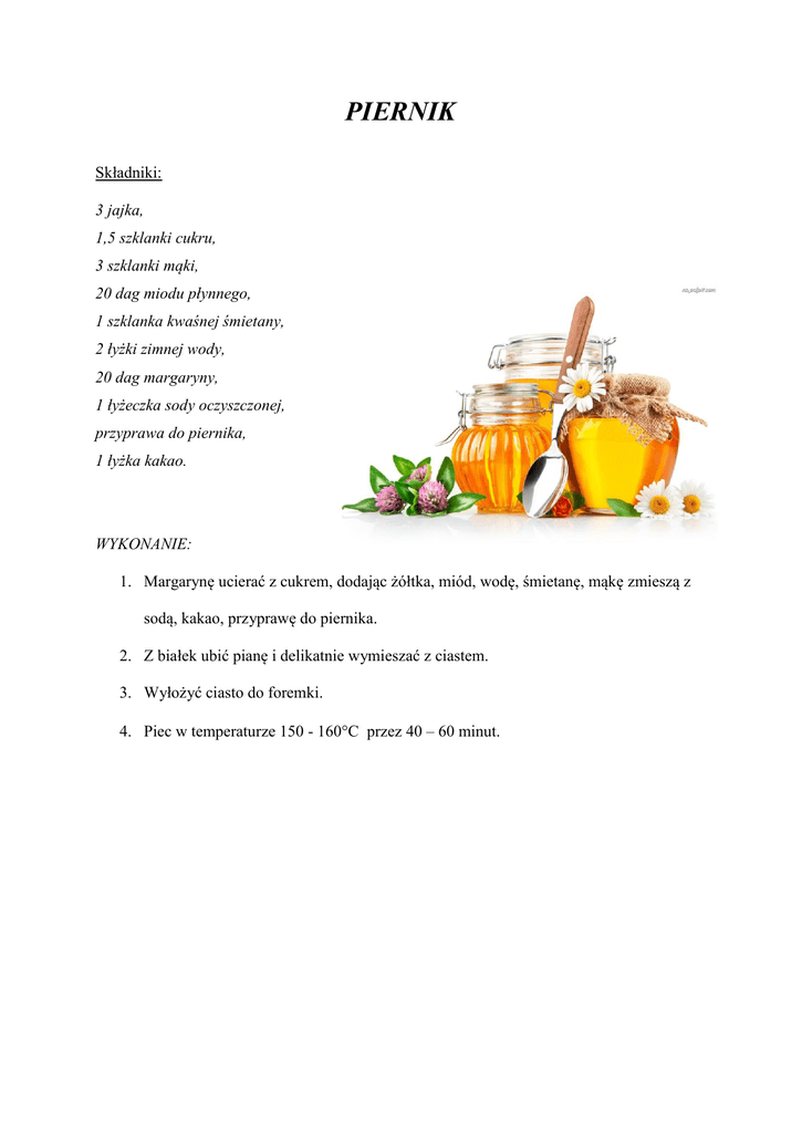 PIERNIK Składniki: 3 jajka, 1,5 szklanki cukru, 3 szklanki mąki, 20 dag miodu płynnego, 1 szklanka kwaśnej śmietany, 2 łyżki zimnej wody, 20 dag margaryny, 1 łyżeczka sody oczyszczonej, przyprawa do piernika, 1 łyżka kakao. WYKONANIE: 1. Margarynę ucierać z cukrem, dodając żółtka, miód, wodę, śmietanę, mąkę zmieszą z sodą, kakao, przyprawę do piernika. 2. Z białek ubić pianę i delikatnie wymieszać z ciastem. 3. Wyłożyć ciasto do foremki. 4. Piec w temperaturze 150 - 160C przez 40 – 60 minut.