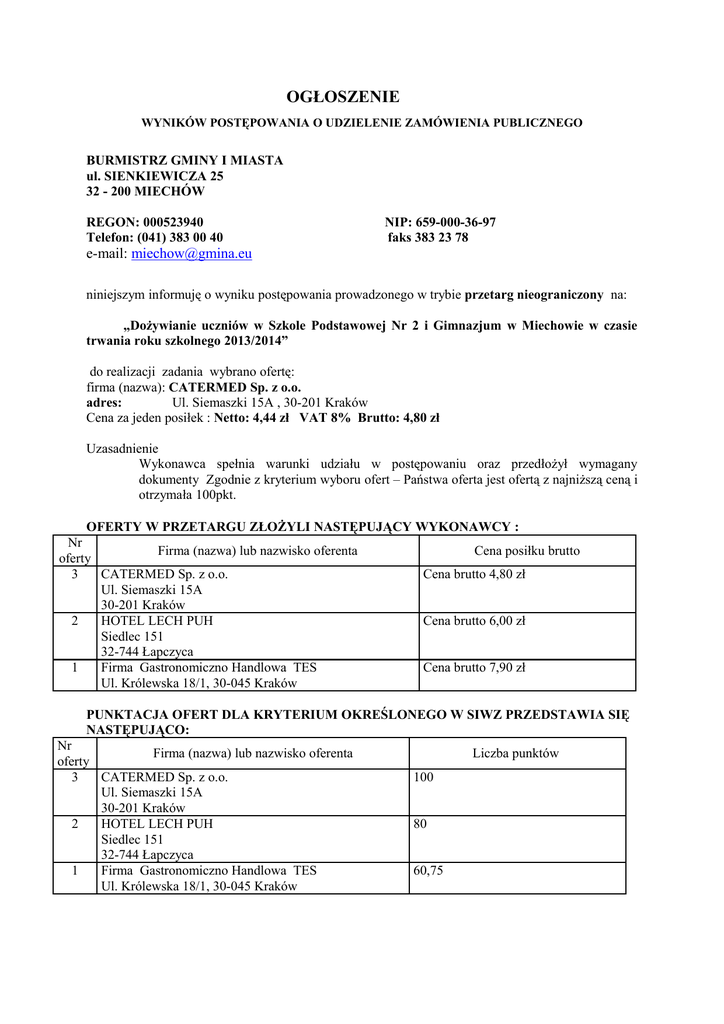 OGŁOSZENIE WYNIKÓW POSTĘPOWANIA O UDZIELENIE ZAMÓWIENIA PUBLICZNEGO BURMISTRZ GMINY I MIASTA ul. SIENKIEWICZA 25 32 - 200 MIECHÓW REGON: 000523940 Telefon: (041) 383 00 40 NIP: 659-000-36-97 faks 383 23 78 e-mail: [email protected] niniejszym informuję o wyniku postępowania prowadzonego w trybie przetarg nieograniczony na: „Dożywianie uczniów w Szkole Podstawowej Nr 2 i Gimnazjum w Miechowie w czasie trwania roku szkolnego 2013/2014” do realizacji zadania wybrano ofertę: firma (nazwa): CATERMED Sp. z o.o. adres: Ul. Siemaszki 15A , 30-201 Kraków Cena za jeden posiłek : Netto: 4,44 zł VAT 8% Brutto: 4,80 zł Uzasadnienie Wykonawca spełnia warunki udziału w postępowaniu oraz przedłożył wymagany dokumenty Zgodnie z kryterium wyboru ofert – Państwa oferta jest ofertą z najniższą ceną i otrzymała 100pkt. OFERTY W PRZETARGU ZŁOŻYLI NASTĘPUJĄCY WYKONAWCY : Nr Firma (nazwa) lub nazwisko oferenta Cena posiłku brutto oferty 3 CATERMED Sp. z o.o. Cena brutto 4,80 zł Ul. Siemaszki 15A 30-201 Kraków 2 HOTEL LECH PUH Cena brutto 6,00 zł Siedlec 151 32-744 Łapczyca 1 Firma Gastronomiczno Handlowa TES Cena brutto 7,90 zł Ul. Królewska 18/1, 30-045 Kraków PUNKTACJA OFERT DLA KRYTERIUM OKREŚLONEGO W SIWZ PRZEDSTAWIA SIĘ NASTĘPUJĄCO: Nr Firma (nazwa) lub nazwisko oferenta oferty 3 CATERMED Sp. z o.o. Ul. Siemaszki 15A 30-201 Kraków 2 HOTEL LECH PUH Siedlec 151 32-744 Łapczyca 1 Firma Gastronomiczno Handlowa TES Ul. Królewska 18/1, 30-045 Kraków Liczba punktów 100 80 60,75
