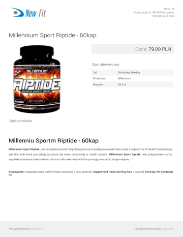 New-Fit Kościuszki 2, 36-200 Brzozów +48 889 334 038 Millennium Sport Riptide - 60kap Cena: 79,00 PLN Opis słownikowy Cel Dla kobiet, Rzeźba Producent Millennium Wysyłka Od 5 zł Opis produktu Millenniu Sportm Riptide - 60kap Millennium Sport Riptide jest kompleksową formułą która pomoże w pozbyciu sie nadmiaru wody z organizmu. Produkt Przeznaczony jest dla osób które potrzebują pozbycia się wody podskórnej w szybki sposób. Millennium Sport Riptide jest połączeniem osmiu wyselekcjonowanych ekstraktów ziół oraz mikroelementów które pomogą uwydatnić twoje mięśnie. Stosowanie:1 kapsułke popić 240ml wody, stosować 3 razy dziennie. Supplement Facts Serving Size 1 capsule Servings Per Container 60 Plik wygenerowano: 08-03-2017 Powered by TCPDF (www.tcpdf.org) Oprogramowanie sklepu: AptusShop