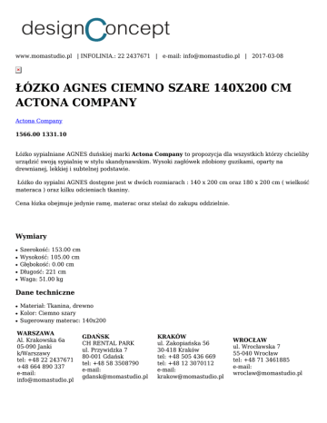 www.momastudio.pl | INFOLINIA.: 22 2437671 | e-mail: [email protected] | 2017-03-08 ŁÓZKO AGNES CIEMNO SZARE 140X200 CM ACTONA COMPANY Actona Company 1566.00 1331.10 Łóżko sypialniane AGNES duńskiej marki Actona Company to propozycja dla wszystkich którzy chcieliby urządzić swoją sypialnię w stylu skandynawskim. Wysoki zagłówek zdobiony guzikami, oparty na drewnianej, lekkiej i subtelnej podstawie. Łóżko do sypialni AGNES dostępne jest w dwóch rozmiarach : 140 x 200 cm oraz 180 x 200 cm ( wielkość materaca ) oraz kilku odcieniach tkaniny. Cena łózka obejmuje jedynie ramę, materac oraz stelaż do zakupu oddzielnie. Wymiary ● ● ● ● ● Szerokość: 153.00 cm Wysokość: 105.00 cm Głębokość: 0.00 cm Długość: 221 cm Waga: 51.00 kg Dane techniczne ● ● ● Materiał: Tkanina, drewno Kolor: Ciemno szary Sugerowany materac: 140x200 WARSZAWA Al. Krakowska 6a 05-090 Janki k/Warszawy tel: +48 22 2437671 +48 664 890 337 e-mail: [email protected] GDAŃSK CH RENTAL PARK ul. Przywidzka 7 80-001 Gdańsk tel: +48 58 3508790 e-mail: [email protected] KRAKÓW ul. Zakopiańska 56 30-418 Kraków tel: +48 505 436 669 tel: +48 12 3070112 e-mail: [email protected] WROCŁAW ul. Wrocławska 7 55-040 Wrocław tel: +48 71 3461885 e-mail: [email protected]