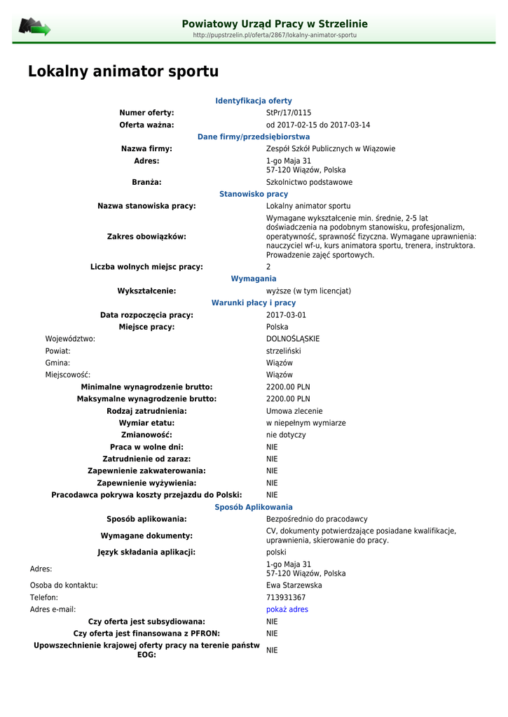 Powiatowy Urząd Pracy w Strzelinie http://pupstrzelin.pl/oferta/2867/lokalny-animator-sportu Lokalny animator sportu Identyfikacja oferty Numer oferty: StPr/17/0115 Oferta ważna: od 2017-02-15 do 2017-03-14 Dane firmy/przedsiębiorstwa Nazwa firmy: Zespół Szkół Publicznych w Wiązowie Adres: 1-go Maja 31 57-120 Wiązów, Polska Branża: Szkolnictwo podstawowe Stanowisko pracy Nazwa stanowiska pracy: Lokalny animator sportu Wymagane wykształcenie min. średnie, 2-5 lat doświadczenia na podobnym stanowisku, profesjonalizm, operatywność, sprawność fizyczna. Wymagane uprawnienia: nauczyciel wf-u, kurs animatora sportu, trenera, instruktora. Prowadzenie zajęć sportowych. Zakres obowiązków: Liczba wolnych miejsc pracy: 2 Wymagania Wykształcenie: wyższe (w tym licencjat) Warunki płacy i pracy Data rozpoczęcia pracy: 2017-03-01 Miejsce pracy: Polska Województwo: DOLNOŚLĄSKIE Powiat: strzeliński Gmina: Wiązów Miejscowość: Wiązów Minimalne wynagrodzenie brutto: 2200.00 PLN Maksymalne wynagrodzenie brutto: 2200.00 PLN Rodzaj zatrudnienia: Umowa zlecenie Wymiar etatu: w niepełnym wymiarze Zmianowość: nie dotyczy Praca w wolne dni: NIE Zatrudnienie od zaraz: NIE Zapewnienie zakwaterowania: NIE Zapewnienie wyżywienia: NIE Pracodawca pokrywa koszty przejazdu do Polski: NIE Sposób Aplikowania Sposób aplikowania: Wymagane dokumenty: Język składania aplikacji: Bezpośrednio do pracodawcy CV, dokumenty potwierdzające posiadane kwalifikacje, uprawnienia, skierowanie do pracy. polski Adres: 1-go Maja 31 57-120 Wiązów, Polska Osoba do kontaktu: Ewa Starzewska Telefon: 713931367 Adres e-mail: pokaż adres Czy oferta jest subsydiowana: NIE Czy oferta jest finansowana z PFRON: NIE Upowszechnienie krajowej oferty pracy na terenie państw NIE EOG: