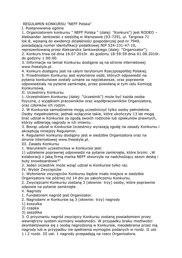 REGULAMIN KONKURSU "NEFF Polska" I. Postanowienia ogólne 1. Organizatorem konkursu " NEFF Polska " (dalej: "Konkurs") jest RODEO – Aleksander Jankowski z siedzibą w Warszawie (03-729), ul. Targowa 71 lok.8, wpisaną do ewidencji działalności gospodarczej pod nr 7949, posiadającą numer identyfikacji podatkowej NIP 524-231-47-10, reprezentowaną przez Aleksandra Jankowskiego (dalej: "Organizator"). 2. Konkurs trwa od dnia 16.07.2010r. do godziny 18:59:59 dnia 01.08.2010r. do godziny 1:00:00. 3. Informacje na temat Konkursu dostępne są na stronie internetowej www.freestyle.pl. 4. Konkurs dostępny jest na całym terytorium Rzeczpospolitej Polskiej. 5. Przedmiotem Konkursu jest wyłonienie osób, których odpowiedzi na pytania konkursowe zostały uznane za najciekawsze, oraz poprawnie odpowiedziały na pytanie zamknięte, przez powołaną w tym celu Komisję Konkursową. II. Uczestnicy Konkursu 1. Uczestnikiem Konkursu (dalej: "Uczestnik") może być każda osoba fizyczna, z wyjątkiem pracowników oraz współpracowników Organizatora, oraz członków ich rodzin. 2. W Konkursie samodzielnie mogą uczestniczyć tylko osoby pełnoletnie. Osoby niepełnoletnie, jednak wyłącznie takie, które ukończyły 13 lat mogą brać udział w Konkursie za zgodą swoich rodziców lub opiekunów prawnych, którzy odbierają nagrody w ich imieniu. 3. Biorąc udział w Konkursie Uczestnicy wyrażają zgodę na zasady Konkursu i akceptują niniejszy Regulamin. 4. Regulamin konkursu dostępny jest w siedzibie Organizatora oraz na stronie internetowej www.freestyle.pl. III. Zasady Konkursu 1. Warunkiem uczestnictwa w Konkursie jest: 1) udzielenie poprawnej odpowiedzi na pytanie zamknięte, które brzmi: „W kolaboracji z jaką firmą marka NEFF stworzyła na nadchodzący sezon deskę i buty snowboardowe?” 2. Jeden Uczestnik może wziąć udział w Konkursie tylko raz. IV. Wybór Zwycięzców 1. Wyłonienie zwycięzców Konkursu będzie miało miejsce w siedzibie Organizatora nie później niż 14 dni po zakończeniu Konkursu. 2. Zwycięzcami Konkursu zostaną 3 (słownie: trzy) osoby, które poprawnie odpowie na pytanie zamknięte. V. Nagrody 1. Fundatorem nagród jest Organizator. 2. Nagrodami w Konkursie są 3 (słownie: trzy) nagrody 1) koszulka 2) czapka 3) saszetka 3. O przyznaniu nagród zwycięzcy Konkursu zostaną powiadomieni przez wewnętrzny system wymiany wiadomości. W przypadku braku możliwości skontaktowania się z osobą nagrodzoną w Konkursie, nieodebrania przez nią nagrody lub w przypadku nie spełnienia wymogów podanych w rozdz. II ust. 1 i 2 rozdz. III ust. 1 nagrody przepadają na rzecz Organizatora. 4. Warunkiem uzyskania prawa do nagrody jest przesłanie przez zwycięzcę Konkursu danych, umożliwiających jego identyfikację obejmujących: jego imię, nazwisko, adres zamieszkania na terytorium RP. 5. Dane, o których mowa powyżej, zwycięzca przesyła na adres [email protected] w terminie do 14.08.2010 r. godzina 23:59.59. 6. Nagrody nie podlegają zamianie na inną nagrodę lub na jej równowartość pieniężną. 7. Zwycięzca nie może przenieść praw do przyznanej mu nagrody na osoby trzecie. Zwycięzca ma prawo zrzec się prawa do przyznanej mu nagrody składając Organizatorowi stosowne oświadczenie na piśmie. 8. Nagrody zostaną przesłane zwycięzcom Konkursu przez Organizatora Pocztą Polską lub pocztą kurierską na wskazane przez adresy. Zwycięzca Konkursu jest zobowiązany podpisać dokumenty stwierdzające odbiór nagród. 9. W wypadku, gdy zwycięzcą Konkursu zostanie osoba niepełnoletnia, nagroda wydana zostanie do rąk rodziców lub opiekunów. 10. Zwycięzca Konkursu traci prawo do nagrody, bez jakichkolwiek roszczeń lub żądań wobec Organizatora, jeżeli przekazane przez niego dane osobowe okażą się błędne lub nieprawdziwe. 11. Organizator nie ponosi odpowiedzialności za wady fizyczne przyznanych nagród. Wszelkie roszczenia z tytułu wskazanych wad należy kierować do ich producentów. VI. Dane osobowe 1. Administratorem danych osobowych zbieranych i przetwarzanych w ramach Konkursu jest Organizator. 2. Organizator uprawniony jest do przetwarzania danych osobowych uczestników Konkursu jedynie w zakresie niezbędnym dla realizacji Konkursu, w szczególności w celu przekazania nagród zwycięzcom Konkursu. Po zakończeniu Konkursu dane osobowe będą anonimizowane poza przypadkami określonymi w przepisach prawa. 3. Uczestnicy Konkursu wyrażają zgodę na zamieszczenie ich imienia i nazwiska oraz miejsca zamieszkania lub nicka w serwisie www.freestyle.pl w przypadku, gdy zostaną oni zwycięzcami Konkursu. Zamieszczenie tych danych nastąpi w ciągu pięciu dni od dnia wyboru zwycięzców Konkursu. 4. Na podstawie bezwzględnie obowiązujących przepisów o ochronie danych osobowych Uczestnicy mają prawo wglądu do swoich danych osobowych, ich poprawiania oraz zgłoszenia żądania zaprzestania ich przetwarzania. Prawo to może być wykonywane poprzez przesłanie odpowiedniego wniosku w formie pisemnej na adres: Freestyle.pl, ul. Targowa 71 lok. 8, 03-729 Warszawa. 5. Uczestnik Konkursu jest zobowiązany niezwłocznie powiadomić Organizatora o zmianie adresu lub innych podanych przez siebie danych. 6. Organizator nie ponosi odpowiedzialności za podanie przez Uczestnika niewłaściwego adresu, lub innych danych uniemożliwiających jego identyfikację. VII. Reklamacje 1. Prawo do składania reklamacji, w zakresie niezgodności przeprowadzenia Konkursu z Regulaminem, służy każdemu Uczestnikowi w ciągu 7 dni od daty wyłonienia zwycięzców Konkursu. 2. Reklamacja dopuszczalna jest w formie pisemnej zastrzeżonej pod rygorem nieważności skierowanej na adres do korespondencji Organizatora. Freestyle.pl, ul. Targowa 71 lok. 8, 03-729 Warszawa. 3. Reklamacja zostanie rozpatrzona przez Organizatora w ciągu 14 dni od otrzymania. Powiadomienie o rozstrzygnięciu nastąpi pocztą, na adres podany przez Uczestnika, składającego r