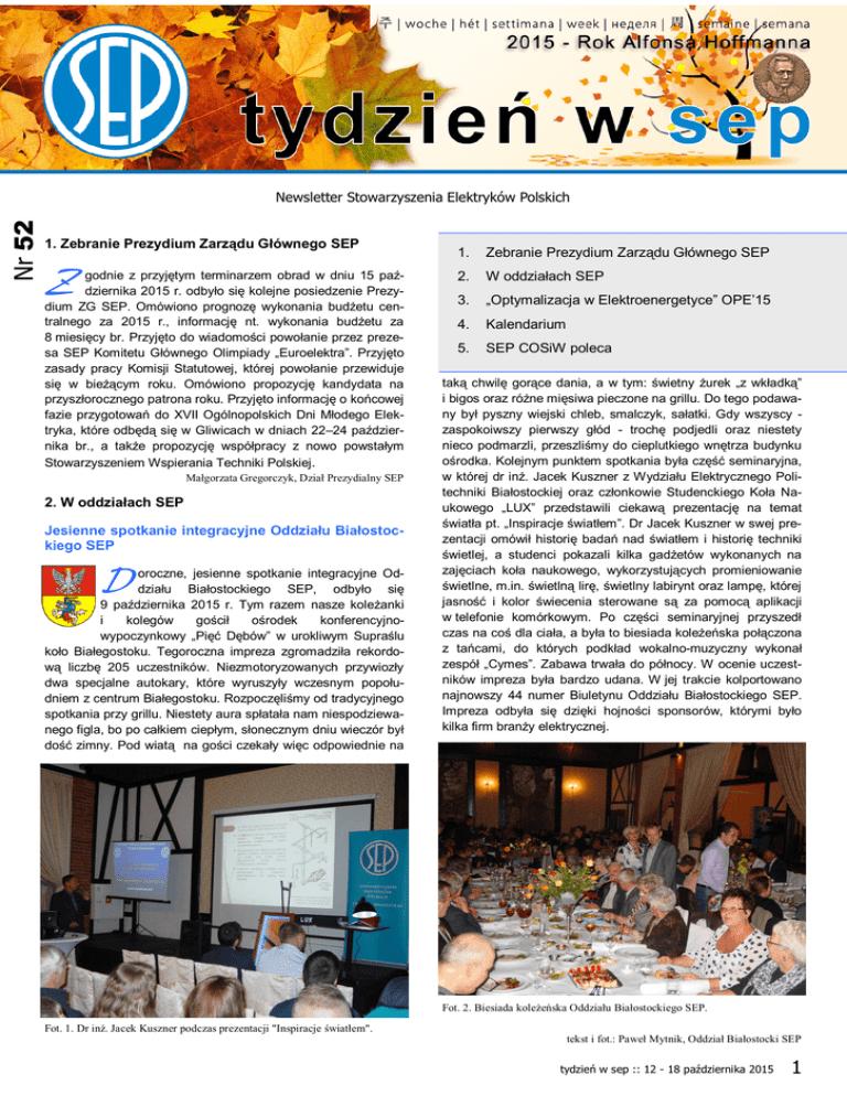 Nr 52 Newsletter Stowarzyszenia Elektryków Polskich 1. Zebranie Prezydium Zarządu Głównego SEP Z godnie z przyjętym terminarzem obrad w dniu 15 października 2015 r. odbyło się kolejne posiedzenie Prezydium ZG SEP. Omówiono prognozę wykonania budżetu centralnego za 2015 r., informację nt. wykonania budżetu za 8 miesięcy br. Przyjęto do wiadomości powołanie przez prezesa SEP Komitetu Głównego Olimpiady „Euroelektra”. Przyjęto zasady pracy Komisji Statutowej, której powołanie przewiduje się w bieżącym roku. Omówiono propozycję kandydata na przyszłorocznego patrona roku. Przyjęto informację o końcowej fazie przygotowań do XVII Ogólnopolskich Dni Młodego Elektryka, które odbędą się w Gliwicach w dniach 22–24 października br., a także propozycję współpracy z nowo powstałym Stowarzyszeniem Wspierania Techniki Polskiej . Małgorzata Gregorczyk, Dział Prezydialny SEP 2. W oddziałach SEP Jesienne spotkanie integracyjne Oddziału Białostockiego SEP D oroczne, jesienne spotkanie integracyjne Oddziału Białostockiego SEP, odbyło się 9 października 2015 r. Tym razem nasze koleżanki i kolegów gościł ośrodek konferencyjnowypoczynkowy „Pięć Dębów” w urokliwym Supraślu koło Białegostoku. Tegoroczna impreza zgromadziła rekordową liczbę 205 uczestników. Niezmotoryzowanych przywiozły dwa specjalne autokary, które wyruszyły wczesnym popołudniem z centrum Białegostoku. Rozpoczęliśmy od tradycyjnego spotkania przy grillu. Niestety aura spłatała nam niespodziewanego figla, bo po całkiem ciepłym, słonecznym dniu wieczór był dość zimny. Pod wiatą na gości czekały więc odpowiednie na 1. Zebranie Prezydium Zarządu Głównego SEP 2. W oddziałach SEP 3. „Optymalizacja w Elektroenergetyce” OPE’15 4. Kalendarium 5. SEP COSiW poleca taką chwilę gorące dania, a w tym: świetny żurek „z wkładką” i bigos oraz różne mięsiwa pieczone na grillu. Do tego podawany był pyszny wiejski chleb, smalczyk, sałatki. Gdy wszyscy zaspokoiwszy pierwszy głód - trochę podjedli oraz niestety nieco podmarzli, przeszliśmy do cieplutkiego wnętrza budynku ośrodka. Kolejnym punktem spotkania była część seminaryjna, w której dr inż. Jacek Kuszner z Wydziału Elektrycznego Politechniki Białostockiej oraz członkowie Studenckiego Koła Naukowego „LUX” przedstawili ciekawą prezentację na temat światła pt. „Inspiracje światłem”. Dr Jacek Kuszner w swej prezentacji omówił historię badań nad światłem i historię techniki świetlej, a studenci pokazali kilka gadżetów wykonanych na zajęciach koła naukowego, wykorzystujących promieniowanie świetlne, m.in. świetlną lirę, świetlny labirynt oraz lampę, której jasność i kolor świecenia sterowane są za pomocą aplikacji w telefonie komórkowym. Po części seminaryjnej przyszedł czas na coś dla ciała, a była to biesiada koleżeńska połączona z tańcami, do których podkład wokalno-muzyczny wykonał zespół „Cymes”. Zabawa trwała do północy. W ocenie uczestników impreza była bardzo udana. W jej trakcie kolportowano najnowszy 44 numer Biuletynu Oddziału Białostockiego SEP. Impreza odbyła się dzięki hojności sponsorów, którymi było kilka firm branży elektrycznej. Fot. 2. Biesiada koleżeńska Oddziału Białostockiego SEP. Fot. 1. Dr inż. Jacek Kuszner podczas prezentacji "Inspiracje światłem". tekst i fot.: Paweł Mytnik, Oddział Białostocki SEP tydzień w sep :: 12 - 18 października 2015 1 Nr 52 Newsletter Stowarzyszenia Elektryków Polskich Spotkanie komisji kwalifikacyjnych Oddziału Krakowskiego SEP O ddział Krakowski SEP w dniach 9-10 października 2015 r. zorganizował doroczne Seminarium wyjazdowe oddziałowych komisji kwalifikacyjnych, z udziałem ponad 40 uczestników. W trakcie Seminarium dokonano podsumowania prac komisji w Oddziale, omówiono sprawy nadzoru nad dokumentami egzaminacyjnymi oraz wygłoszono i przedyskutowano trzy referaty, w tym na temat rozwoju OZE. W drugim dniu uczestnicy mieli możliwość zwiedzenia Ryneczku w Lanckoronie. Fot. 3. Uczestnicy Seminarium. Miłym akcentem spotkania było uroczyste pożegnanie egzaminatorów seniorów: kol. Władysława Baracza i kol. Józefa Marciniaka, którzy po kilkudziesięciu latach zakończyli pracę w KK. Spotkanie wyjazdowe egzaminatorów krakowskich było udaną imprezą szkoleniowo-integracyjną, zorganizowaną przez kol. Krzysztofa Ebro-Prokesza i kol. Marię Zastawny. energetycznej. Uprawnienia monterów instalacji fotowoltaicznej. Prawo i praktyka”, odbyło się 6 października 2015 r. Wykład wygłosił mgr inż. Henryk Klein z firmy OPA-LABOR Sp. z o.o. w Siemianowicach Śląskich. Wykład cieszył się dużym zainteresowaniem. Wzięło w nim udział 81 osób. Barbara Adamczewska, Biuro OZW SEP 3. Konferencja ,,Optymalizacja w Elektroenergetyce” – OPE’15 S iedziba PSE SA w Konstancinie-Jeziornie 7 października 2015 r. była miejscem IX Konferencji NaukowoTechnicznej ,,Optymalizacja w Elektroenergetyce” OPE’15. Organizatorem Konferencji była Sekcja Energetyki Oddziału Warszawskiego SEP. W Konferencji wzięło udział około 80 uczestników z różnych firm (głównie z PSE SA), placówek naukowo-badawczych energetyki, wyższych uczelni technicznych i SEP - zwłaszcza członków Koła SEP nr 229 przy PSE SA. Konferencja była sponsorowana przez 5 firm: PSE SA, HORUS -ENERGIA Sp. z o.o., ECOENERGIA Sp. z o.o., IFS Poland Sp. z o.o. oraz Zakład Doradztwa Bezpieczeństwa Pracy ,,ERGON”. Ich przedstawiciele również w kilkuminutowych wystąpieniach prezentowali własne firmy. Celem Konferencji była wymiana poglądów i doświadczeń w 5ciu grupach tematycznych, ukierunkowanych na poprawę efektywności energetycznej przy prowadzeniu ruchu, eksploatacji i rozwoju Krajowego Systemu Elektroenergetycznego (KSE), jak również przy użytkowaniu energii elektrycznej przez odbiorców. Na Konferencję zgłoszono 19 referatów, opub