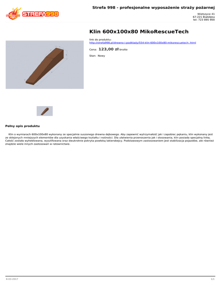 Strefa 998 - profesjonalne wyposażenie straży pożarnej Wietszyce 41 67-221 Białołęka tel: 723 895 900 Klin 600x100x80 MikoRescueTech link do produktu: http://strefa998.pl/drewno-i-podklady/554-klin-600x100x80-mikorescuetech-.html Cena: 123,00 zł brutto Stan: Nowy Pełny opis produktu Klin o wymiarach 600x100x80 wykonany ze specjalnie suszonego drewna dębowego. Aby zapewnić wytrzymałość jak i zapobiec pękaniu, klin wykonany jest ze sklejonych mniejszych elementów dla uzyskania właściwego kształtu i nośności. Dla ułatwienia przenoszenia jak i stosowania, klin posiada specjalną linkę. Całość została wyheblowana, wyszlifowana oraz dwukrotnie pokryta powłoką lakierobejcy. Podstawowym zastosowaniem jest stabilizacja pojazdów, ale również znajdzie wiele innych zastosowań w ratownictwie. 8-03-2017 1/1