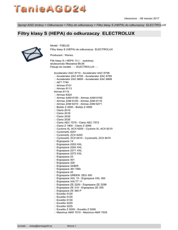 Utworzono : 08 marzec 2017 Sprzęt AGD drobny > Odkurzacze > Filtry do odkurzaczy > Filtry klasy S (HEPA) do odkurzaczy ELECTROLUX Filtry klasy S (HEPA) do odkurzaczy ELECTROLUX Model : FSEL02 Filtry klasy S (HEPA) do odkurzaczy ELECTROLUX Producent : Worwo Filtr klasy S ( HEPA 13 )� wylotowy skutecznośc filtowania 99,95 Pasuje do modeli��ELECTROLUX�; Accelerator AAC 6710 - Accelerator AAC 6758 �Accelerator ZAC 6705 - Accelerator ZAC 6790 �Accelerator ZAC 6805 - Accelerator ZAC 6858 �AET 7740 �Airmax 6101 �Airmax 6113 Airmax 6115 �Airmax 6324 �Airmax AAM 6100 - Airmax AAM 6160 �Airmax ZAM 6100 - Airmax ZAM 6116 �Airmax ZAM 6210 - Airmax ZAM 6271 �Bolido Z 4500 - Bolido Z 4595 �Clario 2015 �Clario 2018 �Clario 2035 �Clario 2035 �Clario AEC 7570 - Clario AEC 7572 �Clario Z 1900 - Clario Z 2095 �Cyclone XL ACX 6200 - Cyclone XL ACX 6210 �CycloneXL 6201 �CycloneXL ZCX 6200 �CycloneXL ZCX 6410 - CycloneXL ZCX 6470 �Ergospace 14 �Ergospace 2253 XXL �Ergospace 2254 XXL �Ergospace 2271 XXL �Ergospace 2272 XXL �Ergospace 23 �Ergospace 301 �Ergospace 320 �Ergospace 34/B/R �Ergospace 361 FBS �Ergospace 42 �Ergospace GREEN: ZEG 300 �Ergospace XXL 10 - Ergospace XXL 300 �Ergospace XXLTT 11 �Ergospace ZE 2200 - Ergospace ZE 2299 �Ergospace ZE 310 - Ergospace ZE 355 �Ergospace ZE 360 P �Excellio 5120 �Excellio 5125 �Excellio 5130 �Excellio 5220 �Excellio 5225 �Excellio Z 5000 - Excellio Z 5295 �Maximus AMX 7010 - Maximus AMX 7035 kontakt : - [email protected] Strona 1 Utworzono : 08 marzec 2017 Sprzęt AGD drobny > Odkurzacze > Filtry do odkurzaczy > Filtry klasy S (HEPA) do odkurzaczy ELECTROLUX Filtry klasy S (HEPA) do odkurzaczy ELECTROLUX �Oxy3system ZO 6300 - Oxy3system ZO 6399 �Oxygen + Z 7320 - Oxygen + Z 7399 �Oxygen 5510 �Oxygen 5515 �Oxygen 5525 �Oxygen 5528 �Oxygen 5530 �Oxygen 5535 �Oxygen 5542 �Oxygen 5631 �Oxygen 5634 �Oxygen Z 5500 - Oxygen Z 5695 �Oxygen Z 5900 - Oxygen Z 5995 �Oxygen+ 7335 �Oxygen+ AO 7335 �Praxio Z 6020 �Praxio Z 6025 �Praxio Z 6030 �Praxio Z 6035 �Praxio Z 6040 �Smartvac & Powersystem Z-1710 �Smartvac & Powersystem Z-1718 �Smartvac & Powersystem Z-1725 �Smartvac & Powersystem Z-1730 �Smartvac & Powersystem Z-1735 �Smartvac & Powersystem Z-1740 �Smartvac & Powersystem Z-1745 �Smartvac & Powersystem Z-1746 �Smartvac Z 5000 - Smartvac Z 5695 �Superpro Z 6160 �System Pro P 1 - System Pro P 999 �Twin Clean 8211 �Twin Clean 8225 �Twin Clean 8230 �Twin Clean 8232 �Twin Clean 8234 �Twin Clean 8240 �Twin Clean 8241 �Twin Clean 8263 �Twin Clean 8268 �Twin Clean 8270 �Twin Clean 8272 �Twin Clean 8277 �Twin Clean 8280 �Twin Clean ATC 8210/P �Twin Clean ATC 8220 �Twin Clean Z 8210 �Twin Clean Z 8230 �Twin Clean Z 8250 �Ultra Active 3801 �Ultra Active 3830P �Ultra Active 3840T �Ultra Active 3860 �Ultra Active AUA 3820 �Ultra Active Green: AUAG 3800 kontakt : - [email protected] Strona 2 Utworzono : 08 marzec 2017 Sprzęt AGD drobny > Odkurzacze > Filtry do odkurzaczy > Filtry klasy S (HEPA) do odkurzaczy ELECTROLUX Filtry klasy S (HEPA) do odkurzaczy ELECTROLUX �Ultra Active Green: AUSG 3900 �Ultra Active Green: AUSÖ 3000 �Ultra Active Green: ZUA 3810/P �Ultra Active Green: ZUA 3820 �Ultra Active Green: ZUAG 3800 �Ultra One AEL 8800 - Ultra One AEL 8899 �Ultra Silencer 3901 �Ultra Silencer 3925 �Ultra Silencer 3930 �Ultra Silencer 3940P �Ultra Silencer 3965P �Ultra Silencer 3970P �Ultra Silencer 3980P �Ultra Silencer 3990 �Ultra Silencer AUS 3930 �Ultra Silencer AUS 4030 - Ultra Silencer AUS 4045 �Ultra Silencer GREEN: ZUSG 3000 �Ultra Silencer GREEN: ZUSG 3900 �Ultra Silencer Z 3300 - Ultra Silencer Z 3395 �Ultra Silencer ZUS 3326 - Ultra Silencer ZUS 3396 �Ultra Silencer ZUS 3920 �Ultra Silencer ZUS 3960 �Viva Control AVC 1110 - Viva Control AVC 1190 �Viva Control AVC 1220 - Viva Control AVC 1230 �Viva Control ZV 1010 - Viva Control ZV 1050 �Viva Quick Stop ZVQ 2100 - Viva Quick Stop ZVQ 2105 �Viva Quickstop AVQ 2100 - Viva Quickstop AVQ 2141 Cena : 34,44 zł Brutto ( 28,00 zł Netto) Dostępność: Produkt dostępny w naszym sklepie od 28 grudzień 2011 kontakt : - [email protected] Strona 3