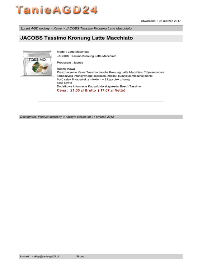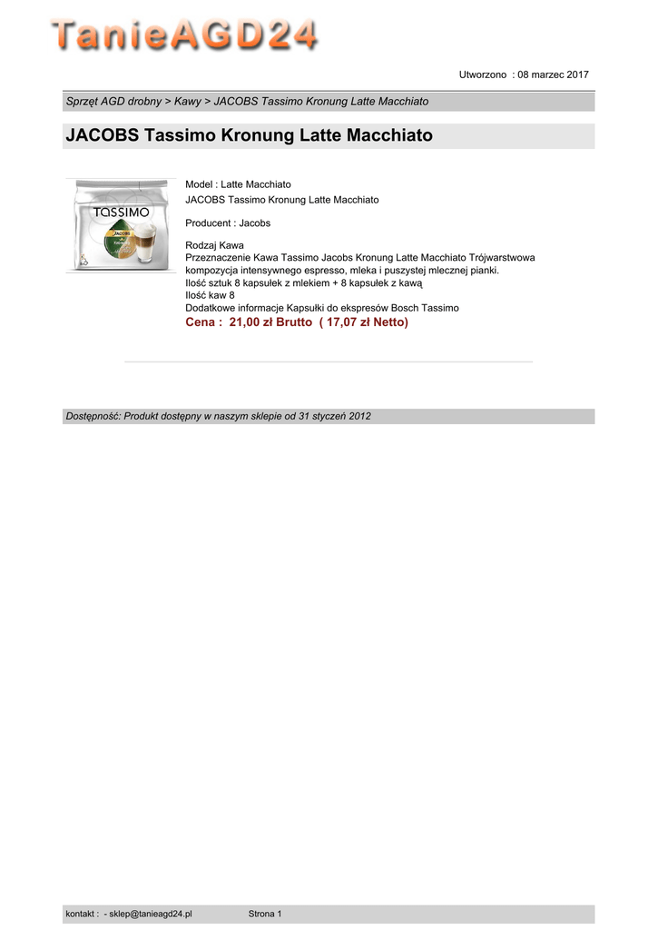 Utworzono : 08 marzec 2017 Sprzęt AGD drobny > Kawy > JACOBS Tassimo Kronung Latte Macchiato JACOBS Tassimo Kronung Latte Macchiato Model : Latte Macchiato JACOBS Tassimo Kronung Latte Macchiato Producent : Jacobs Rodzaj Kawa Przeznaczenie Kawa Tassimo Jacobs Kronung Latte Macchiato Trójwarstwowa kompozycja intensywnego espresso, mleka i puszystej mlecznej pianki. Ilość sztuk 8 kapsułek z mlekiem + 8 kapsułek z kawą Ilość kaw 8 Dodatkowe informacje Kapsułki do ekspresów Bosch Tassimo Cena : 21,00 zł Brutto ( 17,07 zł Netto) Dostępność: Produkt dostępny w naszym sklepie od 31 styczeń 2012 kontakt : - [email protected] Strona 1