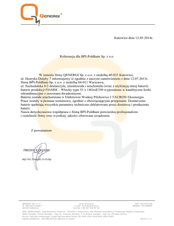 Katowice dnia 12.05.2014r. Referencja dla BPI-Poldham Sp. z o.o. W imieniu firmy QENERGI Sp. z o.o. z siedzibą 40-833 Katowice, ul. Henryka Dulęby 7 informujemy iż zgodnie z naszym zamówieniem z dnia 12.07.2013r. firma BPI-Poldham Sp. z o.o. z siedzibą 04-011 Warszawa, ul. Suchodolska 8/2 dostarczyła, zmontowała i uruchomiła (wraz z utylizacją starej baterii) baterie produkcji FIAMM – Włochy typu 53 x 14GroE350 wyposażone w katalityczne korki rekombinacyjne z zaworami dwudrożnymi. Bateria została uruchomiona w Elektrowni Wodnej Pilchowice I TAURON Ekoenergia. Prace zostały wykonane terminowo, zgodnie z obowiązującymi przepisami. Dostarczone baterie spełniają wszystkie parametry techniczne deklarowane przez dostawcę i producenta baterii. Nasza dotychczasowa współpraca z firmą BPI-Poldham potwierdza profesjonalizm i rzetelność firmy oraz wysokiej jakości oferowane urządzenia. Z poważaniem QENERGI Sp. z o.o. Ul. Henryka Dulęby 7 40-833 Katowice www.qenergi.pl e-mail: [email protected] tel./fax +48 32/ 355 87 04 NIP: 6321974766 REGON: 241208969 KRS: 0000333266 – Sąd Rejonowy Katowice - Wschód w Katowicach, VIII Wydział Gospodarczy Krajowego Rejestru Sądowego Skład Zarządu: Prezes Zarządu - mgr inż. Ireneusz Goleśny, V-ce Prezes Zarządu - mgr inż. Mirosław Wrona Numer rachunku bankowego: Credit Agricole Bank Polska 50 1940 1076 3070 6831 0000 0000 Kapitał zakładowy: 100.000,00 PLN opłacony w całości Strona 1 z 1
