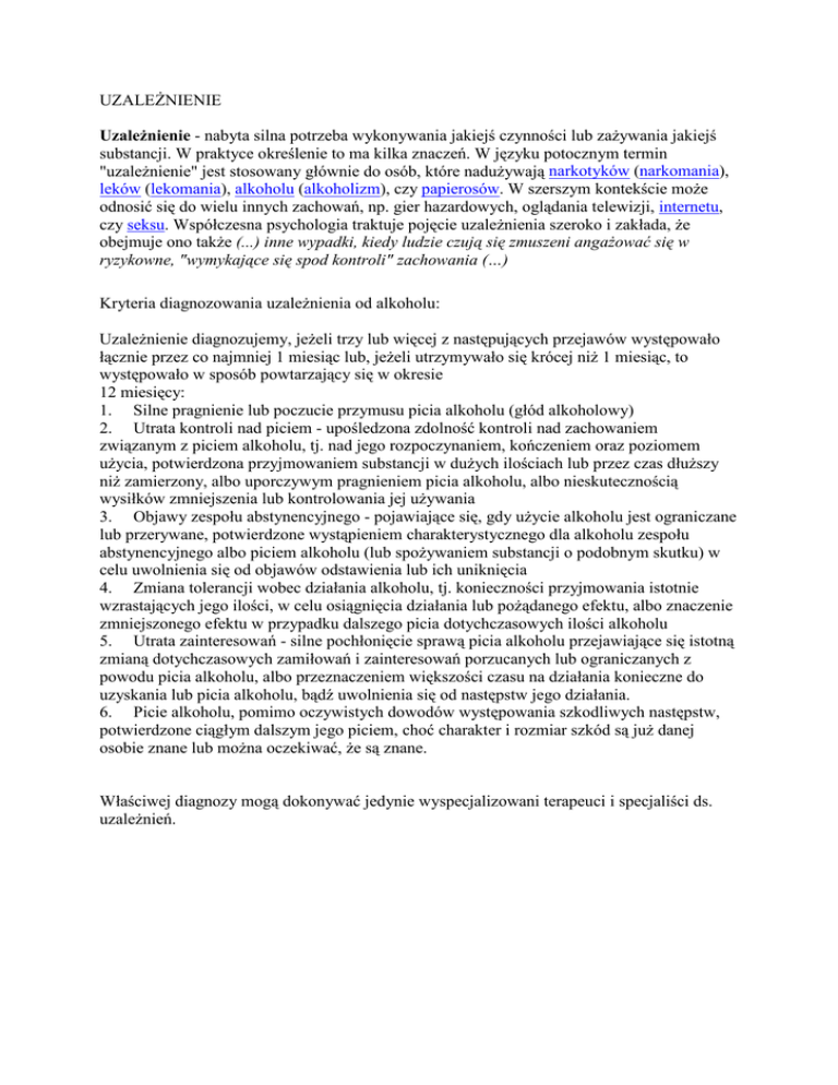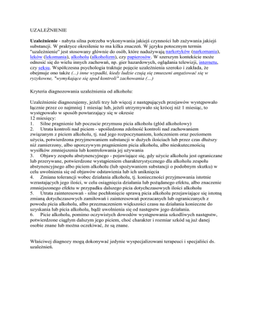 UZALEŻNIENIE Uzależnienie - nabyta silna potrzeba wykonywania jakiejś czynności lub zażywania jakiejś substancji. W praktyce określenie to ma kilka znaczeń. W języku potocznym termin "uzależnienie" jest stosowany głównie do osób, które nadużywają narkotyków (narkomania), leków (lekomania), alkoholu (alkoholizm), czy papierosów. W szerszym kontekście może odnosić się do wielu innych zachowań, np. gier hazardowych, oglądania telewizji, internetu, czy seksu. Współczesna psychologia traktuje pojęcie uzależnienia szeroko i zakłada, że obejmuje ono także (...) inne wypadki, kiedy ludzie czują się zmuszeni angażować się w ryzykowne, "wymykające się spod kontroli" zachowania (…) Kryteria diagnozowania uzależnienia od alkoholu: Uzależnienie diagnozujemy, jeżeli trzy lub więcej z następujących przejawów występowało łącznie przez co najmniej 1 miesiąc lub, jeżeli utrzymywało się krócej niż 1 miesiąc, to występowało w sposób powtarzający się w okresie 12 miesięcy: 1. Silne pragnienie lub poczucie przymusu picia alkoholu (głód alkoholowy) 2. Utrata kontroli nad piciem - upośledzona zdolność kontroli nad zachowaniem związanym z piciem alkoholu, tj. nad jego rozpoczynaniem, kończeniem oraz poziomem użycia, potwierdzona przyjmowaniem substancji w dużych ilościach lub przez czas dłuższy niż zamierzony, albo uporczywym pragnieniem picia alkoholu, albo nieskutecznością wysiłków zmniejszenia lub kontrolowania jej używania 3. Objawy zespołu abstynencyjnego - pojawiające się, gdy użycie alkoholu jest ograniczane lub przerywane, potwierdzone wystąpieniem charakterystycznego dla alkoholu zespołu abstynencyjnego albo piciem alkoholu (lub spożywaniem substancji o podobnym skutku) w celu uwolnienia się od objawów odstawienia lub ich uniknięcia 4. Zmiana tolerancji wobec działania alkoholu, tj. konieczności przyjmowania istotnie wzrastających jego ilości, w celu osiągnięcia działania lub pożądanego efektu, albo znaczenie zmniejszonego efektu w przypadku dalszego picia dotychczasowych ilości alkoholu 5. Utrata zainteresowań - silne pochłonięcie sprawą picia alkoholu przejawiające się istotną zmianą dotychczasowych zamiłowań i zainteresowań porzucanych lub ograniczanych z powodu picia alkoholu, albo przeznaczeniem większości czasu na działania konieczne do uzyskania lub picia alkoholu, bądź uwolnienia się od następstw jego działania. 6. Picie alkoholu, pomimo oczywistych dowodów występowania szkodliwych następstw, potwierdzone ciągłym dalszym jego piciem, choć charakter i rozmiar szkód są już danej osobie znane lub można oczekiwać, że są znane. Właściwej diagnozy mogą dokonywać jedynie wyspecjalizowani terapeuci i specjaliści ds. uzależnień.