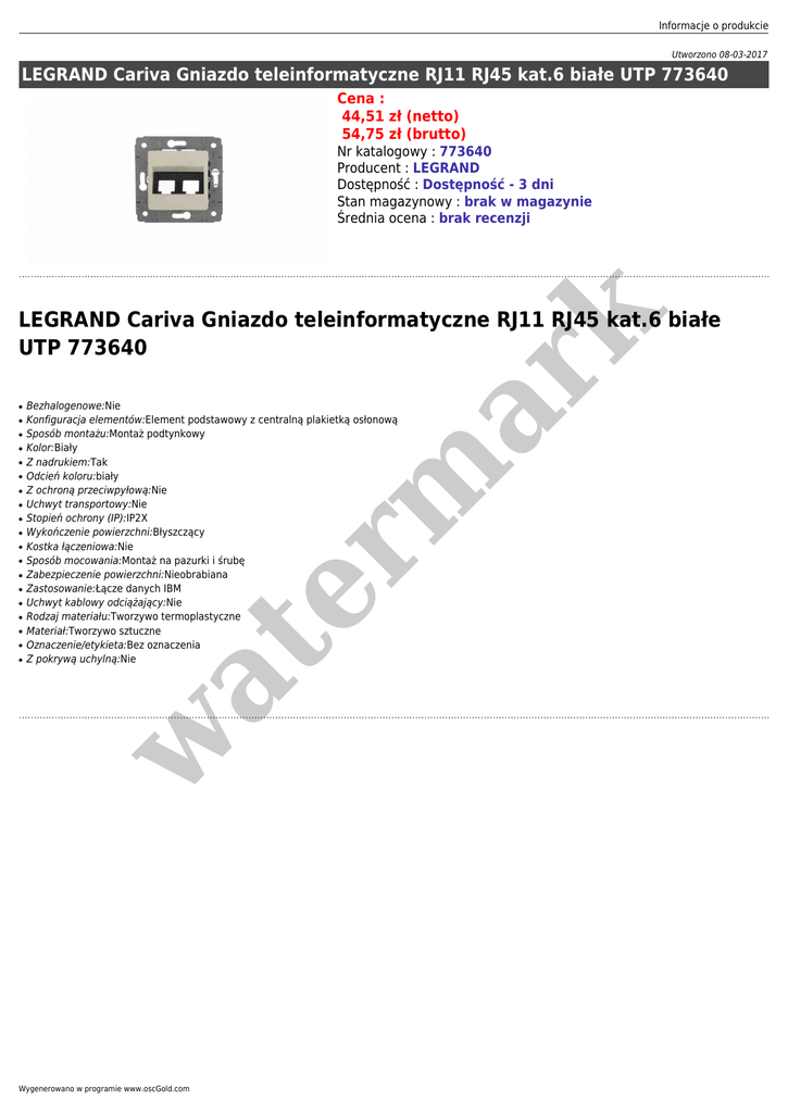 Informacje o produkcie Utworzono 08-03-2017 LEGRAND Cariva Gniazdo teleinformatyczne RJ11 RJ45 kat.6 białe UTP 773640 Cena : 44,51 zł (netto) 54,75 zł (brutto) Nr katalogowy : 773640 Producent : LEGRAND Dostępność : Dostępność - 3 dni Stan magazynowy : brak w magazynie Średnia ocena : brak recenzji ● ● ● ● ● ● ● ● ● ● ● ● ● ● ● ● ● w ● Bezhalogenowe:Nie Konfiguracja elementów:Element podstawowy z centralną plakietką osłonową Sposób montażu:Montaż podtynkowy Kolor:Biały Z nadrukiem:Tak Odcień koloru:biały Z ochroną przeciwpyłową:Nie Uchwyt transportowy:Nie Stopień ochrony (IP):IP2X Wykończenie powierzchni:Błyszczący Kostka łączeniowa:Nie Sposób mocowania:Montaż na pazurki i śrubę Zabezpieczenie powierzchni:Nieobrabiana Zastosowanie:Łącze danych IBM Uchwyt kablowy odciążający:Nie Rodzaj materiału:Tworzywo termoplastyczne Materiał:Tworzywo sztuczne Oznaczenie/etykieta:Bez oznaczenia Z pokrywą uchylną:Nie at ● er m ar k LEGRAND Cariva Gniazdo teleinformatyczne RJ11 RJ45 kat.6 białe UTP 773640 Wygenerowano w programie www.oscGold.com