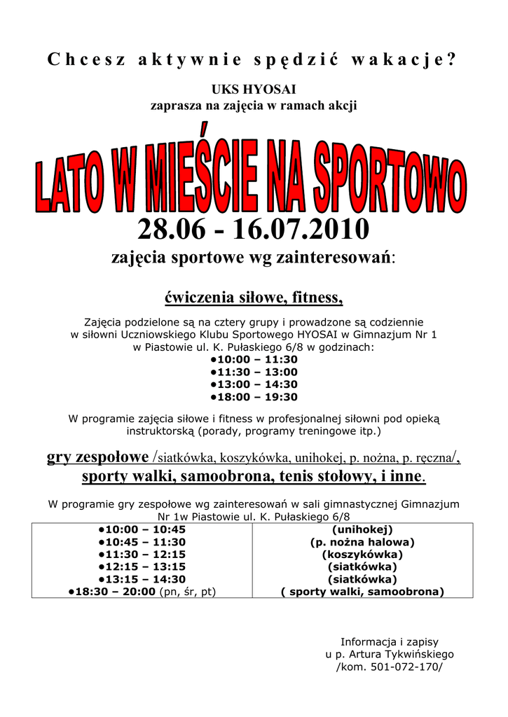 Chcesz aktywnie spędzić wakacje? UKS HYOSAI zaprasza na zajęcia w ramach akcji 28.06 - 16.07.2010 zajęcia sportowe wg zainteresowań: ćwiczenia siłowe, fitness, Zajęcia podzielone są na cztery grupy i prowadzone są codziennie w siłowni Uczniowskiego Klubu Sportowego HYOSAI w Gimnazjum Nr 1 w Piastowie ul. K. Pułaskiego 6/8 w godzinach: •10:00 – 11:30 •11:30 – 13:00 •13:00 – 14:30 •18:00 – 19:30 W programie zajęcia siłowe i fitness w profesjonalnej siłowni pod opieką instruktorską (porady, programy treningowe itp.) gry zespołowe /siatkówka, koszykówka, unihokej, p. nożna, p. ręczna/, sporty walki, samoobrona, tenis stołowy, i inne. W programie gry zespołowe wg zainteresowań w sali gimnastycznej Gimnazjum Nr 1w Piastowie ul. K. Pułaskiego 6/8 •10:00 – 10:45 (unihokej) •10:45 – 11:30 (p. nożna halowa) (koszykówka) •11:30 – 12:15 •12:15 – 13:15 (siatkówka) (siatkówka) •13:15 – 14:30 •18:30 – 20:00 (pn, śr, pt) ( sporty walki, samoobrona) Informacja i zapisy u p. Artura Tykwińskiego /kom. 501-072-170/
