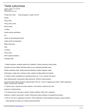 Tarta cytrynowa Dodano: 2000-01-01 00:00:00 Język: Polski Odwiedzono: 2522 razy. Porcja dla 6 osob. Czas przygotow. 5 godz. 40 min. Ciasto: 250 g maki, 100 g cukru pudru, 200 g masla, 2 zoltka, kropla esencji waniliowej, sol, maslo do nasmarowania formy, cukier puder do posypania. Masa cytrynowa: 9 jaj, 4 cytryny, 375 g cukru, 300 ml gestej smietany, szczypta maki. 1. Maslo posiekac, wyrabiac palcami do miekkosci. Dodac przesiany cukier puder, szczypte soli oraz zoltka. Wyrabiac dalej, az do uzyskania jednolitej masy. Dodac przesiana make, krople esencji waniliowej i szybko zagniesc ciasto. Uformawac z niego kule, zawinac w folie, wstawic na kilka godzin do lodowki. 2. Gotowe ciasto rozwalkowac na placek grubosci ok. 4 mm i wylozyc nim spod i boki natluszczonej i oproszonej maka tortownicy. Wierzch ciasta przykryc aluminiowa folia i lekko obciazyc ziarnami fasoli. Piec ok. 10 min w nagrzanej do temp. 180żC piekarniku. Wyjac i usunac folie. Ostudzic. 3. Cytryny umyc i wytrzec do sucha. Zetrzec z nich skorke, wycisnac sok. Sok polaczyc ze starta skorka. 4. W osobnej miscu ubic jaja z cukrem. Dodac smietane i lekko ubic, nastepnie polaczyc z sokiem cytrynowym i skorka. Otrzymana mase przelozyc na podpieczony placek. 5. Piec ok. 40 min w nagrzanym do temp. 170żC piekarniku. Przed podaniem posypac cukrem pudrem. - Tarta zyskuje na smaku po 2 dniach przechowywania. Wirtualna Kuchni@ Polska - http://kuchnia.now.pl przepis nr 4920, plik wygenerowano 2017.03.08 19:18 1z2 Źródło: Encyklopedia sztuki kulinarnej, tom 5 "Kuchnia francuska II", strona 78. From: [email protected] (Radku's De Apaczu's) Wirtualna Kuchni@ Polska - http://kuchnia.now.pl przepis nr 4920, plik wygenerowano 2017.03.08 19:18 2z2
