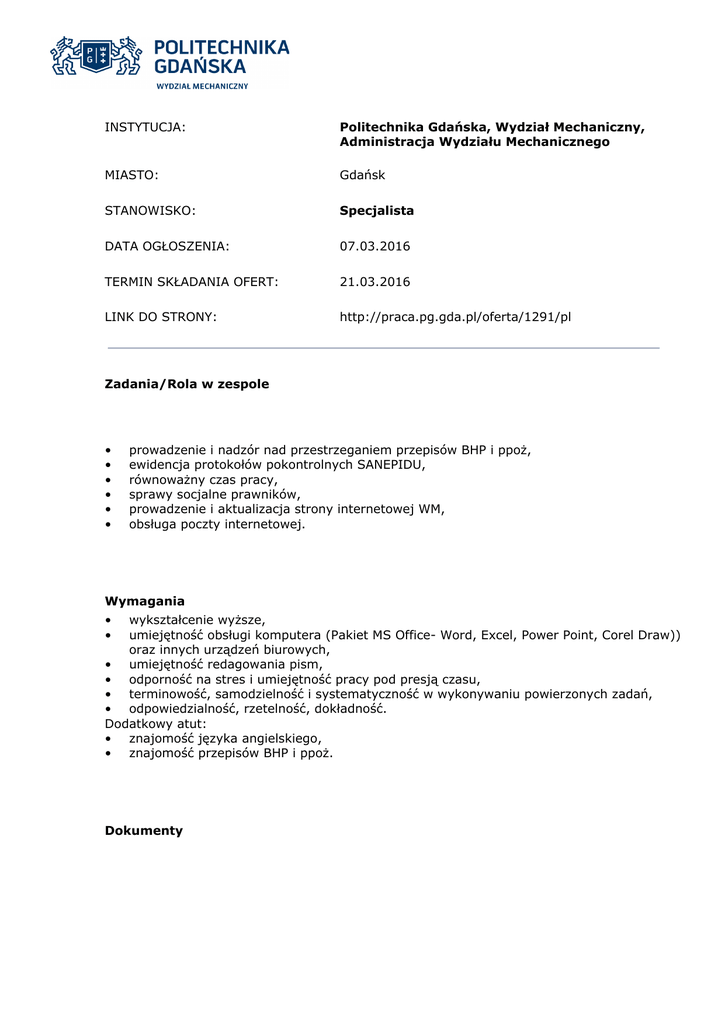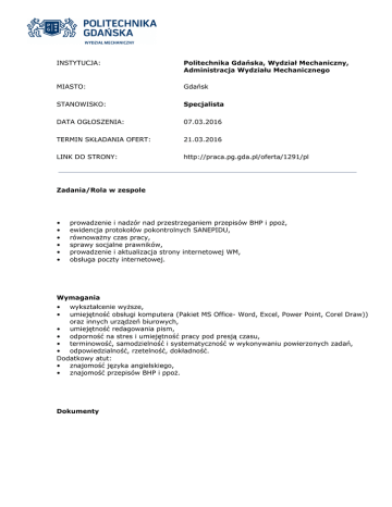 INSTYTUCJA: Politechnika Gdańska, Wydział Mechaniczny, Administracja Wydziału Mechanicznego MIASTO: Gdańsk STANOWISKO: Specjalista DATA OGŁOSZENIA: 07.03.2016 TERMIN SKŁADANIA OFERT: 21.03.2016 LINK DO STRONY: http://praca.pg.gda.pl/oferta/1291/pl Zadania/Rola w zespole • • • • • • prowadzenie i nadzór nad przestrzeganiem przepisów BHP i ppoż, ewidencja protokołów pokontrolnych SANEPIDU, równoważny czas pracy, sprawy socjalne prawników, prowadzenie i aktualizacja strony internetowej WM, obsługa poczty internetowej. Wymagania • • wykształcenie wyższe, umiejętność obsługi komputera (Pakiet MS Office- Word, Excel, Power Point, Corel Draw)) oraz innych urządzeń biurowych, • umiejętność redagowania pism, • odporność na stres i umiejętność pracy pod presją czasu, • terminowość, samodzielność i systematyczność w wykonywaniu powierzonych zadań, • odpowiedzialność, rzetelność, dokładność. Dodatkowy atut: • znajomość języka angielskiego, • znajomość przepisów BHP i ppoż. Dokumenty • • • • podanie w sprawie zatrudnienia kierowane do Kanclerza PG – mgr inż. Marka Tłoka; list motywacyjny; CV; dokumenty poświadczające wykształcenie i kwalifikacje zawodowe (kserokopie). TERMIN ROZSTRZYGNIĘCIA KONKURSU: 22.03.2016 PLANOWANY TERMIN ZATRUDNIENIA: 04.04.2016 Biuro Wydziału Mechanicznego pok. 310 w zaklejonej kopercie z dopiskiem”Konkurs na stanowisko specjalisty” lub przesłać na adres: Wydział Mechaniczny Politechniki Gdańskiej, ul. G. Narutowicza 11/12, 80-233 Gdańsk. Nie przyjmujemy ofert zgłaszanych drogą elektroniczną. Prosimy o umieszczenie klauzuli "Wyrażam zgodę na przetwarzanie danych osobowych zawartych w mojej ofercie dla potrzeb niezbędnych przy procesie rekrutacji (zgodnie z Ustawą z dnia 29.08.1997 o Ochronie Danych Osobowych Dz.Ust. nr 133 poz. 883)". Konkurs może zostać zamknięty bez wyłonienia kandydata. Skontaktujemy się z wybranymi osobami. Nadesłanych pocztą ofert nie odsyłamy. Zlecający zastrzegają sobie prawo do odpowiedzi jedynie na wybrane oferty.