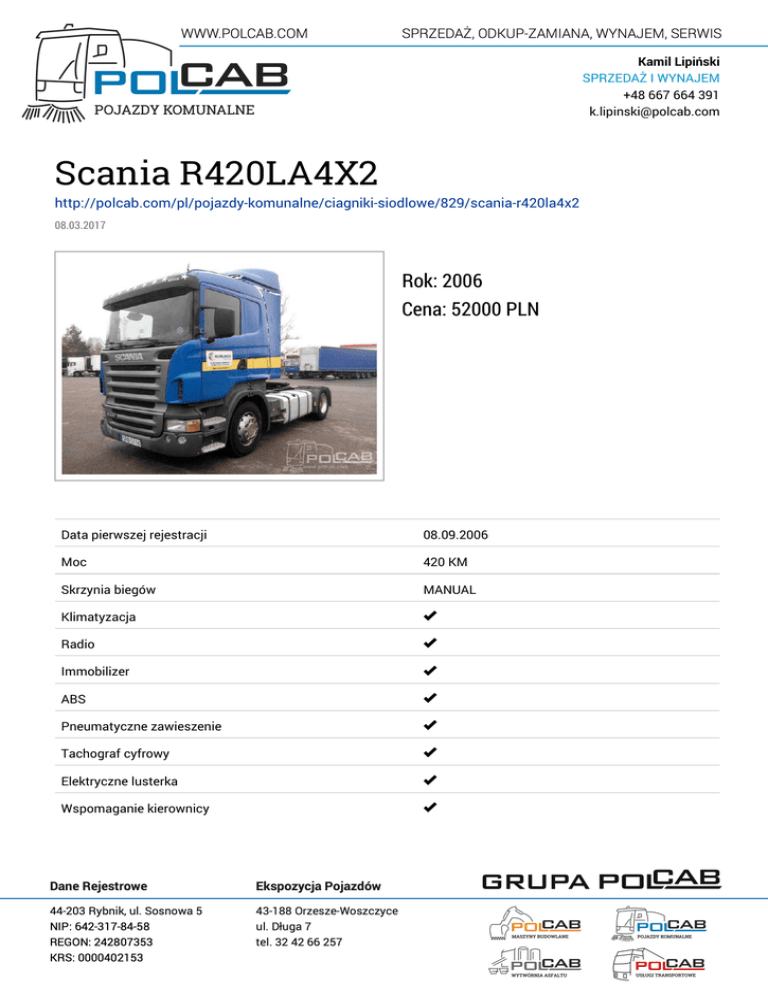 Kamil Lipiński SPRZEDAŻ I WYNAJEM +48 667 664 391 [email protected] Scania R420LA4X2 http://polcab.com/pl/pojazdy-komunalne/ciagniki-siodlowe/829/scania-r420la4x2 08.03.2017 Rok: 2006 Cena: 52000 PLN Data pierwszej rejestracji 08.09.2006 Moc 420 KM Skrzynia biegów MANUAL Klimatyzacja Radio Immobilizer ABS Pneumatyczne zawieszenie Tachograf cyfrowy Elektryczne lusterka Wspomaganie kierownicy Data pierwszej rejestracji 08.09.2006 Ogrzewanie postojowe Kabina sypialna Lodówka Tempomat Emisja spalin EURO 4 Komputer pokładowy Dodatkowe linie hydrauliczne Rozmiar opon przednich 315/70R22.5 Rozmiar opon tylnych 305/70R22.5 Napęd 4x2 Nośność osi tylnej 112,5 kN Rama stała Zaczep tylny Masa 7100 kg