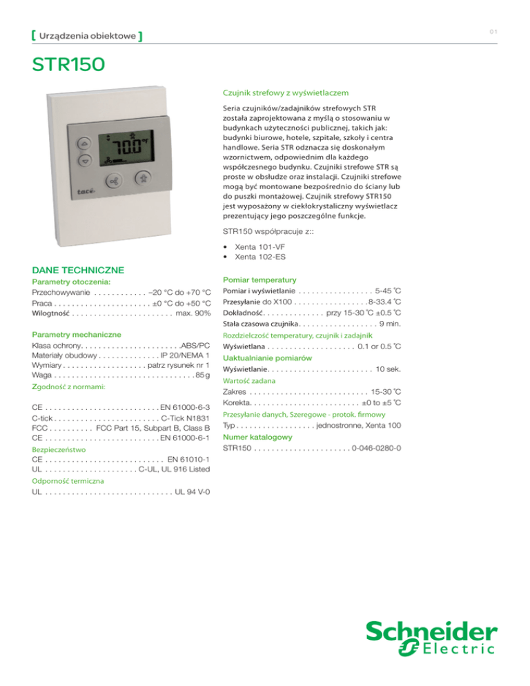 01 Urządzenia obiektowe STR150 Czujnik strefowy z wyświetlaczem Seria czujników/zadajników strefowych STR została zaprojektowana z myślą o stosowaniu w budynkach użyteczności publicznej, takich jak: budynki biurowe, hotele, szpitale, szkoły i centra handlowe. Seria STR odznacza się doskonałym wzornictwem, odpowiednim dla każdego współczesnego budynku. Czujniki strefowe STR są proste w obsłudze oraz instalacji. Czujniki strefowe mogą być montowane bezpośrednio do ściany lub do puszki montażowej. Czujnik strefowy STR150 jest wyposażony w ciekłokrystaliczny wyświetlacz prezentujący jego poszczególne funkcje. STR150 współpracuje z:: • Xenta 101-VF • Xenta 102-ES DANE TECHNICZNE Parametry otoczenia: Przechowywanie . . . . . . . . . . . . . –20 °C do +70 °C Praca. . . . . . . . . . . . . . . . . . . . . . . ±0 °C do +50 °C Wilogtność. . . . . . . . . . . . . . . . . . . . . . . . max. 90% Pomiar temperatury Pomiar i wyświetlanie . . . . . . . . . . . . . . . . . . 5-45 ˚C Przesyłanie do X100. . . . . . . . . . . . . . . . . 8-33.4 ˚C Dokładność. . . . . . . . . . . . . . . przy 15-30 ˚C ±0.5 ˚C Stała czasowa czujnika. . . . . . . . . . . . . . . . . . . 9 min. Parametry mechaniczne Klasa ochrony. . . . . . . . . . . . . . . . . . . . . . . ABS/PC Materiały obudowy. . . . . . . . . . . . . . IP 20/NEMA 1 Wymiary. . . . . . . . . . . . . . . . . . . patrz rysunek nr 1 Waga. . . . . . . . . . . . . . . . . . . . . . . . . . . . . . . . 85 g Rozdzielczość temperatury, czujnik i zadajnik Wyświetlana. . . . . . . . . . . . . . . . . . . . . 0.1 or 0.5 ˚C Zgodność z normami: CE. . . . . . . . . . . . . . . . . . . . . . . . . . EN 61000-6-3 C-tick. . . . . . . . . . . . . . . . . . . . . . . . . C-Tick N1831 FCC. . . . . . . . . . . FCC Part 15, Subpart B, Class B CE. . . . . . . . . . . . . . . . . . . . . . . . . . EN 61000-6-1 Bezpieczeństwo CE. . . . . . . . . . . . . . . . . . . . . . . . . . . . EN 61010-1 UL . . . . . . . . . . . . . . . . . . . . . C-UL, UL 916 Listed Odporność termiczna UL . . . . . . . . . . . . . . . . . . . . . . . . . . . . . . UL 94 V-0 Uaktualnianie pomiarów Wyświetlanie. . . . . . . . . . . . . . . . . . . . . . . . . 10 sek. Wartość zadana Zakres . . . . . . . . . . . . . . . . . . . . . . . . . . . . 15-30 ˚C Korekta. . . . . . . . . . . . . . . . . . . . . . . . . . ±0 to ±5 ˚C Przesyłanie danych, Szeregowe - protok. firmowy Typ. . . . . . . . . . . . . . . . . . . jednostronne, Xenta 100 Numer katalogowy STR150. . . . . . . . . . . . . . . . . . . . . . 0-046-0280-0 Urządzenia obiektowe 02 3 STR150 FUNKCJE WYMIARY mm (in) Zwiększanie Przycisk ten służy do zwiększania wartości zadanej temperatury. Zmniejszanie Przycisk ten służy do zmniejszania wartości zadanej temperatury. Jeżeli wyświetlana jest temperatura pomieszczenia i przycisk zostanie naciśnięty jeden raz, zostanie wyświetlona aktualna wartość zadana. Kolejne naciśnięcie spowoduje zmianę wartości. Przycisk “bypass” (Tryb Komfortu) Przycisk obejścia - “bypass” służy do zmiany trybu oczekiwania (ekonomicznego) lub nieobecności na tryb komfortu. Po uaktywnieniu trybu komfortu na wyświetlaczu pojawi się odpowiedni symbol. Kiedy czas trwania funkcji “bypass” zostanie przekroczony i jest podłączony sygnał zwrotny z Xenta 100, symbol powróci do poprzedniego stanu. Je¿eli sygnał nie jest podłączony, symbol powróci do stanu wyłączony po dwóch godzinach. Przycisk zmiany prędkości wentylatora • • Aktywacja/deaktywacja funkcji obejęcia “bypass”. Wybór wartości odniesienia temperatury “Reftemp”. Różnica pomiędzy wyświetlaną wartością zadaną a temperaturą odniesienia jest przesyłana do sterownika Xenta 100 jako korekta wartości zadanej. KONFIGURACJA Komunikacja Opcje konfiguracyjne Komunikacja pomiędzy STR150 i sterownikiem odbywa się tylko w kierunku od STR150 do Xenta 100. Dziêki niżej wymienionym opcjom konfiguracyjnym można dostosować moduł STR150 do własnych potrzeb: • • • • • • Wybór jednostek temperatury °C lub °F. Wybór domyślnie wyświetlane wielkości: temperatura pomieszczenia lub wartość zadana. Jeżeli wielkością domyślną jest temperatura, naciśnięcie przycisku zwiększanie/zmniejszanie przełączy na wyświetlanie wartości zadanej. Powrót do wyświetlania temperatury nastepuje ze zwłoką Zmiana wartości zwłoki. Zmiana ustawieñ dla wentylatora. Wybór rozdzielczości wyświetlanej temperatury i wartości zadanej. Wybór maksymalnego zakresu korety wartości zadanej. Podłączenia Do podłączenia STR150 stosuje się przewody dwu- lub trzyżyłowe (konieczne w przypadku sygnalizacji stanu pracy). Dzięki zastosowaniu połączeñ wtykowych instalacja jest bardzo prosta. Montaż STR150 mogą być montowane bezpośrednio do ściany lub do puszki montażowej. Konserwacja Urządzenia wymagają jedynie suchego miejsca oraz w razie potrzeby oczyszczenia suchą szmatką. Schneider Electric Buildings Polska Sp. z o.o. , ul. Rzymowskiego 53, 02-697 Warszawa, tel.: +48 22 313 24 10, fax: +48 22 313 24 11 www.schneider-electric.com/buildings 03-00103-03-en 2007 mf © 2009 Schneider Electric. Przycisk zmiany prędkości wentylatora służy do forsowania innego niż normalnego, automatycznego sterowania wentylatorem. W zależności od wybranej konfiguracji, użytkownik może wybrać różne tryby pracy. Naciśnięcie przycisku wywoła migający symbol na wyświetlaczu. Kolejne przyciskanie umożliwia przełączanie pomiędzy wybranymi trybami. 03 Urządzenia obiektowe STR150 STR106 1. Przycisk zwiększania. 2. Przycisk zmniejszania 3. Przycisk zmiany prędkości 4. Przycisk bypass (Tryb Konfortu). Wszystkie wymienione w dokumencie marki, znaki towarowe i zarejestrowane znaki towarowe są własnością odpowiednich firm i instytucji. Informacje zawarte w tym dokumencie mogą ulec zmianie bez uprzedniego powiadomienia. 1 października 2009