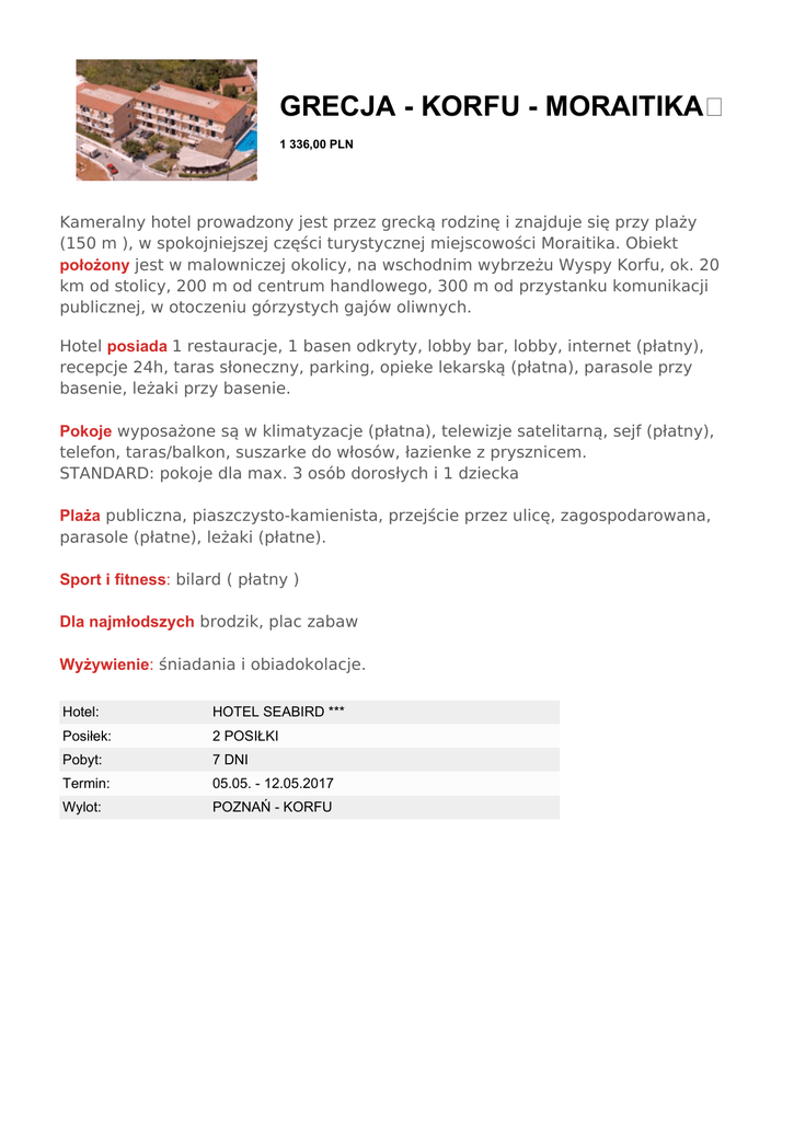 GRECJA - KORFU - MORAITIKA✈ 1 336,00 PLN Kameralny hotel prowadzony jest przez grecką rodzinę i znajduje się przy plaży (150 m ), w spokojniejszej części turystycznej miejscowości Moraitika. Obiekt położony jest w malowniczej okolicy, na wschodnim wybrzeżu Wyspy Korfu, ok. 20 km od stolicy, 200 m od centrum handlowego, 300 m od przystanku komunikacji publicznej, w otoczeniu górzystych gajów oliwnych. Hotel posiada 1 restauracje, 1 basen odkryty, lobby bar, lobby, internet (płatny), recepcje 24h, taras słoneczny, parking, opieke lekarską (płatna), parasole przy basenie, leżaki przy basenie. Pokoje wyposażone są w klimatyzacje (płatna), telewizje satelitarną, sejf (płatny), telefon, taras/balkon, suszarke do włosów, łazienke z prysznicem. STANDARD: pokoje dla max. 3 osób dorosłych i 1 dziecka Plaża publiczna, piaszczysto-kamienista, przejście przez ulicę, zagospodarowana, parasole (płatne), leżaki (płatne). Sport i fitness: bilard ( płatny ) Dla najmłodszych brodzik, plac zabaw Wyżywienie: śniadania i obiadokolacje. Hotel: HOTEL SEABIRD *** Posiłek: 2 POSIŁKI Pobyt: 7 DNI Termin: 05.05. - 12.05.2017 Wylot: POZNAŃ - KORFU