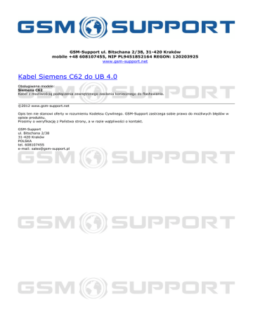 GSM-Support ul. Bitschana 2/38, 31-420 Kraków mobile +48 608107455, NIP PL9451852164 REGON: 120203925 www.gsm-support.net Kabel Siemens C62 do UB 4.0 Obsługiwane modele: Siemens C62 Kabel z możliwością podłączenia zewnętrznego zasilania koniecznego do flashowania. ©2012 www.gsm-support.net Opis ten nie stanowi oferty w rozumieniu Kodeksu Cywilnego. GSM-Support zastrzega sobie prawo do możliwych błędów w opisie produktu. Prosimy o weryfikację z Państwa strony, a w razie wątpliwości o kontakt. GSM-Support ul. Bitschana 2/38 31-420 Kraków POLSKA tel. 608107455 e-mail: [email protected] Powered by TCPDF (www.tcpdf.org)