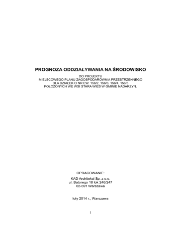 PROGNOZA ODDZIAŁYWANIA NA ŚRODOWISKO DO PROJEKTU MIEJSCOWEGO PLANU ZAGOSPODAROWNIA PRZESTRZENNEGO DLA DZIAŁEK O NR EW. 156/2, 156/3, 156/4, 156/5 POŁOśONYCH WE WSI STARA WIEŚ W GMINIE NADARZYN. OPRACOWANIE: KAD Architekci Sp. z o.o. ul. Batorego 18 lok 246/247 02-591 Warszawa luty 2014 r., Warszawa 1 SPIS TREŚCI 1.Wstęp........................................................................................................................................ 3 1.1. Podstawa opracowania......................................................................................................... 3 1.2. Cel i zakres opracowania...................................................................................................... 3 1.3. Materiały źródłowe................................................................................................................ 3 1.4. Metody zastosowane przy sporządzeniu prognozy...............................................................4 2. PołoŜenie................................................................................................................................. 4 2.1. PołoŜenie administracyjne analizowanego terenu i opis stanu istniejącego…………………4 2.2. PołoŜenie przyrodnicze......................................................................................................... 4 3. Charakterystyka głównych celów MPZP………………………………………………………... 4 3.1 Opis głównych celów projektowanego MPZP..........................................................................4 3.2. Opis działań słuŜących ochronie środowiska, będących realizacją głównych celów MPZP.............................................................................................................................................5 3.3 Powiązania projektowanego dokumentu z innymi dokumentami……………………………….6 4. Istniejący stan środowiska oraz potencjalne zmiany tego stanu w przypadku braku realizacji projektowanego dokumentu……………………………………………………………... 7 4.1. Budowa geologiczna, rzeźba terenu i krajobraz. .................................................................. 7 4.2. Wody podziemne i warunki geologiczno-gruntowe. .............................................................. 8 4.3. Wody powierzchniowe........................................................................................................... 9 4.4. Gleby...................................................................................................................................... 10 4.5. Szata roślinna........................................................................................................................ 10 4.6. Świat zwierząt........................................................................................................................ 11 4.7. Klimat. ................................................................................................................................... 12 4.8. Gospodarka odpadami. ......................................................................................................... 13 4.9. Surowce mineralne. .............................................................................................................. 13 4.10. Zabytki. ............................................................................................................................... 13 5. Potencjalne skutki i ocena oddziaływania planowanego przeznaczenia terenu i realizacji ustaleń projektu miejscowego planu zagospodarowania przestrzennego na środowisko………………………………………………………………………………………………13 5.1. Skutki i ocena oddziaływania na powierzchnię ziemi i krajobraz..........................................13 5.2. Skutki i ocena oddziaływania na róŜnorodność biologiczną. ...............................................14 5.3. Skutki i ocena oddziaływania na wody powierzchniowe i podziemne oraz na gleby……….14 5.4. Skutki i ocena oddziaływania na szatę roślinną i świat zwierząt………………………….…..15 5.5. Skutki i ocena oddziaływania na klimat oraz na człowieka i jego środowisko……………….15 5.6. Skutki i ocena oddziaływania gospodarki odpadami na środowisko………………………….16 5.7. Skutki i ocena oddziaływania na dobra materialne……………………………………………..16 6. Przewidywane znaczące oddziaływanie na środowisko…………………………………..…16 7. Cele ochrony środowiska ustanowione na wyŜszym szczeblu i sposoby ich uwzględnienia w projektowanym dokumencie……………………………………………………17 8. Informacja o moŜliwym transgranicznym oddziaływaniu na środowisko………………...17 9. Rozwiązania mające na celu zapobieganie negatywnym oddziaływaniom na środowisko, mogącym być rezultatem realizacji projektu planu……………………………...17 10. Proponowane metody analizy skutków realizacji projektu planu oraz ich częstotliwość……………………………………………………………………………………………18 11. Rozwiązania alternatywne do rozwiązań zawartych w projektowanym dokumencie wraz z uzasadnieniem ich wyboru…………………………………………………………………..18 12. Podsumowanie……………………………………………………………………………………..18 13. Załączniki……………………………………………………………………………………………19 2 1. Wstęp. 1.1. Podstawa opracowania. Podstawą formalną realizacji niniejszego opracowania jest: • art. 46 ust. 1 Ustawy z dnia 3 października 2008 r. o udostępnianiu informacji o środowisku i jego ochronie, udziale społeczeństwa w oc