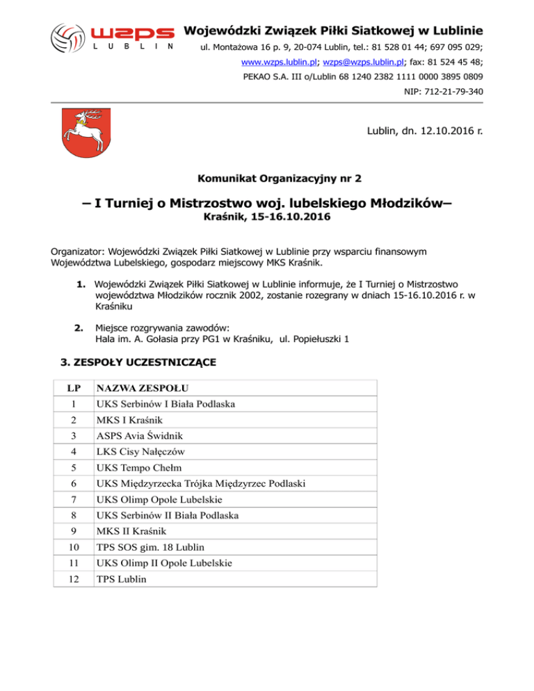 Komunikat Organizacyjny nr 2 I Turnieju o Mistrzostwo woj