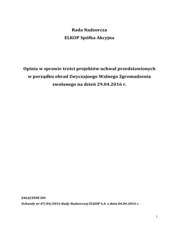 Rada Nadzorcza ELKOP Spółka Akcyjna Opinia w sprawie treści projektów uchwał przedstawionych w porządku obrad Zwyczajnego Walnego Zgromadzenia zwołanego na dzień 29.04.2016 r. ZAŁĄCZNIK DO: Uchwały nr 07/04/2016 Rady Nadzorczej ELKOP S.A. z dnia 04.04.2016 r. 1 Rada Nadzorcza spółki ELKOP S.A. w Chorzowie niniejszym postanawia wyrazić pozytywną opinię w sprawie treści wszystkich projektów uchwał postawionych w porządku obrad Zwyczajnego Walnego Zgromadzenia zwołanego na dzień 29.04.2016 r. UCHWAŁY od NUMERU 1 do NUMERU 4 Zwyczajnego Walnego Zgromadzenia spółki ELKOP Spółka Akcyjna z siedzibą w Chorzowie z dnia 29 kwietnia 2016 roku Uchwały od nr 1 do nr 4 mają charakter porządkowo-organizacyjny i służą prawidłowemu odbyciu Zwyczajnego Walnego Zgromadzenia. Wobec powyższego Rada Nadzorcza wyraża pozytywną opinie w przedmiocie przedstawionych projektów Uchwał. UCHWAŁA NUMER 5 Zwyczajnego Walnego Zgromadzenia spółki ELKOP Spółka Akcyjna z siedzibą w Chorzowie z dnia 29 kwietnia 2016 roku w sprawie zatwierdzenia Sprawozdania Zarządu z działalności Spółki za rok 2015 Zgodnie z DPSN 2016 w pkt. IV.Z.12 Zarząd prezentuje uczestnikom zwyczajnego walnego zgromadzenia wyniki finansowe spółki oraz inne istotne informacje zawarte w sprawozdaniu finansowym podlegającym zatwierdzeniu przez walne zgromadzenie. Zatwierdzenie sprawozdania finansowego oraz sprawozdania Zarządu z działalności jest wymagane na podstawie art. 395 § 2 pkt 1 KSH, oraz na podstawie Artykułu 12 pkt. 12.1 ust. a) Statutu Spółki. Sprawozdanie finansowe zostało zbadane przez biegłego rewidenta, który wydał opinię z ich badania bez zastrzeżeń. Rada Nadzorcza również pozytywnie ocenia treść Sprawozdania Zarządu Spółki z działalności za rok 2015. Wobec powyższego Rada Nadzorcza wyraża pozytywną opinie w przedmiocie przedstawionego projektu Uchwały. 2 UCHWAŁA NUMER 6 Zwyczajnego Walnego Zgromadzenia Spółki ELKOP Spółka Akcyjna z siedzibą w Chorzowie z dnia 29 kwietnia 2016 roku w sprawie zatwierdzenia Sprawozdania Finansowego Spółki za rok 2015 to jest za okres od 01.01.2015 r. do 31.12.2015 r. Zatwierdzenie sprawozdania finansowego oraz sprawozdania Zarządu z działalności jest wymagane na podstawie art. 395 § 2 pkt 1 KSH, oraz na podstawie Artykułu 12 pkt. 12.1 ust. a) Statutu Spółki. Sprawozdanie finansowe zostało zbadane przez biegłego rewidenta, który wydał opinię z ich badania bez zastrzeżeń. Rada Nadzorcza również pozytywnie ocenia treść Sprawozdania finansowego Spółki z działalności za rok 2015. Wobec powyższego Rada Nadzorcza wyraża pozytywną opinie w przedmiocie przedstawionego projektu Uchwały. UCHWAŁA NUMER 7 Zwyczajnego Walnego Zgromadzenia Spółki ELKOP Spółka Akcyjna z siedzibą w Chorzowie z dnia 29 kwietnia 2016 roku w sprawie zatwierdzenia Sprawozdania Rady Nadzorczej Spółki za rok 2015 Na podstawie DPSN 2016 pkt. II.Z.10. Rada Nadzorcza przynajmniej raz w roku sporządza i przedstawia sprawozdanie Walnemu Zgromadzeniu. Rada Nadzorcza sporządziła Sprawozdanie z działalności jako organu Spółki oraz jednogłośnie przyjęła jego treść. Wobec powyższego Rada Nadzorcza wyraża pozytywną opinie w przedmiocie przedstawionego projektu Uchwały. UCHWAŁA NUMER 8 Zwyczajnego Walnego Zgromadzenia Spółki ELKOP Spółka Akcyjna z siedzibą w Chorzowie z dnia 29 kwietnia 2016 roku w sprawie zatwierdzenia Sprawozdania Rady Nadzorczej Spółki z oceny Sprawozdania Zarządu Spółki z działalności w roku 2015 oraz sprawozdania finansowego za rok 2015 Na podstawie DPSN 2016 pkt. II.Z.10. Rada Nadzorcza przynajmniej raz w roku sporządza i przedstawia sprawozdanie Walnemu Zgromadzeniu. Zatwierdzenie sprawozdania finansowego 3 oraz sprawozdania Zarządu z działalności jest wymagane na podstawie art. 395 § 2 pkt 1 KSH, oraz na podstawie Artykułu 12 pkt. 12.1 ust. a) Statutu Spółki. Sprawozdanie finansowe zostało zbadane przez biegłego rewidenta, który wydał opinię z ich badania bez zastrzeżeń. Rada Nadzorcza sporządziła Sprawozdanie Spółki z oceny Sprawozdania Zarządu Spółki z działalności w roku 2015 oraz sprawozdania finansowego za rok 2015 oraz jednogłośnie przyjęła jego treść. Wobec powyższego Rada Nadzorcza wyraża pozytywną opinie w przedmiocie przedstawionego projektu Uchwały. UCHWAŁA NUMER 9 Zwyczajnego Walnego Zgromadzenia Spółki ELKOP Spółka Akcyjna z siedzibą w Chorzowie z dnia 29 kwietnia 2016 roku w sprawie przeznaczenia zysku netto za okres od 01.01.2015 r. do 31.12.2015 r. Podjęcie uchwały w sprawie podziału zysku jest wymagane na podstawie art. 395 § 2 pkt 2 KSH oraz na podstawie Artykułu 12 pkt. 12.1 ust. d) Statutu Spółki. Propozycja podziału zysku poprzez przeznaczenie na zasilenie kapitału zapasowego jest zgodna z przyjętą przez Spółkę polityką, nie zagraża bezpieczeństwu finansowemu Spółki i jej dalszemu rozwojowi. Wobec powyższego Rada Nadzorcza wyraża pozytywną opinie w przedmiocie przedstawionego projektu Uchwały. UCHWAŁA NUMER 10 Zwyczajnego Walnego Zgromadzenia Spółki ELKOP Spółka Akcyjna z siedzibą w Chorzowie z dnia 29 kwietnia 2016 roku w sprawie udzielenia Prezesowi Zarządu absolutorium z wykonania obowiązków w 2015 R. Udzielenie absolutorium jest wymagane na podstawie art. 395 § 2 pkt 3 KSH oraz Artykułu 12 pkt. 12.1 ust. b). Rada Nadzorcza pozytywnie ocena realizację zadań przez Prezesa Zarządu. Wobec powyższego Rada Nadzorcza wyraża pozytywną opinie w przedmiocie przedstawionego projektu Uchwały. 4 UCHWAŁY OD NUMERU 11 DO NUMERU 15 Zwyczajnego Walnego Zgromadzenia Spółki ELKOP Spółka Akcyjna z siedzibą w Chorzowie z dnia 29 kwietnia 2016 roku w sprawie udzielenia Członkom Rady Nadzorczej absolutorium z wykonania obowiązków w 2015 roku Udzielenie absolutorium jest wymagane na podstawie art. 395 § 2 pkt 3 KSH oraz Artykułu 12 pkt. 12.1 ust. b) Statutu Spółki. Rada Nadzorcza pozytywnie