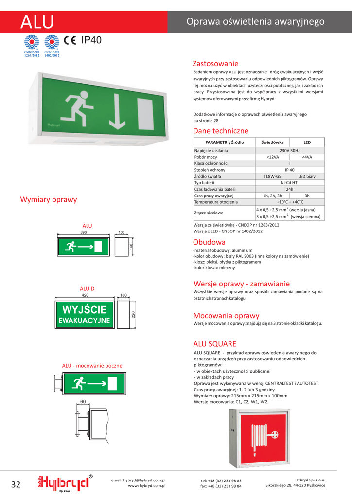 ALU 1263/2012 Oprawa oświetlenia awaryjnego IP40 1402/2012 Zastosowanie Zadaniem oprawy ALU jest oznaczanie dróg ewakuacyjnych i wyjść awaryjnych przy zastosowaniu odpowiednich piktogramów. Oprawy tej można użyć w obiektach użyteczności publicznej, jak i zakładach pracy. Przystosowana jest do współpracy z wszystkimi wersjami systemów oferowanymi przez firmę Hybryd. Dodatkowe informacje o oprawach oświetlenia awaryjnego na stronie 28. Dane techniczne PARAMETR \ Źródło Świetlówka Napięcie zasilania Pobór mocy Klasa ochronności Stopień ochrony Źródło światła Typ baterii Czas ładowania baterii Czas pracy awaryjnej Temperatura otoczenia Wymiary oprawy Złącze sieciowe ALU 390 230V 50Hz <12VA <4VA I IP 40 TL8W-G5 LED biały Ni-Cd HT 24h 1h, 2h, 3h 3h +10°C ÷ +40°C 4 x 0,5 ÷2,5 mm 2 (wersja jasna) 3 x 0,5 ÷2,5 mm 2 (wersja ciemna) Wersja ze świetlówką - CNBOP nr 1263/2012 Wersja z LED - CNBOP nr 1402/2012 140 100 Obudowa -materiał obudowy: aluminium -kolor obudowy: biały RAL 9003 (inne kolory na zamówienie) -klosz: pleksi, płytka z piktogramem -kolor klosza: mleczny Wersje oprawy - zamawianie ALU D Wszystkie wersje oprawy oraz sposób zamawiania podane są na ostatnich stronach katalogu. 100 220 420 LED Mocowania oprawy Wersje mocowania oprawy znajdują się na 3 stronie okładki katalogu. ALU SQUARE ALU - mocowanie boczne 60 R 32 Sp. z o.o. email: [email protected] www: hybryd.com.pl ALU SQUARE - przykład oprawy oświetlenia awaryjnego do oznaczania urządzeń przy zastosowaniu odpowiednich piktogramów: - w obiektach użyteczności publicznej - w zakładach pracy Oprawa jest wykonywana w wersji CENTRALTEST i AUTOTEST. Czas pracy awaryjnej: 1, 2 lub 3 godziny. Wymiary oprawy: 215mm x 215mm x 100mm Wersje mocowania: C1, C2, W1, W2. tel: +48 (32) 233 98 83 fax: +48 (32) 233 98 84 Hybryd Sp. z o.o. Sikorskiego 28, 44-120 Pyskowice Oprawy oświetlenia awaryjnego - dane do zamówienia Wersja ze świetlówką CRYSTAL Kolor obudowy (Kod RAL) Piktogram Oprawa Wykonanie Taw [h] Tryb pracy Mocowanie CRYSTAL ST 1 C C5 9003 C6 * … * P29 AT 2 CT J 3 9005 C7 CB W3 CB-MA W4 9006 P01 Przykład tworzenia nazwy: CRYSTAL CT 2C C5 9003 P05 Wersja z LED Oprawa Wykonanie Tryb pracy Źródło światła Mocowanie CRYSTAL ST C LED C5 9003 C6 * … * P29 AT J CT C7 CB W3 CB-MA Przykład tworzenia nazwy: CRYSTAL AT C LED W3 9003 P09 Wersja ze świetlówką ALU Oprawa Wielkość oprawy Typ oprawy Wykonanie Taw [h] 1 AT 2 D DW CT 3 TS CB CB-MA Przykład tworzenia nazwy: ALU AT 2J W2 9003 P02 ALU Wersja z LED Oprawa Wielkość oprawy Typ oprawy Wykonanie Tryb pracy ALU AT C D DW CT J TS CB CB-MA Przykład tworzenia nazwy: ALU D CT C LED C2 9003 P12 1) Mocowanie W1 tylko dla jednostronnej oprawy ALU. SPARK Oprawa Wielkość oprawy Typ oprawy Wykonanie SPARK Tryb pracy Kolor obudowy (Kod RAL) 9005 9006 Piktogram P01 W4 Tryb pracy Mocowanie C J W1 W2 C1 C2 Źródło światła 1 Mocowanie W11 W2 C1 C2 LED Źródło światła Mocowanie AT C LED D DW CT J CB CB-MA Przykład tworzenia nazwy: SPARK D AT J LED C25 9006 P05 1) Mocowanie W1 tylko dla jednostronnej oprawy SPARK. W11 C25 C30 W16 Kolor obudowy Piktogram (Kod RAL) 9003 * 9005 9006* P01 … P29 Kolor obudowy Piktogram (Kod RAL) 9003 9005* 9006* P01 … P29 Kolor obudowy Piktogram (Kod RAL) 9006 9003* 9005* P01 … P29 Legenda - strona 68 R 64 Sp. z o.o. email: [email protected] www: hybryd.com.pl tel: +48 (32) 233 98 83 fax: +48 (32) 233 98 84 Hybryd Sp. z o.o. Sikorskiego 28, 44-120 Pyskowice Oprawy oświetlenia awaryjnego - dane do zamówienia SFERA Oprawa Typ obudowy Wykonanie Moc Taw [h] Tryb pracy SFERA N ST 1x18W 2 J P AT 2x18W CT 1x26W CB 2x26W 1x32W Przykład tworzenia nazwy: SFERA N CT 2x18W 2J SQUARE Oprawa Typ obudowy Wykonanie Moc Taw [h] Tryb pracy SQUARE N ST 4x14W 2 J P AT 4x18W CT 2x36W CB Przykład tworzenia nazwy: SQUARE P AT 4x18W 2J Legenda: Typ bryły fotometrycznej: patrz indywidualne karty produktów. Wielkość oprawy: Puste pole – mała D – duża. Typ oprawy lub klosz: N – natynkowa P – podtynkowa DW – oprawa dwustronna bądź klosz dwustronny. Wykonanie: ST – standard AT – autotest CT – centraltest TS – testsystem CB – centralna bateria, CB-MA – centralna bateria z wbudowanym modułem adresowym, CB-MP – centralna bateria z wbudowanym modułem przełączającym, CB-MAP – centralna bateria z wbudowanym modułem adresowo-przełączającym. Taw [h] - czas pracy awaryjnej: nie definiuje się dla wszystkich wykonań CB. Tryb pracy: C – ciemny J – jasny N – nocny (tylko dla wykonania CT). Zdefiniowany dla wykonań ST, AT, CT, TS, CB-MA (oprawy LED) i CB-MAP (oprawy świetlówkowe). Zakres temperatur: Puste pole - standardowy zakres temperatur T – oprawa o rozszerzonym zakresie temperatur (patrz dane techniczne) z wbudowanym termostatem H-323 (baterią termostatyzowaną). Kolor obudowy: pola oznaczone * dostępne na specjalne zamówienie – wydłużony czas dostawy. R 68 Sp. z o.o. email: [email protected] www: hybryd.com.pl tel: +48 (32) 233 98 83 fax: +48 (32) 233 98 84 Hybryd Sp. z o.o. Sikorskiego 28, 44-120 Pyskowice Wykonania, funkcje Oprawy oświetlenia awaryjnego Wykonania - testowanie, monitoring ST = Standard - test pracy awaryjnej przy pomocy przycisku TEST , albo poprzez zanik zasilania; AT = Autotest - automatyczne okresowe wykonywanie testów: TEST A - test sprawności lampy, raz w miesiącu; TEST B - pomiar czasu pracy awaryjnej, raz w roku; CT = Centraltest - współpraca z centralą monitorującą, albo z komputerem PC ( pełna adresacja opraw, wizualizacja opraw na planie obiektu, raporty o stanie systemu), testy wywoływane z jednostki sterującej H-300 PC lub H-302 C; TS = Test System - sterowanie z jednostki pilota H-101TS, testy wywoływane z jednostki pilota, przesyłanie wyników testów do jednostki pilota; CB = Centralna Bateria - oprawa zasilana z sieci napięciem 230V AC 50Hz, a po zaniku napięcia sieci, napięciem 220V DC pochodzącym z central