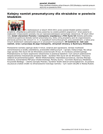 powiat_klodzki http://powiat.klodzko.pl/archiwum-/2013/kolejny-namiot-pneum atyczny-w-powiecie.html Kolejny namiot pneumatyczny dla strażaków w powiecie kłodzkim Po realizowanym w latach 2010-2011 przez powiat kłodzki polsko-czeskim projekcie „Współpraca jednostek straży pożarnej na czesko-polskim pograniczu” straż pożarna w większości miejscowości powiatu ma już najnowocześniejsze samochody ratownicze. W lutym 2012 roku dzięki staraniom Powiatu i nawiązaniu współpracy z PZU Życie SA kłodzka jednostka ratowniczo-gaśnicza dostała namiot pneumatyczny, który zimą przydatny jest do organizowaniu pierwszej pomocy dla rannych m. in. w wypadkach komunikacyjnych, przy powodziach, a także przy innych działaniach zabezpieczających w sytuacjach kryzysowych. 29 kwietnia br. taki sam namiot, wraz z przyczepą do jego transportu, otrzymali strażacy w Bystrzycy Kłodzkiej. Postawienie namiotu zajmuje około 4 minut, wnętrze jest ogrzewane, istnieje możliwość zamontowania w środku oświetlenia, przewodów elektrycznych i sprzętu medycznego. Na zakup tego sprzętu PZU Życie SA we Wrocławiu przeznaczyło 35 tys. zł z funduszu prewencyjnego. Podziękowania za hojne wspieranie ratownictwa w powiecie kłodzkim i tym samym podnoszenie bezpieczeństwa mieszkańców Jarosław Skalik – dyrektor PZU Życie SA we Wrocławiu i Poznaniu odebrał od parlamentarzystów – Moniki Wielichowskiej i Stanisława Jurcewicza, starosty Macieja Awiżenia, komendanta PSP Jana Chodorowskiego, Renaty Surmy – burmistrz Bystrzycy Kłodzkiej i Krzysztofa Baldego – członka Zarządu Powiatu. Dyrektor Skalik obiecał samorządowcom, że postara się jeszcze znaleźć środki na sfinansowanie trzeciego namiotu – tym razem dla JRG w Nowej Rudzie. Data publikacji 2017-03-08 19:18:34, Strona: 1/1