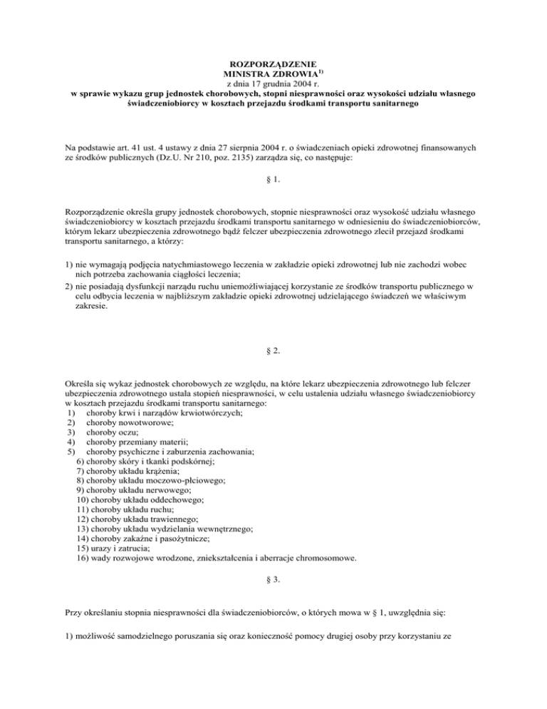 ROZPORZĄDZENIE MINISTRA ZDROWIA1) z dnia 17 grudnia 2004 r. w sprawie wykazu grup jednostek chorobowych, stopni niesprawności oraz wysokości udziału własnego świadczeniobiorcy w kosztach przejazdu środkami transportu sanitarnego Na podstawie art. 41 ust. 4 ustawy z dnia 27 sierpnia 2004 r. o świadczeniach opieki zdrowotnej finansowanych ze środków publicznych (Dz.U. Nr 210, poz. 2135) zarządza się, co następuje: § 1. Rozporządzenie określa grupy jednostek chorobowych, stopnie niesprawności oraz wysokość udziału własnego świadczeniobiorcy w kosztach przejazdu środkami transportu sanitarnego w odniesieniu do świadczeniobiorców, którym lekarz ubezpieczenia zdrowotnego bądź felczer ubezpieczenia zdrowotnego zlecił przejazd środkami transportu sanitarnego, a którzy: 1) nie wymagają podjęcia natychmiastowego leczenia w zakładzie opieki zdrowotnej lub nie zachodzi wobec nich potrzeba zachowania ciągłości leczenia; 2) nie posiadają dysfunkcji narządu ruchu uniemożliwiającej korzystanie ze środków transportu publicznego w celu odbycia leczenia w najbliższym zakładzie opieki zdrowotnej udzielającego świadczeń we właściwym zakresie. § 2. Określa się wykaz jednostek chorobowych ze względu, na które lekarz ubezpieczenia zdrowotnego lub felczer ubezpieczenia zdrowotnego ustala stopień niesprawności, w celu ustalenia udziału własnego świadczeniobiorcy w kosztach przejazdu środkami transportu sanitarnego: 1) choroby krwi i narządów krwiotwórczych; 2) choroby nowotworowe; 3) choroby oczu; 4) choroby przemiany materii; 5) choroby psychiczne i zaburzenia zachowania; 6) choroby skóry i tkanki podskórnej; 7) choroby układu krążenia; 8) choroby układu moczowo-płciowego; 9) choroby układu nerwowego; 10) choroby układu oddechowego; 11) choroby układu ruchu; 12) choroby układu trawiennego; 13) choroby układu wydzielania wewnętrznego; 14) choroby zakaźne i pasożytnicze; 15) urazy i zatrucia; 16) wady rozwojowe wrodzone, zniekształcenia i aberracje chromosomowe. § 3. Przy określaniu stopnia niesprawności dla świadczeniobiorców, o których mowa w § 1, uwzględnia się: 1) możliwość samodzielnego poruszania się oraz konieczność pomocy drugiej osoby przy korzystaniu ze środków transportu publicznego; 2) ogólny stan zdrowia. § 4. W zależności od wskazań medycznych ustalonych przy uwzględnieniu grup, o których mowa w § 2, oraz czynników, o których mowa w § 3, określa się dwa stopnie niesprawności: 1) niesprawność I stopnia - do której zalicza się osobę zdolną do poruszania się przy wykorzystaniu środków pomocniczych i przedmiotów ortopedycznych bez stałej pomocy innej osoby i zdolną do korzystania ze środków transportu publicznego; 2) niesprawność II stopnia - do której zalicza się osobę zdolną do samodzielnego poruszania się bez stałej pomocy innej osoby, ale wymagającą przy korzystaniu ze środków transportu publicznego pomocy innej osoby lub środka transportu publicznego dostosowanego do potrzeb osób niepełnosprawnych. § 5. Stopień niesprawności świadczeniobiorcy określa lekarz ubezpieczenia zdrowotnego lub felczer ubezpieczenia zdrowotnego, dokonując wpisu w dokumentacji medycznej oraz dokumentacji prowadzonej na potrzeby podmiotów zobowiązanych do finansowania świadczeń opieki zdrowotnej ze środków publicznych, oraz wydaje zlecenie na przewóz. § 6. W przypadku świadczeniobiorów chorujących na choroby wymienione w § 2, wobec których ustalono: 1) niesprawność I stopnia - udział własny świadczeniobiorcy w kosztach przewozu środkiem transportu sanitarnego wynosi 100%; 2) niesprawność II stopnia - udział własny świadczeniobiorcy w kosztach przewozu środkiem transportu sanitarnego wynosi 60%. § 7. Rozporządzenie wchodzi w życie z dniem 1 stycznia 2005 r. 2) MINISTER ZDROWIA 1) Minister Zdrowia kieruje działem administracji rządowej - Zdrowie na podstawie § 1 ust. 2 rozporządzenia Prezesa Rady Ministrów z dnia 11 czerwca 2004 r. w sprawie szczegółowego zakresu działania Ministra Zdrowia (Dz. U. Nr Nr 134, poz. 1439). 2) Niniejsze rozporządzenie było poprzedzone rozporządzeniem Ministra Zdrowia z dnia 10 maja 2003 r w sprawie określenia wykazu grup jednostek chorobowych, stopni niesprawności oraz wysokości udziału własnego ubezpieczonego w kosztach przejazdu środkami transportu sanitarnego (Dz. U. Nr 88, poz. 815), które utraciło moc z dniem 31 grudnia 2004 r. na podstawie art. 247 ustawy z dnia 27 sierpnia 2004 r. o świadczeniach opieki zdrowotnej finansowanych ze środków publicznych.