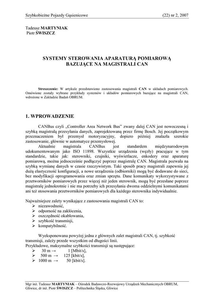 Szybkobieżne Pojazdy Gąsienicowe (22) nr 2, 2007 Tadeusz MARTYNIAK Piotr ŚWISZCZ SYSTEMY STEROWANIA APARATURĄ POMIAROWĄ BAZUJĄCE NA MAGISTRALI CAN Streszczenie: W artykule przedstawiono zastosowania magistrali CAN w układach pomiarowych. Omówione zostały wybrane przykłady systemów i układów pomiarowych bazujące na magistrali CAN, wdrożone w Zakładzie Badań OBRUM. 1. WPROWADZENIE CANBus czyli „Controller Area Network Bus” zwany dalej CAN jest nowoczesną i szybką magistralą przesyłania danych, zaprojektowaną przez firmę Bosch. Jej początkowym przeznaczeniem był przemysł motoryzacyjny, dopiero później znalazła szerokie zastosowanie, głównie w automatyce przemysłowej. Aktualnie magistrala CANBus jest standardem międzynarodowym udokumentowanym jako ISO 11898. Wszystkie urządzenia (węzły) pracujące w tym standardzie, takie jak: sterowniki, czujniki, wyświetlacze, enkodery oraz aparaturę pomiarową, można jednocześnie podłączyć poprzez magistralę CAN. Magistrala pozwala na szybką wymianę danych w czasie rzeczywistym. Taki sposób pracy magistrali zapewnia jej dużą elastyczność konfiguracji, a nowe urządzenia (odbiorniki) mogą być dodawane do sieci, bez modyfikacji oprogramowania oraz zmian sprzętu. Dane komunikaty wykorzystywane z przetworników pomiarowych przez więcej niż jeden sterownik, mogą być przesłane poprzez magistralę jednokrotnie i nie ma potrzeby ich przesyłania dwoma oddzielnymi komunikatami ani też stosowania przetworników pomiarowych dla każdego sterownika indywidualnie. Najważniejsze zalety wynikające z zastosowania magistrali CAN to: niezawodność, odporność na zakłócenia, oszczędność okablowania, szybkość transmisji, kompatybilność. Wyeksponowana powyżej jedna z głównych zalet magistrali CAN, tj. szybkość transmisji, zależy przede wszystkim od długości linii. Przykładowe, maksymalne szybkości transmisji są następujące: 30 m → 1 [Mbit/s], 500 m → 125 [kbit/s], 1000 m → 50 [kbit/s]. Mgr inż. Tadeusz MARTYNIAK – Ośrodek Badawczo-Rozwojowy Urządzeń Mechanicznych OBRUM, Gliwice, dr inż. Piotr ŚWISZCZ – Politechnika Śląska, Gliwice Tadeusz MARTYNIAK, Piotr ŚWISZCZ 2. SYSTEMY POMIAROWE W ZAKŁADZIE BADAŃ Z ZASTOSOWANIEM MAGISTRALI CAN W związku z potrzebą uzyskania dużej dokładności i powtarzalności wyników pomiarów w Zakładzie Badań magistralę CAN zastosowano: w modernizacji istniejących stanowisk badawczych, przy projektowaniu nowej aparatury pomiarowej, w układzie pomiarowym ciśnienia siłowników głównych układu podnoszenia i opuszczania przęsła (współpraca z Wojskowym Instytutem Techniki Inżynieryjnej, Wrocław przy realizacji badań kwalifikacyjnych mostu MS-20), przy opracowaniu i wykonaniu systemu pomiarowego półaktywnego układu zawieszenia pojazdu specjalnego. 2.1 Modernizacja istniejących stanowisk badawczych 2.1.1 Układ pomiarowy kąta przechyłu Ramowego Układu Wsporczego (RUW) Po wypoziomowaniu wyrobu i podniesieniu RUW do pionu wykonywany jest pomiar kąta przechyłu (rys.1.) z wykorzystaniem uniwersalnego zestawu pomiarowego. Uniwersalny zestaw pomiarowy składa się z następujących urządzeń firmy IFM Electronic (Niemcy): sterownik CR 0501, wyświetlacz graficzny CR 1001, (rys.2.), czujnik kąta ± 15° CR2101 (pomiar kąta w płaszczyznach X i Y), (rys.3). Rys. 1. Stanowisko badawcze – badanie odporności RUW na oddziaływanie wiatru 2 Systemy sterowania aparaturą pomiarową bazujące na magistrali CAN Rys. 2.Wyświetlacz graficzny CR 1001 Rys. 3. Czujnik kąta (inklinometr) Na bazie posiadanego oprogramowania sterownika CR 0501 i wyświetlacza CR 1001, zostało opracowane oprogramowanie dedykowane do pomiaru kąta przechyłu osi ramy RUW w płaszczyźnie X-Y z jednoczesnym wyświetlaniem wartości na ekranie (z żądaną rozdzielczością, tj.: stopnie, minuty i sekundy). Opracowane rozwiązanie uniwersalnego zestawu pomiarowego ma możliwość: rejestracji wyników pomiarowych w bazie danych wyświetlacza, drukowania wyników pomiarów, podłączenia dodatkowych urządzeń (innych przetworników pomiarowych) poprzez magistralę CAN. 3 Tadeusz MARTYNIAK, Piotr ŚWISZCZ 2.1.2 System pomiaru kąta odchylenia osi wirowania jednostki JAT-122 ISTNIEJĄCE PRZETWORNIKI POMIAROWE PLC Z ISTNIEJĄCYM OPROGRAMOWANIEM PANEL ODCZYTOWY INTERFEJS CAN DODATKOWY INKLINOMETR ORAZ CZUJNIK IND. DO SYNCHRONIZACJI PROCEDURA KALIBRACYJNA PROCEDURA SYNCHRONIZACJI I ODMIERZANIA CZASU PROCEDURA WYSZUKIWANIA WARTOŚCI MAKSYMALNEJ PROCEDURA OBSŁUGI PANELU WYŚWIETLACZA Rys. 4 Schemat blokowy zmodernizowanej części zestawu pomiarowego Rys. 5. Jednostka radarowa JAT – 122 4 Systemy sterowania aparaturą pomiarową bazujące na magistrali CAN Opracowane oprogramowanie pozwoliło na wykonanie pomiarów odchylenia osi wirowania jednostki radarowej JAT-122 dla prędkości obrotowej osi wynoszącej odpowiednio: 6 obr/min i 12 obr/min. Na wyświetlaczu, po wciśnięciu odpowiedniego przycisku odczytywane były następujące wartości: bieżące odchylenie osi, maksymalne odchylenie osi w określonej strefie kąta obrotu jednostki radarowej. 2.1.3 Układ pomiarowy do badań amortyzatora ciernego Amortyzator cierny (element zawieszenia półaktywnego) poddano badaniom trwałościowym na stanowisku badawczym, obejmującym wykonanie 50 tys. cykli. W trakcie badań rejestrowano: przebieg ciśnienia zasilającego silnik hydrauliczny typu „Poclain 60” (napęd dźwigni amortyzatora), kąt pracy dźwigni amortyzatora (w obu kierunkach). Rys. 6. Amortyzator cierny na stanowisku badawczym 5 Tadeusz MARTYNIAK, Piotr ŚWISZCZ Wyniki rejestracji pomiarów z przetworników ciśnienia i kąta (z wykorzystaniem magistrali CAN) przedstawiają wykresy na rys. 7, 8 i 9. Rys. 7. Przebieg wartości ciśnienia zasilającego silnik hydrauliczny Rys. 8. Przebieg wartości kątów pracy amortyzatora Rys. 9. Rejestracja zakończonego etapu cykli i przebiegów (ciśnienia 