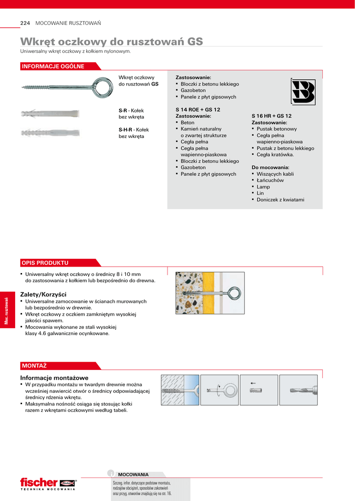 224 MOCOWANIE RUSZTOWAŃ Wkręt oczkowy do rusztowań GS Uniwersalny wkręt oczkowy z kołkiem nylonowym. INFORMACJE OGÓLNE Wkręt oczkowy do rusztowań GS Zastosowanie: ▪ Bloczki z betonu lekkiego ▪ Gazobeton ▪ Panele z płyt gipsowych S-R - Kołek bez wkręta S 14 ROE + GS 12 Zastosowanie: ▪ Beton ▪ Kamień naturalny o zwartej strukturze ▪ Cegła pełna ▪ Cegła pełna wapienno-piaskowa ▪ Bloczki z betonu lekkiego ▪ Gazobeton ▪ Panele z płyt gipsowych S-H-R - Kołek bez wkręta Opis produktu Moc. rusztowań ▪ Uniwersalny wkręt oczkowy o średnicy 8 i 10 mm do zastosowania z kołkiem lub bezpośrednio do drewna. Zalety/Korzyści ▪ Uniwersalne zamocowanie w ścianach murowanych lub bezpośrednio w drewnie. ▪ Wkręt oczkowy z oczkiem zamkniętym wysokiej jakości spawem. ▪ Mocowania wykonane ze stali wysokiej klasy 4.6 galwanicznie ocynkowane. MONTAŻ Informacje montażowe ▪ W przypadku montażu w twardym drewnie można wcześniej nawiercić otwór o średnicy odpowiadającej średnicy rdzenia wkrętu. ▪ Maksymalna nośność osiąga się stosując kołki razem z wkrętami oczkowymi według tabeli. MOCOWANIA T E C H N I K A M O C O W A N I A Szczeg. infor. dotyczące podstaw montażu, rodzajów obciążeń, sposobów zakotwień oraz przyg. otworów znajdują się na str. 16. S 16 HR + GS 12 Zastosowanie: ▪ Pustak betonowy ▪ Cegła pełna wapienno-piaskowa ▪ Pustak z betonu lekkiego ▪ Cegła kratówka. Do mocowania: ▪ Wiszących kabli ▪ Łańcuchów ▪ Lamp ▪ Lin ▪ Doniczek z kwiatami 225 DANE TECHNICZNE Wkręt oczkowy do rusztowań GS Typ Art.-Nr PZ Aprobata ITB GS 8 x 80 GS 8 x 100 GS 8 x 120 GS 10 x 160 80918 80919 80920 80929 1 8 4 7 Średnica Długość Głębokość wkręcenia Pasuje do Oczko-Ø ds [mm] L l [mm] 8 8 8 10 80 100 120 160 [mm] [mm] szt. 58 58 58 - S 10 S 10 S 10 S 12R, S 14H-R, GB 14 22 22 22 30 20 20 20 20 S-R - Kołek bez wkręta Typ S 12 R 100 S 12 R 135 S 14 H 100 R S 14 H 135 R Art.-Nr 50177 50178 59179 59180 PZ 1 8 6 2 Ilość w opakowaniu S-H-R - Kołek bez wkręta Wiertło Min. głęb. otworu przy montażu przelotowym Min. głęb. zakotwienia do [mm] td [mm] hef [mm] 12 12 14 14 110 145 110 145 60 60 90 90 Długość kołka Maks. dług. użytkowa Ilość w opakowaniu l [mm] t fix [mm] szt. 100 135 100 135 40 75 10 45 100 100 50 50 OBCIĄŻENIA Obciążenia niszczące [kN]. Należy uwzględnić odpowiedni współczynnik bezpieczeństwa. S 10 4.7 4.4 4.0 2.5 1.8 – S 12 R 7.2 7.0 5.9 2.5 2.0 2.1 S 14 H..R – – – 3.5 3.0 2.4 Moc. rusztowań Beton ≥ B 15 Cegła pełna Mz 12 Cegła pełna wapienno-piaskowa KS 12 Pustaki z betonu lekkiego Hlz 12 Cegła pełna z betonu lekkiego V4 Cegła kratówka KSL 12 T E C H N I K A M O C O W A N I A