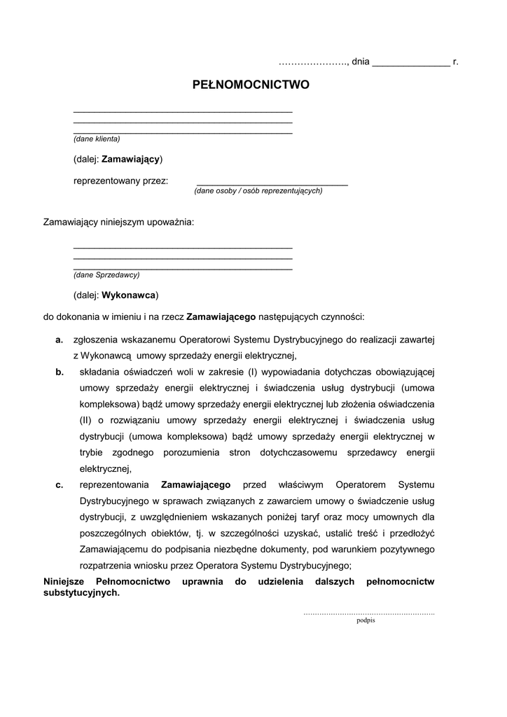 …………………., dnia _______________ r. PEŁNOMOCNICTWO __________________________________________ __________________________________________ __________________________________________ (dane klienta) (dalej: Zamawiający) reprezentowany przez: _____________________________ (dane osoby / osób reprezentujących) Zamawiający niniejszym upowaŜnia: __________________________________________ __________________________________________ __________________________________________ (dane Sprzedawcy) (dalej: Wykonawca) do dokonania w imieniu i na rzecz Zamawiającego następujących czynności: a. zgłoszenia wskazanemu Operatorowi Systemu Dystrybucyjnego do realizacji zawartej z Wykonawcą umowy sprzedaŜy energii elektrycznej, b. składania oświadczeń woli w zakresie (I) wypowiadania dotychczas obowiązującej umowy sprzedaŜy energii elektrycznej i świadczenia usług dystrybucji (umowa kompleksowa) bądź umowy sprzedaŜy energii elektrycznej lub złoŜenia oświadczenia (II) o rozwiązaniu umowy sprzedaŜy energii elektrycznej i świadczenia usług dystrybucji (umowa kompleksowa) bądź umowy sprzedaŜy energii elektrycznej w trybie zgodnego porozumienia stron dotychczasowemu sprzedawcy energii elektrycznej, c. reprezentowania Zamawiającego przed właściwym Operatorem Systemu Dystrybucyjnego w sprawach związanych z zawarciem umowy o świadczenie usług dystrybucji, z uwzględnieniem wskazanych poniŜej taryf oraz mocy umownych dla poszczególnych obiektów, tj. w szczególności uzyskać, ustalić treść i przedłoŜyć Zamawiającemu do podpisania niezbędne dokumenty, pod warunkiem pozytywnego rozpatrzenia wniosku przez Operatora Systemu Dystrybucyjnego; Niniejsze Pełnomocnictwo substytucyjnych. uprawnia do udzielenia dalszych pełnomocnictw …………………………………………………. podpis Zestawienie obiektów Zamawiającego wraz z danymi i grupami taryfowymi: 1.1 Mazowieckie Centrum Leczenia Chorób Płuc i Gruźlicy l.p. punkt odbioru rodzaj punktu poboru adres/ulica nr kod miejscowość numer ewidencyjny/PPE numer licznika obecna taryfa nowa taryfa moc umowna 1 MCLCPiG Szpital nr. 1 Reymonta 83/91 05-400 Otwock 030313600 557130 C22a C22a 250 2 MCLCPiG Centrum Lecz. Rehab. Narutowicza 80 05-400 Otwock 030313100 158423 C21 C22a 270 3 MCLCPiG Szpital Samorządowa 16 05-400 Otwock 030326400 158457 C21 C22a 50 4 MCLCPiG Sanatorium p/Gruźlicze Teklin 05-400 Otwock 031036032 6327913 C11 C12a 4 ………………………………………………….. PODPIS 1.2 Centrum Psychiatrii i Rehabilitacji Dzieci i MłodzieŜy l.p. kod miejscowość numer ewidencyjny/PPE numer licznika Zagórze 05-462 Zagórze PL0000010200800000000000001626086 10576636 C11 C12a 6 Zagórze 05-462 Zagórze PL0000010015400000000000001796971 8316695 C11 C12a 15 Zagórze 05-462 Zagórze 030314400 300568 C22a C22a 170,0 Zagórze 05-462 Zagórze 030314700 848149 C21 C22a 160,0 punkt odbioru rodzaj punktu poboru adres/ulica 1 Centrum Psychiatrii i Rehabilitacji Dzieci i MłodzieŜy Mazowieckie Centrum 2 Centrum Psychiatrii i Rehabilitacji Dzieci i MłodzieŜy Mazowieckie Centrum 3 Centrum Psychiatrii i Rehabilitacji Dzieci i MłodzieŜy Mazowieckie Centrum 4 Centrum Psychiatrii i Rehabilitacji Dzieci i MłodzieŜy Mazowieckie Centrum nr ………………………………………………….. PODPIS obecna taryfa nowa taryfa moc umowna 1.3 Samodzielny Publiczny Zakład Opieki Zdrowotnej "Meditrans Ostrołęka" punkt odbioru rodzaj punktu poboru adres/ulica nr kod miejscowość numer ewidencyjny/PPE numer licznika obecna taryfa nowa taryfa moc umowna 1 Samodzielny Publiczny Zakład Opieki Zdrowotnej "Meditrans Ostrołęka" Stacja Pogotowia Ratunkowego i Sanitarnego Kościuszki 49 07-410 Ostrołęka 100020025 10807987 C11 C12a 7 2 Samodzielny Publiczny Zakład Opieki Zdrowotnej "Meditrans Ostrołęka" Stacja Pogotowia Ratunkowego i Sanitarnego Kościuszki 49 07-410 Ostrołęka 100020076 8521197 C12a C12a 3 3 Samodzielny Publiczny Zakład Opieki Zdrowotnej "Meditrans Ostrołęka" Stacja Pogotowia Ratunkowego i Sanitarnego Kościuszki 49 07-410 Ostrołęka 100020226 6937749 C11 C12a 35 4 Samodzielny Publiczny Zakład Opieki Zdrowotnej "Meditrans Ostrołęka" Stacja Pogotowia Ratunkowego i Sanitarnego Kościuszki 49 07-410 Ostrołęka 105156184 00104263 C11 C12a 7 5 Samodzielny Publiczny Zakład Opieki Zdrowotnej "Meditrans Ostrołęka" Stacja Pogotowia Ratunkowego i Sanitarnego Kościuszki 49 07-410 Ostrołęka 105305095 26370376 C11 C12a 4 6 Samodzielny Publiczny Zakład Opieki Zdrowotnej "Meditrans Ostrołęka" Stacja Pogotowia Ratunkowego i Sanitarnego Kościuszki 49 07-410 Ostrołęka 132456034 8235235 C11 C12a 16 7 Samodzielny Publiczny Zakład Opieki Zdrowotnej "Meditrans Ostrołęka" Stacja Pogotowia Ratunkowego i Sanitarnego Kościuszki 49 07-410 Ostrołęka 110290029 2975972 C11 C12a 11 8 Samodzielny Publiczny Zakład Opieki Zdrowotnej "Meditrans Ostrołęka" Stacja Pogotowia Ratunkowego i Sanitarnego Kościuszki 49 07-410 Ostrołęka 130197022 1163597 C11 C12a 16 9 Samodzielny Publiczny Zakład Opieki Zdrowotnej "Meditrans Ostrołęka" Stacja Pogotowia Ratunkowego i Sanitarnego Kościuszki 49 07-410 Ostrołęka 114001026 11529052 C11 C12a 25 10 Samodzielny Publiczny Zakład Opieki Zdrowotnej "Meditrans Ostrołęka" Stacja Pogotowia Ratunkowego i Sanitarnego Kościuszki 49 07-410 Ostrołęka 100116100 533137 C11 C12a 30 l.p. ………………………………………………….. PODPIS 1.4 Centrum Zdrowia im.prof. Jana Mazurkiewicza l.p. punkt odbioru rodzaj punktu poboru adres/ulica nr kod miejscowość numer ewidencyjny/PPE numer licznika obecna taryfa nowa taryfa moc umowna 1 Centrum Zdrowia im.prof. Jana Mazurkiewicza Mazowickie Specjalistyczne Centrum Zdrowia w Pruszkowie Partyzantów 2/4 05-802 Pruszków 016901194 14196350 C11 C12a 40 ………………………………………………….. PODPIS 1.5 Mazowiecki Wojewódzki Ośrodek Medycyny Pracy (o/Płock) punkt odbioru