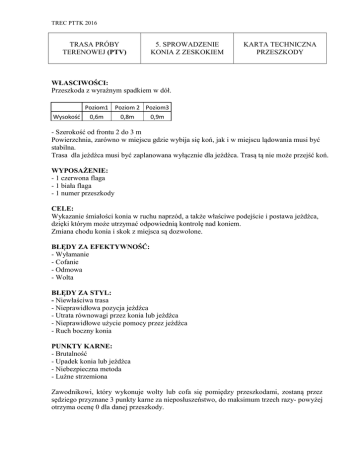 TREC PTTK 2016 TRASA PRÓBY TERENOWEJ (PTV) 5. SPROWADZENIE KONIA Z ZESKOKIEM KARTA TECHNICZNA PRZESZKODY WŁASCIWOŚCI: Przeszkoda z wyraźnym spadkiem w dół. Poziom1 Poziom 2 Poziom3 Wysokość 0,6m 0,8m 0,9m - Szerokość od frontu 2 do 3 m Powierzchnia, zarówno w miejscu gdzie wybija się koń, jak i w miejscu lądowania musi być stabilna. Trasa dla jeźdźca musi być zaplanowana wyłącznie dla jeźdźca. Trasą tą nie może przejść koń. WYPOSAŻENIE: - 1 czerwona flaga - 1 biała flaga - 1 numer przeszkody CELE: Wykazanie śmiałości konia w ruchu naprzód, a także właściwe podejście i postawa jeźdźca, dzięki którym może utrzymać odpowiednią kontrolę nad koniem. Zmiana chodu konia i skok z miejsca są dozwolone. BŁĘDY ZA EFEKTYWNOŚĆ: - Wyłamanie - Cofanie - Odmowa - Wolta BŁĘDY ZA STYL: - Niewłaściwa trasa - Nieprawidłowa pozycja jeźdźca - Utrata równowagi przez konia lub jeźdźca - Nieprawidłowe użycie pomocy przez jeźdźca - Ruch boczny konia PUNKTY KARNE: - Brutalność - Upadek konia lub jeźdźca - Niebezpieczna metoda - Luźne strzemiona Zawodnikowi, który wykonuje wolty lub cofa się pomiędzy przeszkodami, zostaną przez sędziego przyznane 3 punkty karne za nieposłuszeństwo, do maksimum trzech razy- powyżej otrzyma ocenę 0 dla danej przeszkody. TREC PTTK 2016 KARTA OCENY PRZESZKODY SPROWADZENIE KONIA Z ZESKOKIEM NR PRZESZKODY……………. SĘDZIA…………………………. NR START. E + S - P = RAZEM Uwagi: SCHEMAT OCENIANIA : E+S-P EFEKTYWNOŚĆ E STYL S PKT.KARNE P Poprawna 7 bardzo dobry +3 Brutalność -3 1 błąd 4 dobry +2 Niebezpieczna metoda -3 2 błąd 1 prawie dobry +1 3 błąd 0 przeciętny Luźne strzemiona -1 0 Upadek słaby -1 zły -2 Punktacja 0 za efektywność lub za punkty karne oznacza całkowitą ocenę 0 za daną przeszkodę 7 = 0 błędów za efektywność: brak wyłamania, brak wycofania, brak odmowy, brak wolty 4 = 1 błąd- 1 wyłamanie- pierwsze przerwanie ciągłości chodu etc. 1 = 2 błąd - 2 wyłamanie- 2 przerwanie ciągłości chodu etc. 0 = 3 błąd - 3wyłamanie-3 przerwanie ciągłości chodu etc. Te oceny należy wpisać w kratkę E w karcie oceny 0