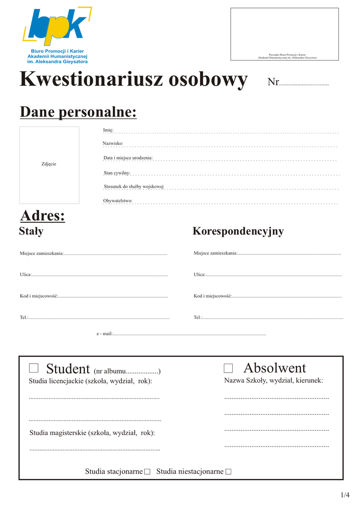 bp pk Biuro Promocji i Karier Akademii Humanistycznej im. Aleksandra Gieysztora Pieczątka Biura Promocji i Karier Akademii Humanistycznej im. Aleksandra Gieysztora Kwestionariusz osobowy Nr................................. Dane personalne: Imię: .................................................................................................... Nazwisko: ......................................................................................... Zdjęcie Data i miejsce urodzenia: ......................................................................................... Stan cywilny: ......................................................................................... Stosunek do służby wojskowej ......................................................................................... Obywatelstwo: ......................................................................................... Adres: Stały Korespondencyjny Miejsce zamieszkania:...................................................................................... Miejsce zamieszkania:...................................................................................... Ulica:................................................................................................................. Ulica:................................................................................................................. Kod i miejscowość:........................................................................................... Kod i miejscowość:........................................................................................... Tel.:..................................................................................................................... Tel.:..................................................................................................................... e - mail:............................................................................................................................... Student (nr albumu..................) Absolwent Studia licencjackie (szkoła, wydział, rok): Nazwa Szkoły, wydział, kierunek: ............................................................................... .......................................................... ................................................................................ .......................................................... Studia magisterskie (szkoła, wydział, rok): ............................................................................... Studia stacjonarne .......................................................... .......................................................... Studia niestacjonarne 1/4 Wykształcenie: Szkoła średnia (nazwa):.................................................................................................................. .................................................................................................... w latach........................................................................... Szkoła wyższa (nazwa):................................................................................................................... ................................................................................ w latach........................................................................... Wydział............................................................................................................................................ Specjalność...................................................................................................................................... Temat pracy licencjackiej................................................................................................................ ................................................................................................................ Temat pracy magisterskiej............................................................................................................... .................................................................................................... Szkoła wyższa - drugi kierunek (od.........................do..........................) (nazwa szkoły, wydział, specjalność)............................................................................................. .................................................................................................... .................................................................................................... Studia podyplomowe (od................................do....................................) (nazwa szkoły, wydział, specjalność)............................................................................................. ............................................................................................. ............................................................................................. Kursy, szkolenia: 1). Instytucja szkoląca.......................................................................................................................... Temat.................................................................................................................................................... Rodzaj certyfikatu (dyplomu).............................................................................................................. 2). 3). 4). 2/4 Doświadczenie zawodowe: 1). Rodzaj pracy (cały etat, część etatu, umowa-zlecenie, praktyka, staż, czas określony)........... Nazwa firmy, instytucji.................................................................................................................. Okres................................................................. 2). 3). 4). Umiejętności: 1). Prawo jazdy: 2). Obsługa komputera NIE POSIADAM Podstawowa POSIADAM Średnia KATEGORIA..................... Dobra Biegła Access Excel Word Power Point Programy graficzne (jakie?) Int