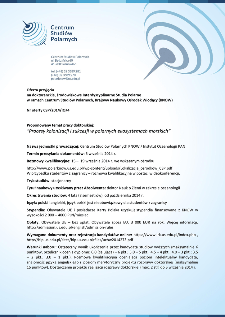 Oferta przyjęcia na doktoranckie, środowiskowe Interdyscyplinarne Studia Polarne w ramach Centrum Studiów Polarnych, Krajowy Naukowy Ośrodek Wiodący (KNOW) Nr oferty CSP/2014/IO/4 Proponowany temat pracy doktorskiej: “Procesy kolonizacji i sukcesji w polarnych ekosystemach morskich” Nazwa jednostki prowadzącej: Centrum Studiów Polarnych KNOW / Instytut Oceanologii PAN Termin przesyłania dokumentów: 5 września 2014 r. Rozmowy kwalifikacyjne: 15 – 19 września 2014 r. we wskazanym ośrodku http://www.polarknow.us.edu.pl/wp-content/uploads/Lokalizacja_osrodkow_CSP.pdf W przypadku studentów z zagranicy – rozmowa kwalifikacyjna w postaci wideokonferencji. Tryb studiów: stacjonarny Tytuł naukowy uzyskiwany przez Absolwenta: doktor Nauk o Ziemi w zakresie oceanologii Okres trwania studiów: 4 lata (8 semestrów), od października 2014 r. Język: polski i angielski, język polski jest nieobowiązkowy dla studentów z zagranicy Stypendia: Obywatele UE i posiadacze Karty Polaka uzyskują stypendia finansowane z KNOW w wysokości 2 000 – 4000 PLN/miesiąc Opłaty: Obywatele UE – bez opłat; Obywatele spoza EU: 3 000 EUR na rok. Więcej informacji: http://admission.us.edu.pl/english/admission-rules Wymagane dokumenty oraz rejestracja kandydatów online: https://www.irk.us.edu.pl/index.php , http://bip.us.edu.pl/sites/bip.us.edu.pl/files/uchw2014273.pdf Warunki naboru: Ostateczny wynik ukooczenia przez kandydata studiów wyższych (maksymalnie 6 punktów, przelicznik ocen z dyplomu: 6.0 (celująca) – 6 pkt.; 5.0 – 5 pkt.; 4.5 – 4 pkt.; 4.0 – 3 pkt.; 3.5 – 2 pkt.; 3.0 – 1 pkt.). Rozmowa kwalifikacyjna oceniająca poziom intelektualny kandydata, znajomośd języka angielskiego i poziom merytoryczny projektu rozprawy doktorskiej (maksymalnie 15 punktów). Dostarczenie projektu realizacji rozprawy doktorskiej (max. 2 str) do 5 września 2014 r. Wymagania: 1. Ukooczone studia II-stopnia (magister) na kierunku oceanografia, geografia, ochrona środowiska, matematyka stosowana, informatyka, fizyka lub pokrewnym. Dopuszcza się składanie wniosków przez osoby, które kooczą studia w najbliższych miesiącach i przedłożą opinię opiekuna pracy magisterskiej o jej stanie zaawansowania oraz zobowiązanie do przedłożenia dyplomu magistra w terminie do 30.09.2014. 2. Znajomośd biologii, jako dyscypliny naukowej, włączając w to jej potrzeby i kierunki rozwoju. 3. Znajomośd języka angielskiego, umożliwiającego swobodna komunikację oraz prowadzenie badao naukowych. Znajomośd języka polskiego nie jest wymagana. 4. Umiejętnośd pracy zespołowej, jak również samodzielnej. 5. Umiejętnośd krytycznego myślenia. 6. Umiejętnośd nawiązywania kontaktów interpersonalnych, w szczególności z partnerami realizującymi projekt. 7. Znajomośd języków programowania (np. FORTRAN, MATLAB, C++) oraz oprogramowania typu GIS, wraz z przygotowywaniem własnych skryptów i funkcji obliczeniowych. Opis zadao: 1. 2. 3. 4. 5. 6. Analizy biologiczne i taksonomiczne bezkręgowców morskich; Przygotowanie, organizacja i prowadzenie doświadczeo w rejonie Spitsbergenu; Analiza oraz przygotowanie baz danych; Przygotowanie artykułów naukowych oraz prezentacji konferencyjnych; Regularne przygotowanie sprawozdao z postępów pracy; Pomoc w codziennych zadaniach Pracowni Funkcjonowania Ekosystemów Morskich, w tym współopieka nad aparaturą pomiarową. Abstrakt Rozwój fauny dennej i jej ostateczna forma zależy w znacznym stopniu od początkowych procesów jej rozwoju (kolonizacji) i poprzez rozwój w czasie (sukcesji), który pod wpływem wielu czynników zarówno fizycznych jak i biologicznych prowadzi do wspomnianej w miarę stabilnej formy zgrupowania faunistycznego. Proponowany temat pracy doktorskiej będzie się skupiał na rozpoznaniu jak w warunkach polarnych rozwijają się zgrupowania fauny bentosowej dna twardego i jakie czynniki fizyko-biologiczne mają wpływ na rozwój i ostateczny kształt obserwowanych zgrupowao. Badania będą prowadzone na Spitsbergenie. Prace terenowe będą obejmowały instalacje eksperymentu w kilku lokalizacjach o zróżnicowanych warunkach fizycznych. To pozwoli na określenie wpływu warunków fizycznych zarówno na początkowe stadium rozwojowe zespołów jak i na dalsze etapy sukcesji. Badania będą również obejmowały rozpoznanie lokalnej bioróżnorodności i jej wpływu na badane procesy kolonizacji i sukcesji. Projekt będzie również obejmował analizę bogatych danych odnoszących się do wyżej wspomnianych procesów już zgromadzonych przez pracowników IOPAN w latach poprzednich. Inne informacje: 1. Praca będzie realizowana pod opieką merytoryczną Dr hab. Piotra Kuklioskiego prof. IOPAN (Instytut Oceanologii PAN). 2. Poza dokumentami składanymi w związku z rekrutacją na studia doktoranckie w ramach KNOW wymagane jest przesłanie CV i listu motywacyjnego na adres [email protected]. 3. Kontakt: [email protected] – Kierownik Biura Centrum Studiów Polarnych (dr D. Ignatiuk)