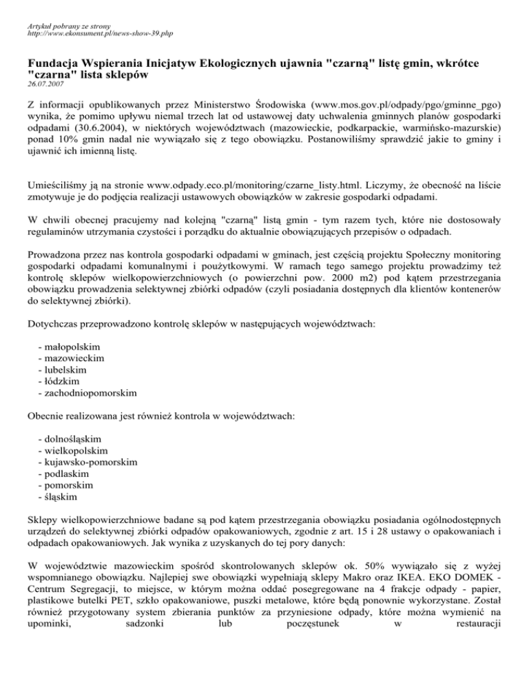 Artykuł pobrany ze strony http://www.ekonsument.pl/news-show-39.php Fundacja Wspierania Inicjatyw Ekologicznych ujawnia "czarną" listę gmin, wkrótce "czarna" lista sklepów 26.07.2007 Z informacji opublikowanych przez Ministerstwo Środowiska (www.mos.gov.pl/odpady/pgo/gminne_pgo) wynika, że pomimo upływu niemal trzech lat od ustawowej daty uchwalenia gminnych planów gospodarki odpadami (30.6.2004), w niektórych województwach (mazowieckie, podkarpackie, warmińsko-mazurskie) ponad 10% gmin nadal nie wywiązało się z tego obowiązku. Postanowiliśmy sprawdzić jakie to gminy i ujawnić ich imienną listę. Umieściliśmy ją na stronie www.odpady.eco.pl/monitoring/czarne_listy.html. Liczymy, że obecność na liście zmotywuje je do podjęcia realizacji ustawowych obowiązków w zakresie gospodarki odpadami. W chwili obecnej pracujemy nad kolejną "czarną" listą gmin - tym razem tych, które nie dostosowały regulaminów utrzymania czystości i porządku do aktualnie obowiązujących przepisów o odpadach. Prowadzona przez nas kontrola gospodarki odpadami w gminach, jest częścią projektu Społeczny monitoring gospodarki odpadami komunalnymi i poużytkowymi. W ramach tego samego projektu prowadzimy też kontrolę sklepów wielkopowierzchniowych (o powierzchni pow. 2000 m2) pod kątem przestrzegania obowiązku prowadzenia selektywnej zbiórki odpadów (czyli posiadania dostępnych dla klientów kontenerów do selektywnej zbiórki). Dotychczas przeprowadzono kontrolę sklepów w następujących województwach: - małopolskim - mazowieckim - lubelskim - łódzkim - zachodniopomorskim Obecnie realizowana jest również kontrola w województwach: - dolnośląskim - wielkopolskim - kujawsko-pomorskim - podlaskim - pomorskim - śląskim Sklepy wielkopowierzchniowe badane są pod kątem przestrzegania obowiązku posiadania ogólnodostępnych urządzeń do selektywnej zbiórki odpadów opakowaniowych, zgodnie z art. 15 i 28 ustawy o opakowaniach i odpadach opakowaniowych. Jak wynika z uzyskanych do tej pory danych: W województwie mazowieckim spośród skontrolowanych sklepów ok. 50% wywiązało się z wyżej wspomnianego obowiązku. Najlepiej swe obowiązki wypełniają sklepy Makro oraz IKEA. EKO DOMEK Centrum Segregacji, to miejsce, w którym można oddać posegregowane na 4 frakcje odpady - papier, plastikowe butelki PET, szkło opakowaniowe, puszki metalowe, które będą ponownie wykorzystane. Został również przygotowany system zbierania punktów za przyniesione odpady, które można wymienić na upominki, sadzonki lub poczęstunek w restauracji IKEA(www.ikea.com/ms/pl_PL/ikea_near_you/ekodomek.html). W województwie lubelskim większość spośród skontrolowanych sklepów nie posiadało ogólnodostępnych pojemników do selektywnej zbiórki.Jednak pozytywne przykłady stanowią tu sklepy Real oraz Tesco. Ten ostatni, oprócz kontenerów, posiada także w Punkcie Obsługi Klienta wyczerpującą informację na temat systemu zbiórki odpadów opakowaniowych. W województwie łódzkim niespełna 40% skontrolowanych sklepów wywiązało się z obowiązku posiadania ogólnodostępnych pojemników do selektywnej zbiórki.Zdecydowania najlepsze praktyki stosuje tu sklep Tesco, który oprócz pojemników do selektywnej zbiórki posiada również obszerne informacje dotyczące obowiązku segregacji odpadów. Ponadto tamtejszy personel jest bardzo dobrze zorientowany nt. postępowania z odpadami (co należy do rzadkości). W województwie małopolskim również około 40% sklepów wypełniło swój ustawowy obowiązek. Najlepiej wywiązują się z niego sklepy OBI oraz IKEA. Najczęściej popełniane błędy to: - brak ustawowo wymaganych informacji, zamieszczonych w obrębie sklepu, tj. o odpadach opakowaniowych oraz systemach ich zbiórki, bądź niekompletność tych informacji; - niekorzystna lokalizacja kontenerów do selektywnej zbiórki (daleko od wejścia do sklepu), ich niewystarczające rozmiary (także rozmiary otworów) lub całkowity brak pojemników do selektywnej zbiórki. Po zestawieniu danych, z badań przeprowadzonych do tej pory, Fundacja Wspierania Inicjatyw Ekologicznych wystosowała pisma do dyrektorów sklepów wielkopowierzchniowych, w których obowiązki wynikające z ustawy nie są przestrzegane, z prośbą o usunięcie naruszenia przepisów. Na skutek interwencji w znacznej części sklepów nieposiadających pierwotnie pojemników do selektywnej zbiórki pojawiły się one, a do FWIE wpłynęła odpowiednia dokumentacja to potwierdzająca (pisma wraz z załączonymi zdjęciami). W przypadku braku wyjaśnień i informacji nt. usunięcia naruszenia przepisów przez sklepy do tego zobowiązane, FWIE wystąpiła do Inspekcji Ochrony Środowiska z wnioskami o przeprowadzenie kontroli. Kolejnym etapem będzie więc przeprowadzenie przez Wojewódzkie Inspektoraty Ochrony Środowiska kontroli w zakresie przestrzegania przez sklepy wielkopowierzchniowe przepisów ustawy z dn. 11 maja 2001 r. o opakowaniach i odpadach opakowaniowych, a w przypadku potwierdzenia nieprawidłowości nałożenie kary. Więcej informacji: Agata Pustelnik Fundacja Wspierania Inicjatyw Ekologicznych ul. Czysta 17/4, 31-121 Kraków tel./fax: 012 6315730, 6315731, 6315732 www.fwie.eco.pl Na podstawie: Wydawnictwo Zielone Brygady (http://www.zb.eco.pl )