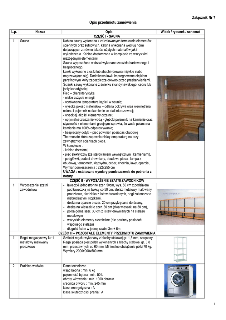 Załącznik Nr 7 Opis przedmiotu zamówienia L.p. Nazwa 1. Sauna 1. WyposaŜenie szatni zawodników 1. Regał magazynowy Nr 1 metalowy malowany proszkowo 2. Pralnico-wirówka Opis CZĘŚĆ I - SAUNA Kabina sauny wykonana z zaizolowanych termicznie elementów ściennych oraz sufitowych. kabina wykonana według norm dotyczących zarówno jakości uŜytych materiałów jak i wykończenia. Kabina dostarczona w komplecie ze wszystkimi niezbędnymi elementami. Sauna wyposaŜona w drzwi wykonane ze szkła hartowanego i bezpiecznego. Ławki wykonane z osiki lub abachi (drewna miękkie słabo nagrzewające się). Dodatkowo ławki impregnowane olejkiem parafinowym który zabezpiecza drewno przed przebarwieniami. Ścianki sauny wykonane z świerku skandynawskiego, cedru lub jodły kanadyjskiej. Piec – charakterystyka: - niskie zuŜycie energii; - wyrównana temperatura kąpieli w saunie; - wysoka jakość materiałów – odlana pokrywa oraz wewnętrzna osłona i pojemnik na kamienie ze stali nierdzewnej; - wysokiej jakości elementy grzejne; - optymalne zraszanie wodą - głęboki pojemnik na kamienie oraz styczność z elementami grzejnymi sprawia, Ŝe woda polana na kamienie ma 100% odparowywanie; - bezpieczny dotyk – piec powinien posiadać obudowę Thermosafe która zapewnia niską temperaturę na przy zewnętrznych ściankach pieca. W komplecie : - kabina drzwiami, - piec elektryczny (ze sterowaniem wewnętrznym i kamieniami), - podgłówki, podest drewniany, obudowa pieca, lampa z obudową, termometr, klepsydra, ceber, chochla, ławy, oparcie, Wymiar pomieszczenia : 222x255 cm UWAGA : ostateczne wymiary pomieszczenia do pobrania z natury CZĘŚĆ II - WYPOSAśENIE SZATNI ZAWODNIKÓW - ławeczki jednostronne szer. 50cm, wys. 50 cm z podziałem pod ławeczką na boksy co 50 cm, stelaŜ metalowy malowany proszkowo, siedzisko z listew drewnianych, nogi zakończone niebrudzącymi stopkami, - deska na oparcie o szer. 20 cm przykręcana do ściany, - deska na wieszaki o szer. 30 cm (dwa wieszaki na 50 cm), - półka górna szer. 30 cm z listew drewnianych na stelaŜu metalowym - wszystkie elementy niezaleŜne (nie powinny posiadać wspólnego stelaŜu) - długość ścian w jednej szatni 3m + 6m CZĘŚĆ III – POZOSTAŁE ELEMENTY PRZEDMIOTU ZAMÓWIENIA Szkielet regału wykonany z blachy stalowej gr. 1,5 mm, skręcany. Regał posiada pięć półek wykonanych z blachy stalowej gr. 0,8 mm, przestawnych co 60 mm. Minimalne obciąŜenie półki 70 kg. Wymiary 2000x900x500 mm Widok / rysunek / schemat Dane techniczne wsad bębna : min. 6 kg pojemność bębna : min. 50 l. obroty wirowania : min. 1000 obr/min średnica otworu : min. 245 mm klasa energetyczna : A klasa skuteczności prania : A 1 3. Lustro Lustro bez ramki z fazowanymi brzegami Wymiary : 40x60 cm 4. Kosz na zuŜyte ręczniki papierowe Wykonany z lekkich prętów metalowych powlekanych białym PCV, uchwyty umoŜliwiające przykręcenie do ściany, dostosowany do jednorazowych worków polietylenowych, pojemność 47 litrów 5. Kosz na śmieci metalowy – pojemność 12 litrów – pokrywa otwierana przyciskiem pedałowym – zaopatrzony w wyjmowane plastikowe wiadro 6. Kosz na śmieci z tworzywa sztucznego – pojemność 15 litrów – wykonany z tworzywa sztucznego – uchylna pokrywa – dostosowany do jednorazowych worków – kolor biały 7. Szczotka do wc – wykonana z tworzywa sztucznego – kształt szczotki pozwalający na czyszczenie wewnętrznej krawędzi muszli 8. Pojemnik na mydło w płynie 9. Pojemnik na ręczniki papierowe – pojemność zbiornika min 400 ml – mydło uzupełniane z kanistra – kolor okienka do kontroli poziomu mydła: niebieski – wykonany z wysokiej jakości tworzywa ABS – zamykany na kluczyk – kolor biały – pojemność min 400 szt. ręczników – wykonany z tworzywa ABS – okienko do kontroli ilości ręczników w pojemniku niebieskie – zamykany na kluczyk – kolor biały 10. Uchwyt na papier toaletowy - uchwyt wykonany z blachy stalowej - kolor biały 11. Szafka ubraniowa z ławeczką Szafy ubraniowe z ławeczkami. Wymiary; wys. 180cm; szer. 30cm; głębokość 49cm Drzwi ryglowane w 3 miejscach- zamykane na klucz. Ławeczki wys. 40,50cm, głębokość 74,50cm. StelaŜ stalowy, siedziska listwy drewniane, nogi zakończone niebrudzącymi ochronnymi podkładkami, kolor korpusu szary, kolor drzwi niebieski. Szafki z podziałem jak na rysunku z prawej strony. 2 12. Stół stacjonarny do masaŜu Konstrukcji stołu : system linek, który wpływa na stabilność i łatwość obsługi stołu oraz dodatkowe podparcie środkowej części stołu, zwiększające nośność. Elementy konstrukcyjne wykonane z profili aluminiowych o duŜym przekroju, dodatkowe podparcie na środku i wzmocniona płyta blatów gwarantująca masaŜyście komfort i poczucie bezpieczeństwa podczas wykonywania zabiegów. Dane techniczne : Długość (bez podgłówka) 180cm Szerokość 60cm Wysokość regulowana skokowo co 5cm Dopuszczalne obciąŜenie 250kg 13. Szafa metalowa zamykana Wieniec szafy wykonany z blachy stalowej gr. 1,0 mm, pozostałe elementy z blachy gr. 0,8 mm. Drzwi skrzydłowe ze schowanymi zawiasami. Uchwyt drzwiowy z zamkiem zabezpieczającym. Cztery przestawne co 25 mm półki. Wymiary 2000x100x435 mm Kolor beŜowy 15. Blat na zawiasach opuszczany 16. Krzesło ISO tapicerowane Płyta meblowa o gr. 38 mm , krawędzie oklejone obrzeŜem PCV gr. 2 mm, na zawiasach mocowany do ściany wzdłuŜ dłuŜszej krawędzi. Wymiary 600x400 mm. Krzesło o metalowej ramie, lakierowanej na CZARNO, z miękkim tapicerowanym siedziskiem i oparciem. Elementy plastikowe czarne 17. Biurko jednoszafkowe 18. Krzesło obrotowe tapicerowane 19. Szafa aktowa metalowa Biurko wykonane z płyty wiórowej laminowanej, gr. 18 mm wąskie płaszczyzny wykończone obrzeŜem PCV gr. 2 mm. Do mocowania szuflad prowadnice metalowe-rolkowe umoŜliwiające swobodne wysuwanie szuflady podczas jej uŜytkowania. Blat mocowany do korpusu me