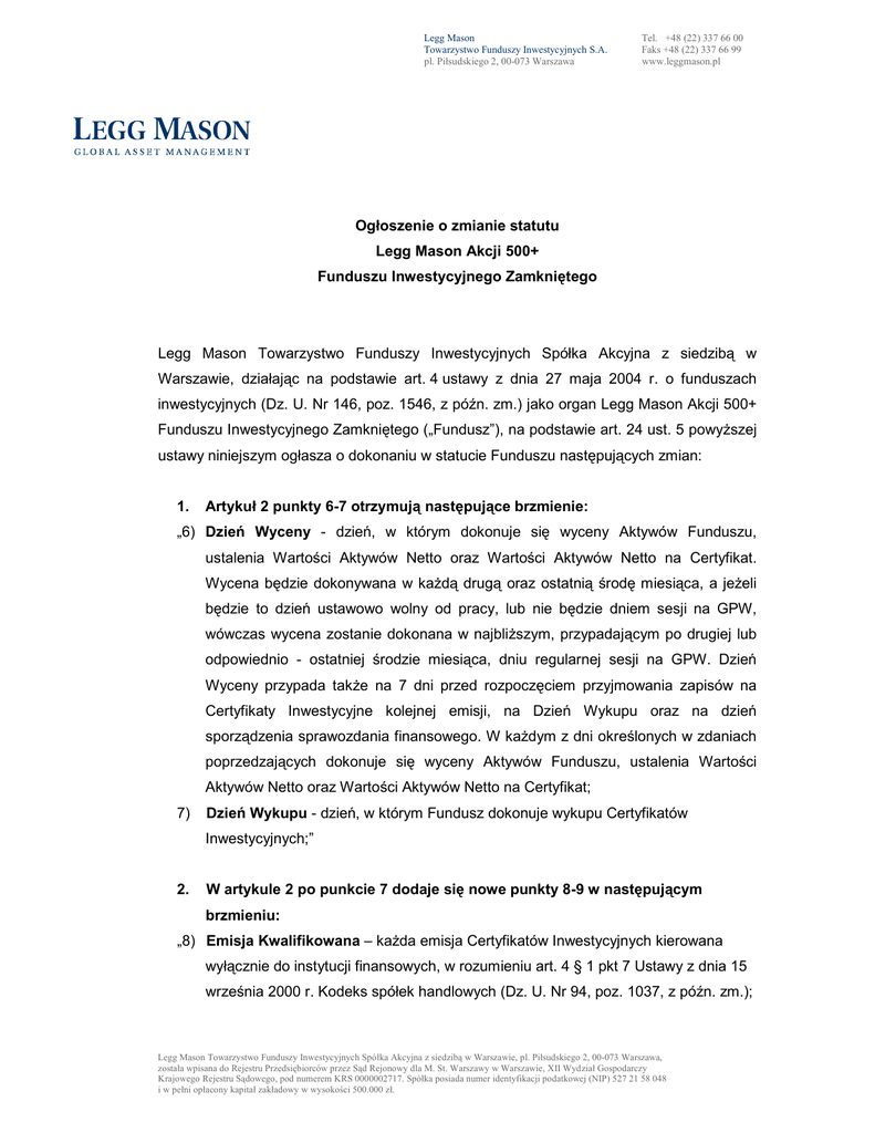Legg Mason Towarzystwo Funduszy Inwestycyjnych S.A. pl. Piłsudskiego 2, 00-073 Warszawa Tel. +48 (22) 337 66 00 Faks +48 (22) 337 66 99 www.leggmason.pl Ogłoszenie o zmianie statutu Legg Mason Akcji 500+ Funduszu Inwestycyjnego Zamkniętego Legg Mason Towarzystwo Funduszy Inwestycyjnych Spółka Akcyjna z siedzibą w Warszawie, działając na podstawie art. 4 ustawy z dnia 27 maja 2004 r. o funduszach inwestycyjnych (Dz. U. Nr 146, poz. 1546, z późn. zm.) jako organ Legg Mason Akcji 500+ Funduszu Inwestycyjnego Zamkniętego („Fundusz”), na podstawie art. 24 ust. 5 powyższej ustawy niniejszym ogłasza o dokonaniu w statucie Funduszu następujących zmian: 1. Artykuł 2 punkty 6-7 otrzymują następujące brzmienie: „6) Dzień Wyceny - dzień, w którym dokonuje się wyceny Aktywów Funduszu, ustalenia Wartości Aktywów Netto oraz Wartości Aktywów Netto na Certyfikat. Wycena będzie dokonywana w każdą drugą oraz ostatnią środę miesiąca, a jeżeli będzie to dzień ustawowo wolny od pracy, lub nie będzie dniem sesji na GPW, wówczas wycena zostanie dokonana w najbliższym, przypadającym po drugiej lub odpowiednio - ostatniej środzie miesiąca, dniu regularnej sesji na GPW. Dzień Wyceny przypada także na 7 dni przed rozpoczęciem przyjmowania zapisów na Certyfikaty Inwestycyjne kolejnej emisji, na Dzień Wykupu oraz na dzień sporządzenia sprawozdania finansowego. W każdym z dni określonych w zdaniach poprzedzających dokonuje się wyceny Aktywów Funduszu, ustalenia Wartości Aktywów Netto oraz Wartości Aktywów Netto na Certyfikat; 7) Dzień Wykupu - dzień, w którym Fundusz dokonuje wykupu Certyfikatów Inwestycyjnych;” 2. W artykule 2 po punkcie 7 dodaje się nowe punkty 8-9 w następującym brzmieniu: „8) Emisja Kwalifikowana – każda emisja Certyfikatów Inwestycyjnych kierowana wyłącznie do instytucji finansowych, w rozumieniu art. 4 § 1 pkt 7 Ustawy z dnia 15 września 2000 r. Kodeks spółek handlowych (Dz. U. Nr 94, poz. 1037, z późn. zm.); Legg Mason Towarzystwo Funduszy Inwestycyjnych Spółka Akcyjna z siedzibą w Warszawie, pl. Piłsudskiego 2, 00-073 Warszawa, została wpisana do Rejestru Przedsiębiorców przez Sąd Rejonowy dla M. St. Warszawy w Warszawie, XII Wydział Gospodarczy Krajowego Rejestru Sądowego, pod numerem KRS 0000002717. Spółka posiada numer identyfikacji podatkowej (NIP) 527 21 58 048 i w pełni opłacony kapitał zakładowy w wysokości 500.000 zł. 9) Emisja Zwykła – każda emisja Certyfikatów Inwestycyjnych kierowana do osób fizycznych, osób prawnych i jednostek organizacyjnych nieposiadających osobowości prawnej:” 3. W artykule 2 dotychczasowe punkty 8-27 otrzymują nowe kolejne numery: 1029. 4. Artykuł 8 ust. 1 otrzymuje następujące brzmienie: „1) Certyfikaty Inwestycyjne są emitowanymi w serii imiennymi papierami wartościowymi i reprezentują różne prawa majątkowe Uczestników Funduszu określone w Ustawie o Funduszach Inwestycyjnych oraz niniejszym Statucie.” 5. Artykuł 9 ust. 1 otrzymuje następujące brzmienie: „1) Przedmiotem zapisów na Certyfikaty Inwestycyjne będzie nie mniej niż 1.000 i nie więcej niż 300.000 Certyfikatów serii A – emitowanych przez Fundusz w ramach Emisji Zwykłej.” 6. Artykuł 12 ust. 2 otrzymuje następujące brzmienie: „2. Z zastrzeżeniem ust. 4 zapis na Certyfikaty kolejnych emisji może obejmować: 1) minimalnie 100 (słownie: sto) Certyfikatów dla emisji serii B i C; 2) minimalnie 250 (słownie: dwieście pięćdziesiąt) Certyfikatów dla emisji serii D i kolejnych; 3) minimalnie 250 (słownie: dwieście pięćdziesiąt) Certyfikatów dla emisji serii 1 i kolejnych, i maksymalnie wszystkie oferowane Certyfikaty w ramach danej serii. W przypadku, gdy zapis opiewa na większą niż maksymalna liczbę Certyfikatów, przyjmuje się, że zapis został złożony na maksymalną liczbę Certyfikatów.” 7. Artykuł 12 ust. 4 otrzymuje następujące brzmienie: „4. Kolejne emisje Certyfikatów Inwestycyjnych następujące po pierwszej emisji będą oznaczane: 2 1) kolejnymi literami alfabetu, jako Certyfikaty Inwestycyjne serii „B”, „C”, „D”, „E”, […] „Y”, „Z”, „AA”, „AB”, „AC” itd. – emitowane w ramach Emisji Zwykłej; 2) Certyfikaty Inwestycyjne serii „1”, „2”, „3”, „4”, „5”, […], „24”, „25” itd. tj. oznaczone cyfrą arabską – emitowane w ramach Emisji Kwalifikowanej.” 8. W artykule 12 po ust. 6 dodaje się nowy ustęp 7 w następującym brzmieniu: „7. Uprawnionymi do złożenia zapisów na Certyfikaty serii 1 i kolejnych będą instytucje finansowe, w rozumieniu art. 4 § 1 pkt 7 Ustawy z dnia 15 września 2000 r. Kodeks spółek handlowych, zarówno rezydenci jak i nierezydenci w rozumieniu ustawy z dnia 27 lipca 2002 r. – Prawo dewizowe, do których Towarzystwo skieruje imienną propozycję nabycia Certyfikatów danej serii.” 9. W artykule 12 dotychczasowe ustępy 7-10 otrzymują nowe kolejne numery: 811. 10. Artykuł 12 ust. 10 otrzymuje następujące brzmienie: „10. Wpłata na Certyfikaty kolejnych serii powinna zostać dokonana w walucie polskiej, nie później niż w ostatnim dniu składania zapisów.” 11. Artykuł 18 otrzymuje następujące brzmienie: „Artykuł 18 Wykup Certyfikatów emitowanych w ramach Emisji Zwykłej 1. Fundusz będzie wykupywał Certyfikaty emitowane w ramach Emisji Zwykłej. Wykup Certyfikatów następuje na żądanie Uczestnika, w trybie określonym w ust. 2 i następnych w każdym Dniu Wykupu, będącym Dniem Wyceny przypadającym w każdą ostatnią środę miesiąca, a jeżeli dzień ten będzie dniem ustawowo wolnym od pracy, lub nie będzie dniem sesji na GPW, wówczas będzie to dzień będący Dniem Wyceny przypadający w najbliższym po ostatniej środzie miesiąca, dniu regularnej sesji na GPW. 2. Uczestnik może złożyć żądanie wykupu Certyfikatów najpóźniej na 14 dni przed Dniem Wykupu. Żądanie to powinno 