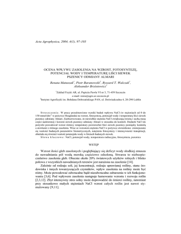 Acta Agrophysica, 2004, 4(1), 97-103 OCENA WPŁYWU ZASOLENIA NA WZROST, FOTOSYNTEZĘ, POTENCJAŁ WODY I TEMPERATURĘ LIŚCI SIEWEK PSZENICY ODMIANY ALMARI Renata Matuszak1, Piotr Baranowski2, Ryszard T. Walczak2, Aleksander Brzóstowicz1 1 Zakład Fizyki AR, ul. PapieŜa Pawła VI nr 3, 71-459 Szczecin e-mail: [email protected] 2 Instytut Agrofizyki im. Bohdana Dobrzańskiego PAN, ul. Doświadczalna 4, 20-290 Lublin S t r e s z c z e n i e . W pracy przedstawiono wyniki badań wpływu NaCl (w stęŜeniach od 0 do 150 mmol⋅dm-3 w poŜywce Hoaglanda) na wzrost, fotosyntezę, potencjał wody i temperaturę liści siewek pszenicy odmiany Almari. Zaobserwowano, Ŝe niewielkie stęŜenia NaCl zwiększają świeŜą i suchą masę części nadziemnej i korzeni siewek pszenicy odmiany Almari w stosunku do kontroli. Dodatek NaCl do poŜywki powodował wzrost róŜnicy temperatury powierzchni liści siewek pszenicy pomiędzy kontrolą a siewkami z róŜnego zasolenia. Wraz ze wzrostem stęŜenia NaCl w poŜywce stwierdzono: zmniejszanie się wartości badanych parametrów biometrycznych, natęŜenia fotosyntezy i intensywności transpiracji, obniŜała się równieŜ wartość potencjału wody w liściach badanych siewek. S ł o w a k l u c z o w e : NaCl, potencjał wody, temperatura radiacyjna, fotosynteza, pszenica WSTĘP Wzrost ilości gleb zasolonych i pogłębiający się deficyt wody słodkiej zmusza do nawadniania pól wodą morską częściowo odsoloną. Stwarza to niebezpieczeństwo zasolenia gleb. Obecnie około 20% światowych uŜytków rolnych i blisko połowa z wszystkich nawadnianych terenów jest naraŜona na zasolenie [14]. ZaleŜnie od rodzaju soli, jej koncentracji, rodzaju uprawianej rośliny, stanu środowiska i innych towarzyszących czynników, wpływ zasolenia na rośliny moŜe być róŜny. MoŜe powodować odwracalne bądź nieodwracalne zaburzenia w ich funkcjonowaniu [3,6]. Pod wpływem zasolenia następuje hamowanie wzrostu i rozwoju roślin [2,3,12]. Zbyt intensywny stres solny moŜe doprowadzić do śmierci rośliny, natomiast przy stosunkowo małych stęŜeniach NaCl wzrost całych roślin jest nawet stymulowany [9,11]. 98 R. MATUSZAK i in. Celem niniejszej pracy było zbadanie wpływu NaCl na wzrost, intensywność fotosyntezy i transpiracji, potencjał wody oraz temperaturę liści siewek pszenicy odmiany Almari. MATERIAŁ Badania prowadzono na siewkach pszenicy ozimej odmiany Almari w warunkach kontrolowanych. Doświadczenie trwało 28 dni. Przygotowano roztwory soli i rozcieńczono je pół na pół z poŜywką Hoaglanda tak, aby końcowe stęŜenia NaCl wynosiły odpowiednio: 25, 50, 75, 100 i 150 mmol·dm-3. Kontrolę stanowił roztwór poŜywki Hoaglanda i wody destylowanej w stosunku 1:1. Ziarniaki rozłoŜono w kiełkownikach (po 100 sztuk), umieszczono w pojemnikach i zalano wcześniej przygotowanymi roztworami. Tak przygotowany materiał umieszczono w minifitotronie (temperatura 20ºC, oświetlenie 200 µmol (fotonów)·m-2·s-1 w zakresie PAR, fotoperiod 12h/12h dzień/noc). Od trzeciego dnia doświadczenia stopniowo (2ºC/dobę) obniŜano temperaturę do +10ºC. METODY Pomiary biometryczne liści i korzeni Po upływie 28 dni wzrostu oznaczono: długość i szerokość pierwszego liścia, długość i liczbę korzeni, świeŜą i suchą masę części nadziemnej i korzeni siewek pszenicy. Długość liści i korzeni mierzono z dokładnością do 1mm a szerokość liści z dokładnością do 0,01mm. Suchą masę badanych obiektów wyznaczono po wysuszeniu ich w cieplarce przez 12 godzin w temperaturze 105ºC. WaŜenie przeprowadzono na wadze laboratoryjnej WPS-36 z dokładnością do 0,0001g. Średnie wartości parametrów biometrycznych liści i korzeni siewek traktowanych NaCl wyraŜono w procentach wartości tych parametrów u roślin kontrolnych. Ocena fotosyntezy Podstawowe parametry fotosyntezy, natęŜenie asymilacji CO2 i intensywność transpiracji liści siewek pszenicy, mierzono za pomocą gazoanalizatora LCA-4. Pomiary wykonano w 6 powtórzeniach dla kaŜdego wariantu doświadczenia. Pomiar potencjału wody Potencjał wody w roślinie mierzono przyrządem wykonanym w Instytucie Agrofizyki PAN w Lublinie [10], z wykorzystaniem komór psychrometrycznych firmy Wescor Inc., USA. Metoda pomiaru oparta jest na wyznaczaniu zawartości pary wodnej w próbce, który to parametr w zakresie od zera do pięćdziesięciu OCENA WPŁYWU ZASOLENIA 99 barów jest liniowo związany z potencjałem. W stanie równowagi między fazą stałą i gazową potencjał wody w próbce jest równy potencjałowi pary wodnej. Tak więc, mierząc względną wilgotność powietrza w otoczeniu termozłącza moŜna określić potencjał pary wodnej w próbce. Pomiar temperatury radiacyjnej Pomiaru temperatury radiacyjnej powierzchni liści siewek pszenicy dokonano kamerą termograficzną firmy AGEMA (model 880LWB), pracującą w zakresie 813µm. Dodatkowo system pomiarowy wyposaŜony był w kamerę CCD pracującą w zakresie światła widzialnego. Dokonano jednoczesnej rejestracji zobrazowań roślin w dwóch kiełkownikach: jeden z roztworem kontrolnym a drugi z roztworem o odpowiednim stęŜeniu NaCl. W trakcie pomiarów w pomieszczeniu utrzymywano temperaturę 20oC i wilgotność względną 60%. Wszystkie rejestracje wykonano z odległości 1,20 m. Obiektywy kamery ustawione były prostopadle do mierzonych powierzchni liści. WYNIKI I DYSKUSJA Na rysunku 1 przedstawiono wpływ NaCl na rozmiary pierwszego liścia oraz świeŜą i suchą masę części nadziemnej siewek pszenicy Almari. Zastosowane w doświadczeniu stęŜenia NaCl (poza najwyŜszym – 150 mmol·dm-3) zwiększają średnią długość pierwszego liścia w stosunku do kontroli. Szerokość pierwszego liścia zmniejsza się wraz ze wzrostem stęŜenia NaCl w poŜywce. ŚwieŜa i sucha masa części nadziemnej siewek pszenicy rosnących „na roztworach” o niewielkim stęŜeniu NaCl jest większa od kontroli. 