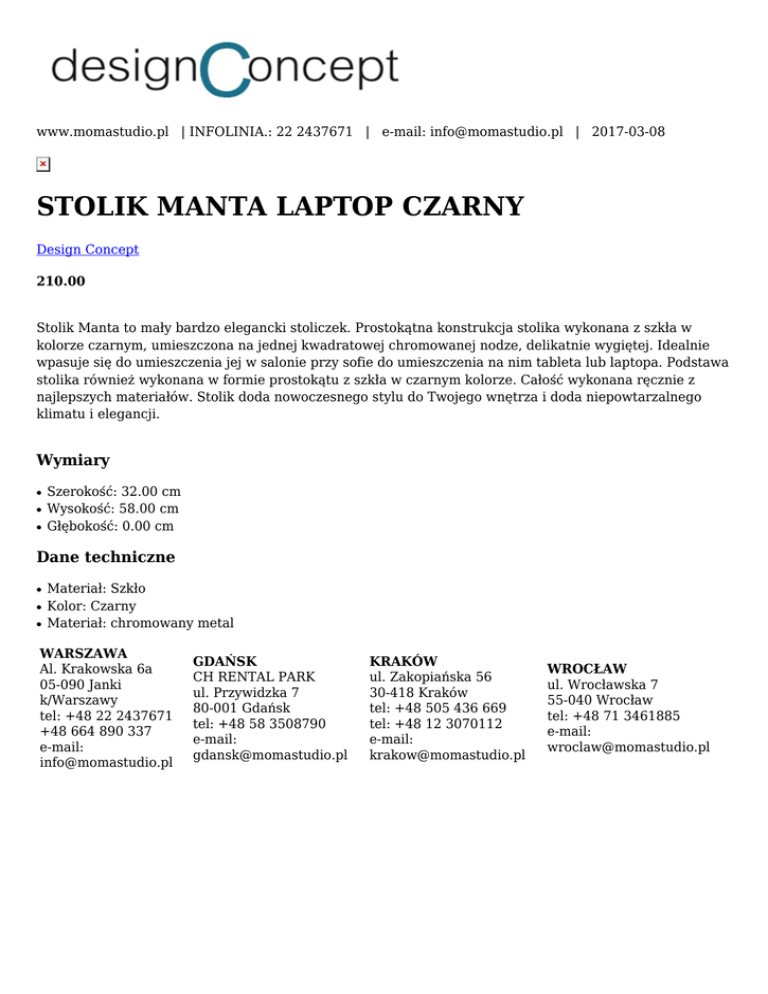 www.momastudio.pl | INFOLINIA.: 22 2437671 | e-mail: [email protected] | 2017-03-08 STOLIK MANTA LAPTOP CZARNY Design Concept 210.00 Stolik Manta to mały bardzo elegancki stoliczek. Prostokątna konstrukcja stolika wykonana z szkła w kolorze czarnym, umieszczona na jednej kwadratowej chromowanej nodze, delikatnie wygiętej. Idealnie wpasuje się do umieszczenia jej w salonie przy sofie do umieszczenia na nim tableta lub laptopa. Podstawa stolika również wykonana w formie prostokątu z szkła w czarnym kolorze. Całość wykonana ręcznie z najlepszych materiałów. Stolik doda nowoczesnego stylu do Twojego wnętrza i doda niepowtarzalnego klimatu i elegancji. Wymiary ● ● ● Szerokość: 32.00 cm Wysokość: 58.00 cm Głębokość: 0.00 cm Dane techniczne ● ● ● Materiał: Szkło Kolor: Czarny Materiał: chromowany metal WARSZAWA Al. Krakowska 6a 05-090 Janki k/Warszawy tel: +48 22 2437671 +48 664 890 337 e-mail: [email protected] GDAŃSK CH RENTAL PARK ul. Przywidzka 7 80-001 Gdańsk tel: +48 58 3508790 e-mail: [email protected] KRAKÓW ul. Zakopiańska 56 30-418 Kraków tel: +48 505 436 669 tel: +48 12 3070112 e-mail: [email protected] WROCŁAW ul. Wrocławska 7 55-040 Wrocław tel: +48 71 3461885 e-mail: [email protected]