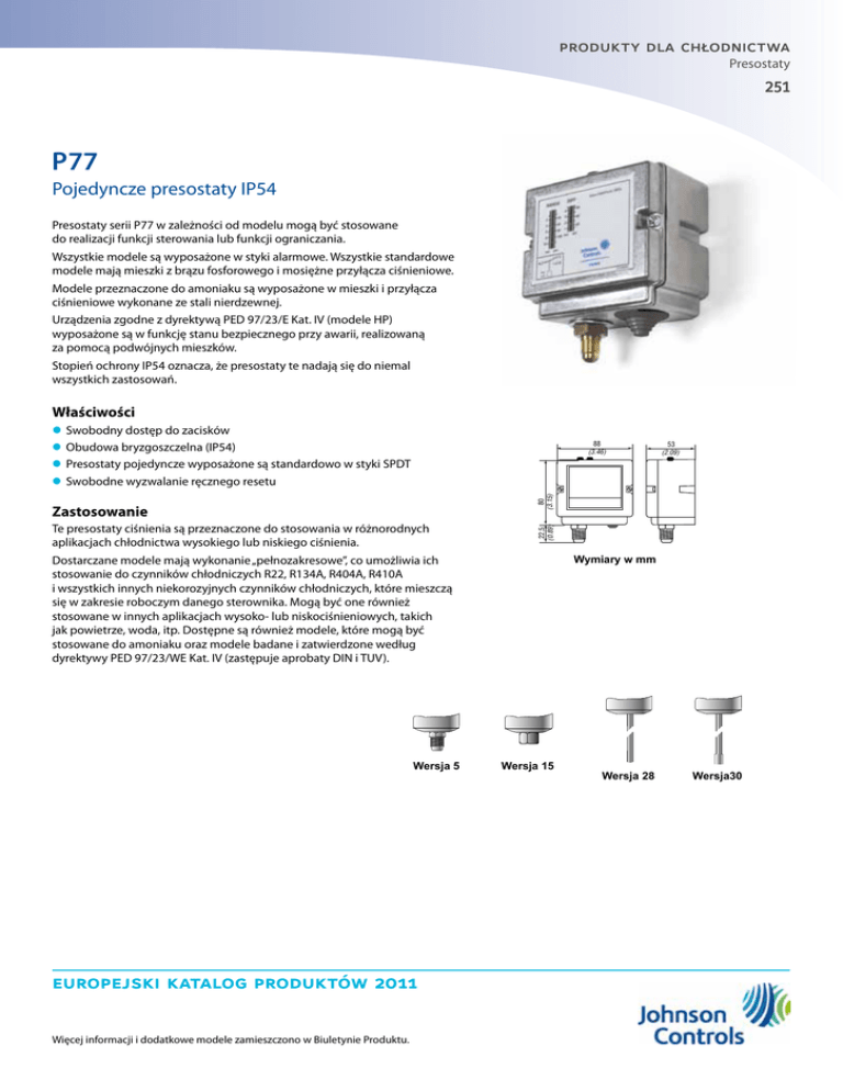 produkty dla chłodnictwa Presostaty 251 P77 Pojedyncze presostaty IP54 Presostaty serii P77 w zależności od modelu mogą być stosowane do realizacji funkcji sterowania lub funkcji ograniczania. Wszystkie modele są wyposażone w styki alarmowe. Wszystkie standardowe modele mają mieszki z brązu fosforowego i mosiężne przyłącza ciśnieniowe. Modele przeznaczone do amoniaku są wyposażone w mieszki i przyłącza ciśnieniowe wykonane ze stali nierdzewnej. Urządzenia zgodne z dyrektywą PED 97/23/E Kat. IV (modele HP) wyposażone są w funkcję stanu bezpiecznego przy awarii, realizowaną za pomocą podwójnych mieszków. Stopień ochrony IP54 oznacza, że presostaty te nadają się do niemal wszystkich zastosowań. Właściwości zz Swobodny dostęp do zacisków zz Obudowa bryzgoszczelna (IP54) zz Presostaty pojedyncze wyposażone są standardowo w styki SPDT zz Swobodne wyzwalanie ręcznego resetu Zastosowanie Dostarczane modele mają wykonanie „pełnozakresowe”, co umożliwia ich stosowanie do czynników chłodniczych R22, R134A, R404A, R410A i wszystkich innych niekorozyjnych czynników chłodniczych, które mieszczą AC się w zakresie roboczym danego sterownika. Mogą być one również Line~ A max. 20 A B Line~ stosowane w innych aplikacjach wysoko- lub niskociśnieniowych, takich max. 20 A jak powietrze, woda, itp. Dostępne są również modele, które mogą być stosowane do amoniaku oraz modele badane i zatwierdzone według dyrektywy PED 97/23/WE Kat. IV (zastępuje aprobaty DIN i TUV). Wersja 5 europejski katalog produktów 2011 Więcej informacji i dodatkowe modele zamieszczono w Biuletynie Produktu. 22,5 (0.89) Te presostaty ciśnienia są przeznaczone do stosowania w różnorodnych aplikacjach chłodnictwa wysokiego lub niskiego ciśnienia. 88 (3.46) 53 (2.09) 80 (3.15) 53 (2.09) 22,5 (0.89) 80 (3.15) 88 (3.46) Wymiary w mm C MB M AC A max. 20 AB Line~ max. 20 A Line~ Wersja 15 C B M B A A M~ max. 20 AC Line max. 20 A Line~ Wersja 28 B C B B Wersja30 produkty dla chłodnictwa Presostaty 252 P77 Pojedyncze presostaty IP54 Kody zamówień Zakres (bar) Histereza (bar) P77AAA-9300 -0.5 do 7 0.5 do 3 P77AAA-9301 -0.2 do 10 1 do 4.5 P77AAA-9302 -0.3 do 2 0.4 do 1.5 P77AAA-9320* -0.5 do 7 0.5 do 3 P77AAA-9350 3 do 30 3 do 12 P77AAA-9351 3.5 do 21 2 do 5.5 P77AAA-9370* 3 do 30 3 do 12 P77AAA-9371* 3.5 do 21 2 do 5.5 P77AAA-9400 -0.5 do 7 0.5 do 3 P77AAA-9450 3 do 30 3 do 12 P77AAA-9451 3.5 do 21 2 do 5.5 P77AAA-9700 -0.5 do 7 0.5 do 3 P77AAA-9750 3 do 30 3 do 12 Połączenia /działanie Wersja Pakowanie Czynnik chłodniczy Cechy dodatkowe ind. 1 5 zbiorcze --- niekorozyjne ind. Is P77AAA-9350 opakowanie zbiorcze zbiorcze 30 ind. 2 15 P77AAA-9800 -0.5 do 7 0.5 do 3 1 P77AAA-9850 3 do 30 3 do 12 2 28 Uwagi * : Tylko zamówienia w opakowaniach zbiorczych europejski katalog produktów 2011 Więcej informacji i dodatkowe modele zamieszczono w Biuletynie Produktu. Is P77AAA-9351 opakowanie zbiorcze --- P77AAA-9300 przyłącze lutowane ¼ “ODF --- PP77AAA-9350 przyłącze lutowane ¼ “ODF --- P77AAA-9351 przyłącze lutowane ¼ “ODF NH3 zbiorcze Is P77AAA-9300 opakowanie zbiorcze --- 2 1 Aprobata PED niekorozyjne ----P77AAA-9300 przyłącze lutowane 6 mm ODF P77AAA-9350 przyłącze lutowane 6 mm ODF --- produkty dla chłodnictwa Presostaty 253 P77 Pojedyncze presostaty IP54 Kody zamówień Zakres (bar) Histereza (bar) Połączenia /działanie Wersja Pakowanie Czynnik chłodniczy Cechy dodatkowe Aprobata PED P77 Presostaty z automatycznym resetem (Wächter, łącznie z zespołem płyty blokującej) P77AAW-9300 -0.5 do +7 0.5 do 3 P77AAW-9301* -0.5 do +7 0.5 do 3 P77AAW-9320* -0.5 do +7 0.5 do 3 P77AAW-9350 3.5 do 12 3 do 30 --1 --- ind. Pozłacane styki, stałe nastawy: otwieranie 0,5 bara; zamykanie: 1,25 bara zbiorcze P77AAW-9300 w opakowaniu zbiorczym niekorozyjne Pozłacane styki, stałe nastawy: otwieranie 7 barów; zamykanie: 11 barów --- 3 do 30 3.5 do 12 P77AAW-9355 3 do 42 4 do 12 5 ind. P77AAW-9370* 3 do 30 3.5 do 12 --- zbiorcze P77AAW-9700 -0.5 do +7 0.5 do 3 1 P77AAW-9750 3 do 30 3.5 do 12 2 P77AAW-9800 -0.5 do +7 0.5 do 3 1 P77AAW-9850 3 do 30 3.5 do 12 P77AAW-9851* 3 do 30 3.5 do 12 P77AAW-9855 3 do 42 4 do 12 2 15 NH3 28 P77AAW-9350 w opakowaniu zbiorczym ind. 2 --- ind. P77AAW-9353* --- --- --- P77AAW-9300 przyłącze lutowane - 6 mm ODM --- • P77AAW-9350 przyłącze lutowane - 6 mm ODM niekorozyjne 2 Pozłacane styki, stałe nastawy: otwieranie 7 barów; zamykanie: 11 barów, z przyłączem lutowanym 6 mm ODM --- P77 presostaty z resetem ręcznym HP P77BCA-9300 5 P77BCA-9400 30 P77BCA-9700 -0.5 do +7 --- 1 15 P77BCB-9300 5 P77BCB-9800 28 niekorozyjne ind. ind. P77BCA-9300 przyłącze lutowane ¼ “ ODF NH3 niekorozyjne --- P77BCB -9300 przyłącze lutowane - 6 mm ODM P77 Presostaty z resetem ręcznym HP P77BEA-9350 P77BEA-9450 5 3 do 30 --- 3 P77BEA-9750 30 15 ind. ind. niekorozyjne NH3 --P77BEA-9350 przyłącze lutowane ¼ “ ODF --- --- P77 Presostat (Begrenzer, łącznie z zespołem płyty blokującej) P77BEB-9350 3 do 30 P77BEB-9355 3 do 42 P77BEB-9370* P77BEB-9750 3 do 30 5 --- 3 P77BEB-9850 P77BEB-9855 niekorozyjne zbiorcze 15 28 3 do 42 ind. P77BEB-9350 w opakowaniu zbiorczym NH3 ind. --- niekorozyjne --- P77BEB-9350 przyłącze lutowane - 6 mm ODM --- P77 presostat (Sicherheltsdruckbegrenzer, łącznie z zespołem płyty blokującej) P77BES-9350 P77BES-9370 P77BES-9750 5 3 do 30 --- P77BES-9850 3 ind. zbiorcze niekorozyjne 15 ind. NH3 28 ind. niekorozyjne Uwaga * : Tylko zamówienia w opakowaniach zbiorczych europejski katalog produktów 2011 Więcej informacji i dodatkowe modele zamieszczono w Biuletynie Produktu. --- P77BES-9350 przyłącze lutowane - 6 mm ODM