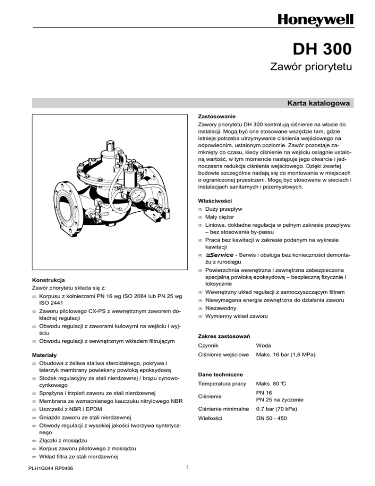 DH 300 Zawór priorytetu Karta katalogowa Zastosowanie Zawory priorytetu DH 300 kontrolują ciśnienie na wlocie do instalacji. Mogą być one stosowane wszędzie tam, gdzie istnieje potrzeba utrzymywanie ciśnienia wejściowego na odpowiednim, ustalonym poziomie. Zawór pozostaje zamknięty do czasu, kiedy ciśnienie na wejściu osiągnie ustaloną wartość, w tym momencie następuje jego otwarcie i jednoczesna redukcja ciśnienia wejściowego. Dzięki zwartej budowie szczególnie nadają się do montowania w miejscach o ograniczonej przestrzeni. Mogą być stosowane w sieciach i instalacjach sanitarnych i przemysłowych. bar Właściwości • DuŜy przepływ • Mały cięŜar • Liniowa, dokładna regulacja w pełnym zakresie przepływu – bez stosowania by-passu • Praca bez kawitacji w zakresie podanym na wykresie kawitacji • - Serwis i obsługa bez konieczności demontaŜu z rurociągu • Powierzchnia wewnętrzna i zewnętrzna zabezpieczona specjalną powłoką epoksydową – bezpieczną fizycznie i toksycznie Konstrukcja Zawór priorytetu składa się z: • Wewnętrzny układ regulacji z samoczyszczącym filtrem • Korpusu z kołnierzami PN 16 wg ISO 2084 lub PN 25 wg ISO 2441 • Niewymagana energia zewnętrzna do działania zaworu • Niezawodny • Zaworu pilotowego CX-PS z wewnętrznym zaworem dokładnej regulacji • Wymienny wkład zaworu • Obwodu regulacji z zaworami kulowymi na wejściu i wyjściu Zakres zastosowań • Obwodu regulacji z wewnętrznym wkładem filtrującym Materiały • Obudowa z Ŝeliwa staliwa sferoidalnego, pokrywa i talerzyk membrany powlekany powłoką epoksydową Czynnik Woda Ciśnienie wejściowe Maks. 16 bar (1,6 MPa) Dane techniczne • StoŜek regulacyjny ze stali nierdzewnej / brązu cynowocynkowego Temperatura pracy Maks. 80 °C Ciśnienie PN 16 PN 25 na Ŝyczenie • Uszczelki z NBR i EPDM Ciśnienie minimalne 0.7 bar (70 kPa) • Gniazdo zaworu ze stali nierdzewnej Wielkości DN 50 - 450 • SpręŜyna i trzpień zaworu ze stali nierdzewnej • Membrana ze wzmacnianego kauczuku nitrylowego NBR • Obwody regulacji z wysokiej jakości tworzywa syntetycznego • Złączki z mosiądzu • Korpus zaworu pilotowego z mosiądzu • Wkład filtra ze stali nierdzewnej PLH1G044 RP0406 1 Zawór priorytetu DH 300 Zasada działania Przy braku ciśnienia zawór jest zamknięty. Po otwarciu zasilania, woda płynie do sekcji wlotowej i wzrastające ciśnienie otwiera zawór, a woda moŜe przepłynąć do części wylotowej. Przez precyzyjny zawór regulujący wbudowany w zawór pilotowy ciśnienie na wlocie zwiększa ciśnienie w komorze ponad przeponą. Poddana wpływowi ciśnienia wlotowego powierzchnia przepony jest większa od powierzchni grzyba zaworu, który jest pod wpływem tego samego ciśnienia, co powoduje zamknięcie zaworu. JeŜeli ciśnienie na wejściu osiągnie wartość ciśnienia ustawionego na zaworze pilotowym, zawór pilotowy otworzy połączenie pomiędzy komorą membrany a wylotem. Ciśnienie w komorze przepony spadnie i zawór się otworzy. JeŜeli ciśnienie na wejściu spadnie poniŜej ustawionego poziomu otwarcia, zawór pilotowy się zamknie a rosnące ciśnienie w komorze zamknie zawór. Oznaczenia DH 300 - ... A = kołnierz, PN 16, ISO 2084 PN 25 na Ŝyczenie Rozmiar przyłącza Wielkość CięŜar Wymiary (mm) DN 50 65 80 100 150 200 250 300 350 400 450 ok. kg L H h 14 230 235 83 15 292 294 93 24 310 400 100 39 350 433 110 82 480 558 143 159 600 650 173 247 730 823 205 407 850 944 230 512 980 990 260 824 1100 1250 290 947 1200 1250 310 40 40 90 160 350 480 970 1400 1900 2500 3150 43 43 103 167 407 676 1160 1600 1600 3300 3300 Przepływ Qmaks (m3/h - V=5.5 m/s) kvs Akcesoria FY 69 P 5 0 bar 15 16 Filtr Z podwójną siatką, korpus z Ŝeliwa szarego, powlekany proszkowo wewnątrz i na zewnątrz A = wielkość oczka siatki ok. 0.5 mm F 76 S-F FY 69 P Filtr z płukaniem wstecznym 10 Korpus i osłona filtra z brązu cynowocynkowego. Dostępny w wielkościach DN 65 do DN 100, z siatką 100 µm lub 200 µm RV 283 P Zawór zwrotny Korpus z Ŝeliwa szarego, powlekany proszkowo wewnątrz i na zewnątrz F 76 S-F RV 283 P 2 PLH!G044 RP0406 Zawór priorytetu DH 300 Przykłady instalacji Zawór DH300 utrzymuje minimalne Ŝądane ciśnienie w wyŜej połoŜonej strefie, nawet w przypadku wzrostu poboru wody. Zawór DH300 utrzymuje odpowiednie ciśnienie po stronie pomp, chroniąc je przed nadmiernym przepływem, kawitacją, oraz uderzeniem hydraulicznym podczas opróŜniania sieci. Zasady instalacji Typowe zastosowania • Po obu stronach zaworu zamontować zawory odcinające Zawory priorytetu DH 300 są przeznaczone do instalacji centralnego zasilania w wodę, zarówno dla obiektów mieszkalnych jak równieŜ do instalacji przemysłowych umoŜliwia to - serwis i obsługę bez konieczności demontaŜu instalacji • Przed regulatorem zamontować filtr zgrubny Mogą być instalowane w: • Instalacjach zasilania w wodę pitną np.: do utrzymywania ciśnienia na wejściu do sieci zasilającej ochrona przed większymi zanieczyszczeniami • Montować zgodnie z kierunkiem strzałki na korpusie • Przy priorytecie zasilania wewnętrznych instalacji ppoŜ. • Zapewnić łatwy dostęp • Systemach zasilania w wysokich budynkach • Górnictwie uproszczenie obsługi I kontroli • Przygotować złącze pośrednie na wypadek wyjęcia do serwisu. Wykres przepływu PLH!G044 RP0406 3 Zawór priorytetu DH 300 Części zamienne do zaworu priorytetu DH 300 (od 2002r.) Opis Nr kat. Wymienny zawór pilotowy DN 50 - 450 CX-PS Uszczelki 0903750 0903751 0903752 0903753 0903754 0903755 0903756 0903757 0903758 0903759 0903760 Manometr Honeywell Sp. z o.o. ul. Domaniewska 39B 02-672 Warszawa tel. 0-22 6060 900 faks 0-22 60 60 901, 902 Wielkość DN 50 DN 65 DN 80 DN 100 DN 150 DN 200 DN 250 DN 300 DN 350 DN 400 DN 450 M 07 K-A16 http://www.honeywell.com.pl 4 PLH!G044 RP0406