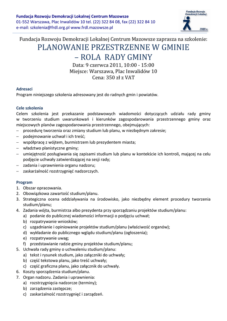 Fundacja Rozwoju Demokracji Lokalnej Centrum Mazowsze 01-552 Warszawa, Plac Inwalidów 10 tel. (22) 322 84 08, fax (22) 322 84 10 e-mail: [email protected] www.frdl.mazowsze.pl Fundacja Rozwoju Demokracji Lokalnej Centrum Mazowsze zaprasza na szkolenie: PLANOWANIE PRZESTRZENNE W GMINIE – ROLA RADY GMINY Data: 9 czerwca 2011, 10:00 - 15:00 Miejsce: Warszawa, Plac Inwalidów 10 Cena: 350 zł z VAT Adresaci Program niniejszego szkolenia adresowany jest do radnych gmin i powiatów. Cele szkolenia Celem szkolenia jest przekazanie podstawowych wiadomości dotyczących udziału rady gminy w tworzeniu studium uwarunkowao i kierunków zagospodarowania przestrzennego gminy oraz miejscowych planów zagospodarowania przestrzennego, obejmujących: procedurę tworzenia oraz zmiany studium lub planu, w niezbędnym zakresie; podejmowanie uchwał i ich treśd; współpracę z wójtem, burmistrzem lub prezydentem miasta; władztwo planistyczne gminy; umiejętnośd posługiwania się zapisami studium lub planu w kontekście ich kontroli, mającej na celu podjęcie uchwały zatwierdzającej na sesji rady; zadania i uprawnienia organu nadzoru; zaskarżalnośd rozstrzygnięd nadzorczych. Program 1. Obszar opracowania. 2. Obowiązkowa zawartośd studium/planu. 3. Strategiczna ocena oddziaływania na środowisko, jako niezbędny element procedury tworzenia studium/planu; 4. Zadania wójta, burmistrza albo prezydenta przy sporządzaniu projektów studium/planu: a) podanie do publicznej wiadomości informacji o podjęciu uchwał; b) rozpatrywanie wniosków; c) uzgadnianie i opiniowanie projektów studium/planu (właściwośd organów); d) wykładanie do publicznego wglądu studium/planu (ogłoszenia); e) rozpatrywanie uwag; f) przedstawianie radzie gminy projektów studium/planu; 5. Uchwała rady gminy o uchwaleniu studium/planu: a) tekst i rysunek studium, jako załączniki do uchwały; b) częśd tekstowa planu, jako treśd uchwały; c) częśd graficzna planu, jako załącznik do uchwały. 6. Koszty sporządzenia studium/planu. 7. Organ nadzoru. Zadania i uprawnienia: a) rozstrzygnięcia nadzorcze (terminy); b) zarządzenia zastępcze; c) zaskarżalnośd rozstrzygnięd i zarządzeo. Fundacja Rozwoju Demokracji Lokalnej Centrum Mazowsze 01-552 Warszawa, Plac Inwalidów 10 tel. (22) 322 84 08, fax (22) 322 84 10 e-mail: [email protected] www.frdl.mazowsze.pl 8. Wiążąca rola studium. 9. Plan miejscowy, jako akt prawa miejscowego. 10. Procedura zmiany studium lub planu. 11. Uchwała rady gminy w sprawie aktualności studium/planu. 12. Zasady techniki prawodawczej UWAGA! Istnieje możliwośd organizacji szkolenia zamkniętego u Paostwa w Urzędzie. Zgłoszenie na szkolenie Zgłoszenia prosimy przesyład faxem lub e-mailem do 3 czerwca 2011 r. fax. (22) 322 84 10, e-mail: [email protected] lub wybrad opcje zapisu przez stronę www.frdl.mazowsze.pl Przy zgłoszeniu w ramach Forów prosimy o wpisanie w uwagach: Zgłoszenie w ramach Forum (nazwa odpowiedniego Forum). Informacje organizacyjne Miejsce szkolenia: Warszawa, Pl. Inwalidów 10, Dzielnica Żoliborz Dojazd z centrum Warszawy metrem do stacji Pl. Wilsona Cena: 350 zł od jednej osoby. Rabat 10 % dla drugiej osoby z tej samej Instytucji. W cenie materiały szkoleniowe, zaświadczenie oraz przerwy kawowe. Płatnośd przelewem, na podstawie faktury wystawionej w dniu szkolenia. Fundacja Rozwoju Demokracji Lokalnej Centrum Mazowsze 01-552 Warszawa, Plac Inwalidów 10 tel. (22) 322 84 08, fax (22) 322 84 10 e-mail: [email protected] www.frdl.mazowsze.pl ZGŁOSZENIE PLANOWANIE PRZESTRZENNE W GMINIE- ROLA RADY GMINY Data: 9 czerwca 2011, 10:00 - 15:00 Miejsce: Warszawa, Plac Inwalidów 10 Cena: 350 zł z VAT Instytucja: ........................................................................................................................ Adres: .............................................................................................................................. NIP: .................................................................................................................................. L.p. Imię i nazwisko Wydział tel. e-mail 1....................................................................................................................................... 2....................................................................................................................................... 3. ................................................................................................................................................ ........................................................... podpis i pieczątka osoby delegującej O wpisaniu na listę decyduje termin zgłoszenia – 3 czerwca 2011 r. Ewentualną rezygnację ze szkolenia można zgłosid najpóźniej na dwa dni przed szkoleniem. W przeciwnym razie FRDL obciąży Paostwa połową kosztów szkolenia. FRDL zastrzega sobie prawo odwołania szkolenia.