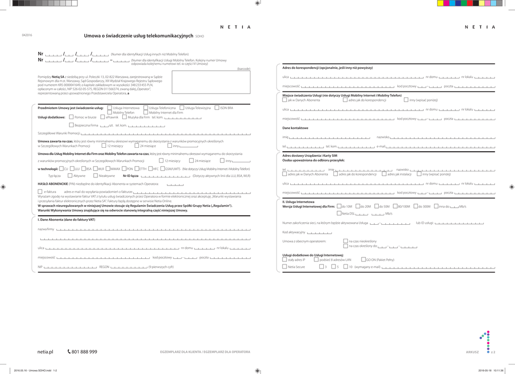 042016 Umowa o świadczenie usług telekomunikacyjnych Nr Nr / / / / / / SOHO (Numer dla identyfikacji Usług innych niż Mobilny Telefon) – (Numer dla identyfikacji Usługi Mobilny Telefon. Kolejny numer Umowy odpowiada kolejnemu numerowi tel. w części VI Umowy) (barcode) Pomiędzy Netią SA z siedzibą przy ul. Poleczki 13, 02-822 Warszawa, zarejestrowaną w Sądzie Rejonowym dla m.st. Warszawy, Sąd Gospodarczy, XIII Wydział Krajowego Rejestru Sądowego pod numerem KRS 0000041649, o kapitale zakładowym w wysokości 348 233 455 PLN, opłaconym w całości, NIP 526-02-05-575, REGON 011566374, zwaną dalej „Operator”, reprezentowaną przez upoważnionego Przedstawiciela Operatora, a Przedmiotem Umowy jest świadczenie usług: Usługi dodatkowe: Pomoc w biurze Bezpieczna Firma Adres do korespondencji (opcjonalnie, jeśli inny niż powyższy) ulica nr domu miejscowość kod pocztowy Miejsce świadczenia Usługi (nie dotyczy Usługi Mobilny Internet i Mobilny Telefon) jak w Danych Abonenta adres jak do korespondencji Usługa Internetowa Usługa Telefoniczna Usługa Telewizyjna Mobilny Telefon Mobilny Internet dla Firm ePrawnik Muzyka dla Firm tel. kom. ISDN BRA poczta inny (wpisać poniżej) ulica nr domu miejscowość szt. tel. kom. – nr lokalu kod pocztowy – nr lokalu poczta Dane kontaktowe Szczegółowe Warunki Promocji: imię Umowa zawarta na czas, który jest równy minimalnemu okresowi wymaganemu do skorzystania z warunków promocyjnych określonych w Szczegółowych Warunkach Promocji 12 miesięcy 24 miesiące inny tel. Umowa dla Usług Mobilny Internet dla Firm oraz Mobilny Telefon zawarta na czas, który jest równy minimalnemu okresowi wymaganemu do skorzystania 12 miesięcy z warunków promocyjnych określonych w Szczegółowych Warunkach Promocji w technologii: Typ łącza CU LLU BSA Aktywne WLR WiMAX Nieaktywne PON ETTH HFC 24 miesiące inny GSM/UMTS (Nie dotyczy Usług Mobilny Internet i Mobilny Telefon) Nr ID łącza nazwisko (Dotyczy aktywnych linii dla LLU, BSA, WLR) tel. kom. e-mail Adres dostawy Urządzenia i Karty SIM Osoba upoważniona do odbioru przesyłek: imię tel. adres jak w Danych Abonenta HASŁO ABONENCKIE (PIN) niezbędne do identyfikacji Abonenta w systemach Operatora: ulica e-faktura adres e-mail do wysyłania powiadomień o fakturze: Wyrażam zgodę na wystawianie faktur VAT z tytułu usług świadczonych przez Operatora w formie elektronicznej oraz akceptuję „Warunki wystawiania i przesyłania faktur elektronicznych przez Netia SA”. Faktury będą dostępne w serwisie Netia Online. W sprawach nieuregulowanych w niniejszej Umowie stosuje się Regulamin Świadczenia Usług przez Spółki Grupy Netia („Regulamin”). Warunki Wykonywania Umowy znajdujące się na odwrocie stanowią integralną część niniejszej Umowy. miejscowość nazwisko adres jak instalacji adres jak do korespondencji inny (wpisać poniżej) nr domu kod pocztowy II. Usługa Internetowa Wersja Usługi Internetowej dla Firm: do 10M do 20M do 50M Netia DSL 80/100M – do 300M nr lokalu poczta inna do: Mb/s Mb/s I. Dane Abonenta (dane do faktury VAT) Numer zakończenia sieci, na którym będzie aktywowana Usługa nazwa firmy ulica nr domu miejscowość kod pocztowy NIP 2016.05.16 - Umowa SOHO.indd 1-2 lub ID usługi: Kod aktywacyjny Umowa z obecnym operatorem: netia.pl – REGON 801 888 999 – na czas nieokreślony na czas określony do: nr lokalu poczta (9 pierwszych cyfr) EGZEMPLARZ DLA KLIENTA / EGZEMPLARZ DLA OPERATORA Usługi dodatkowe do Usługi Internetowej: stały adres IP podsieć 8 adresów LAN Netia Secure 3 5 – – GO ON (Pakiet Pełny) 10 (wymagany e-mail) ARKUSZ z2 2016-05-18 10:11:36 Warunki Wykonywania Umowy I. Zasady Ogólne 1. W przypadku zawierania Umowy z Konsumentem poza lokalem przedsiębiorstwa Operatora lub na odległość, Abonent ma prawo odstąpienia od Umowy bez podawania przyczyny, w terminie 14 dni od daty zawarcia Umowy. Konsument nie ma prawa odstąpienia od umowy zawartej poza lokalem Operatora lub na odległość w przypadku, gdy: a) Operator wykonał w pełni usługę za wyraźną zgodą Konsumenta i przed rozpoczęciem świadczenia usługi poinformował Konsumenta, że po spełnieniu świadczenia Konsument utraci prawo odstąpienia od umowy; b) umowa dotyczy dostarczenia treści cyfrowych, które nie są zapisane na nośniku materialnym, jeżeli spełnienie świadczenia rozpoczęło się za wyraźną zgodą Konsumenta przed upływem terminu do odstąpienia od umowy i po poinformowaniu Konsumenta o utracie prawa odstąpienia od umowy. 1a. Szczegółowe informacje o sposobie i terminie wykonania prawa odstąpienia od umowy, wzorze formularza odstąpienia od umowy, a także kosztach zwrotu rzeczy, które ponosi Konsument w przypadku odstąpienia, oraz obowiązku zapłaty przez Konsumenta poniesionych przez przedsiębiorcę uzasadnionych kosztów zawiera Regulamin oraz załącznik nr 1 do Regulaminu 2. Umowa zawarta na czas określony, równy lub dłuższy niż 30 dni, ulega po upływie okresu, na jaki została zawarta, automatycznemu przedłużeniu, na warunkach z ostatniego Okresu Rozliczeniowego, o ile postanowienia Szczegółowych Warunków Promocji nie stanowią inaczej, na czas nieokreślony, chyba że Abonent na co najmniej 30 dni przed datą upływu okresu obowiązywania Umowy złoży w siedzibie Operatora lub listownie pisemne oświadczenie o braku woli przedłużenia Umowy. 3. Operator umożliwia składanie zamówień na opcje dodatkowe usług, poza formą pisemną, za pomocą środków porozumiewania się na odległość, w szczególności telefonicznie. 4. Zmiana Umowy, w tym jej przedłużenie w innych przypadkach niż określone w punkcie 3., wymaga formy pisemnej, chyba że w Regulaminie lub Umowie wskazano inaczej. Każda ze Stron może rozwiązać Umowę lub zmienić taką Umowę w sposób powodujący ograniczenie zakresu świadczonych Usług w drodze wypowiedzenia ze skutkiem na koniec Okresu Rozliczeniowego następują