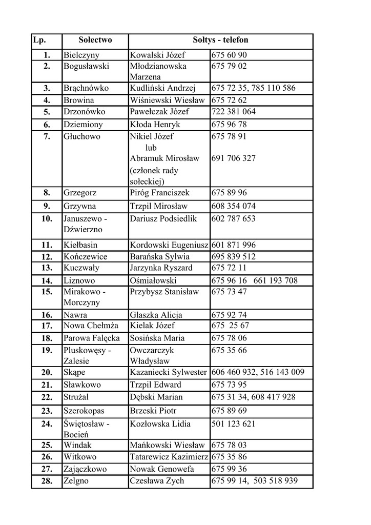 Lp. Sołectwo 1. 2. Bielczyny Bogusławski 3. 4. 5. 6. 7. Brąchnówko Browina Drzonówko Dziemiony Głuchowo Sołtys - telefon Kowalski Józef Młodzianowska Marzena Kudliński Andrzej Wiśniewski Wiesław Pawełczak Józef Kłoda Henryk Nikiel Józef lub Abramuk Mirosław (członek rady sołeckiej) Piróg Franciszek 675 60 90 675 79 02 675 72 35, 785 110 586 675 72 62 722 381 064 675 96 78 675 78 91 691 706 327 8. Grzegorz 9. 10. Grzywna Januszewo Dźwierzno Trzpil Mirosław Dariusz Podsiedlik 608 354 074 602 787 653 11. 12. 13. 14. 15. Kiełbasin Kończewice Kuczwały Liznowo Mirakowo Morczyny Nawra Nowa Chełmża Parowa Falęcka Pluskowęsy Zalesie Skąpe Sławkowo Strużal Kordowski Eugeniusz Barańska Sylwia Jarzynka Ryszard Ośmiałowski Przybysz Stanisław 601 871 996 695 839 512 675 72 11 675 96 16 661 193 708 675 73 47 Glaszka Alicja Kielak Józef Sosińska Maria Owczarczyk Władysław Kazaniecki Sylwester Trzpil Edward Dębski Marian 675 92 74 675 25 67 675 78 06 675 35 66 Brzeski Piotr Kozłowska Lidia 675 89 69 501 123 621 Mańkowski Wiesław Tatarewicz Kazimierz Nowak Genowefa Czesława Zych 675 78 03 675 35 86 675 99 36 675 99 14, 503 518 939 16. 17. 18. 19. 20. 21. 22. 23. 24. 25. 26. 27. 28. Szerokopas Świętosław Bocień Windak Witkowo Zajączkowo Zelgno 675 89 96 606 460 932, 516 143 009 675 73 95 675 31 34, 608 417 928