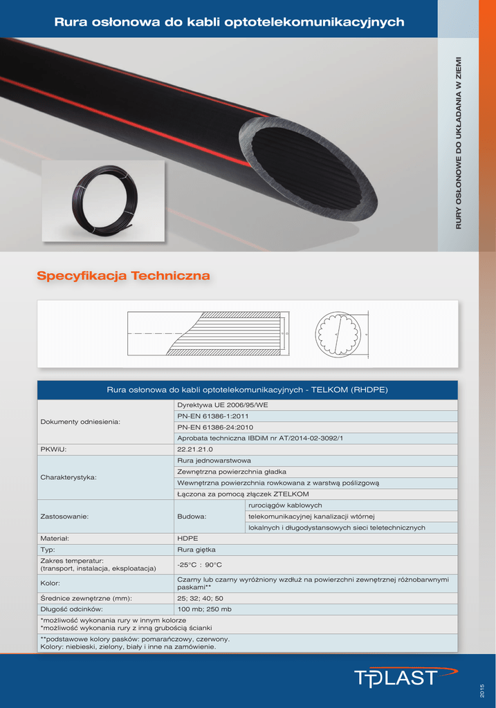 RURY OSŁONOWE DO UKŁADANIA W ZIEMI Rura osłonowa do kabli optotelekomunikacyjnych Specyfikacja Techniczna Rura osłonowa do kabli optotelekomunikacyjnych - TELKOM (RHDPE) Dyrektywa UE 2006/95/WE Dokumenty odniesienia: PN-EN 61386-1:2011 PN-EN 61386-24:2010 Aprobata techniczna IBDiM nr AT/2014-02-3092/1 PKWiU: 22.21.21.0 Rura jednowarstwowa Charakterystyka: Zewnętrzna powierzchnia gładka Wewnętrzna powierzchnia rowkowana z warstwą poślizgową Łączona za pomocą złączek ZTELKOM rurociągów kablowych Zastosowanie: Budowa: telekomunikacyjnej kanalizacji wtórnej Materiał: HDPE Typ: Rura giętka Zakres temperatur: (transport, instalacja, eksploatacja) -25°C ÷ 90°C Kolor: Czarny lub czarny wyróżniony wzdłuż na powierzchni zewnętrznej różnobarwnymi paskami** Średnice zewnętrzne (mm): 25; 32; 40; 50 Długość odcinków: 100 mb; 250 mb lokalnych i długodystansowych sieci teletechnicznych *możliwość wykonania rury w innym kolorze *możliwość wykonania rury z inną grubością ścianki 2015 **podstawowe kolory pasków: pomarańczowy, czerwony. Kolory: niebieski, zielony, biały i inne na zamówienie. Rura osłonowa do kabli optotelekomunikacyjnych Dostępne Rozmiary Rura osłonowa do kabli optotelekomunikacyjnych - TELKOM (RHDPE) lp. nr kat. nazwa symbol dł. zw. (mb) 1 11078 Rura osłonowa do kabli optotelekomunikacyjnych TELKOM (RHDPE) 25/2,0 - 250 M TELKOM 25/2,0 250 2 11079 Rura osłonowa do kabli optotelekomunikacyjnych TELKOM (RHDPE) 25/2,0 - 250 M-p.biały TELKOM 25/2,0 B 250 3 11080 Rura osłonowa do kabli optotelekomunikacyjnych TELKOM (RHDPE) 25/2,0 - 250 M-p.czerwony TELKOM 25/2,0 CZ 250 4 11081 Rura osłonowa do kabli optotelekomunikacyjnych TELKOM (RHDPE) 25/2,0 - 250 M-p.niebieski TELKOM 25/2,0 N 250 5 11082 Rura osłonowa do kabli optotelekomunikacyjnych TELKOM (RHDPE) 25/2,0 - 250 M-p.pomarańczowy TELKOM 25/2,0 P 250 6 11083 Rura osłonowa do kabli optotelekomunikacyjnych TELKOM (RHDPE) 25/2,0 - 250 M-p.zielony TELKOM 25/2,0 Z 250 7 11084 Rura osłonowa do kabli optotelekomunikacyjnych TELKOM (RHDPE) 25/2,3 - 250 M TELKOM 25/2,3 250 8 11085 Rura osłonowa do kabli optotelekomunikacyjnych TELKOM (RHDPE) 25/2,3 - 250 M-p.biały TELKOM 25/2,3 B 250 9 11086 Rura osłonowa do kabli optotelekomunikacyjnych TELKOM (RHDPE) 25/2,3 - 250 M-p.czerwony TELKOM 25/2,3 CZ 250 10 11087 Rura osłonowa do kabli optotelekomunikacyjnych TELKOM (RHDPE) 25/2,3 - 250 M-p.niebieski TELKOM 25/2,3 N 250 11 11088 Rura osłonowa do kabli optotelekomunikacyjnych TELKOM (RHDPE) 25/2,3 - 250 M-p.pomarańczowy TELKOM 25/2,3 P 250 12 11089 Rura osłonowa do kabli optotelekomunikacyjnych TELKOM (RHDPE) 25/2,3 - 250 M-p.zielony TELKOM 25/2,3 Z 250 13 10718 Rura osłonowa do kabli optotelekomunikacyjnych TELKOM (RHDPE) 32/2,0 - 250 m TELKOM 32/2,0 250 14 10719 Rura osłonowa do kabli optotelekomunikacyjnych TELKOM (RHDPE) 32/2,0 - 250 m - p.biały TELKOM 32/2,0 B 250 15 10720 Rura osłonowa do kabli optotelekomunikacyjnych TELKOM (RHDPE) 32/2,0 - 250 m - p.czerwony TELKOM 32/2,0 CZ 250 16 10721 Rura osłonowa do kabli optotelekomunikacyjnych TELKOM (RHDPE) 32/2,0 - 250 m - p.niebieski TELKOM 32/2,0 N 250 17 10722 Rura osłonowa do kabli optotelekomunikacyjnych TELKOM (RHDPE) 32/2,0 - 250 m - p.pomarańczowy TELKOM 32/2,0 P 250 18 10723 Rura osłonowa do kabli optotelekomunikacyjnych TELKOM (RHDPE) 32/2,0 - 250 m - p.zielony TELKOM 32/2,0 Z 250 19 10724 Rura osłonowa do kabli optotelekomunikacyjnych TELKOM (RHDPE) 32/2,9 - 250 m TELKOM 32/2,9 250 20 10725 Rura osłonowa do kabli optotelekomunikacyjnych TELKOM (RHDPE) 32/2,9 - 250 m - p.biały TELKOM 32/2,9 B 250 21 10726 Rura osłonowa do kabli optotelekomunikacyjnych TELKOM (RHDPE) 32/2,9 - 250 m - p.czerwony TELKOM 32/2,9 CZ 250 22 10727 Rura osłonowa do kabli optotelekomunikacyjnych TELKOM (RHDPE) 32/2,9 - 250 m - p.niebieski TELKOM 32/2,9 N 250 23 10728 Rura osłonowa do kabli optotelekomunikacyjnych TELKOM (RHDPE) 32/2,9 - 250 m - p.pomarańczowy TELKOM 32/2,9 P 250 24 10729 Rura osłonowa do kabli optotelekomunikacyjnych TELKOM (RHDPE) 32/2,9 - 250 m - p.zielony TELKOM 32/2,9 Z 250 25 10730 Rura osłonowa do kabli optotelekomunikacyjnych TELKOM (RHDPE) 40/3,7 - 250 m TELKOM 40/3,7 250 26 10731 Rura osłonowa do kabli optotelekomunikacyjnych TELKOM (RHDPE) 40/3,7 - 250 m - p.biały TELKOM 40/3,7 B 250 27 10732 Rura osłonowa do kabli optotelekomunikacyjnych TELKOM (RHDPE) 40/3,7 - 250 m - p.czerwony TELKOM 40/3,7 CZ 250 28 10733 Rura osłonowa do kabli optotelekomunikacyjnych TELKOM (RHDPE) 40/3,7 - 250 m - p.niebieski TELKOM 40/3,7 N 250 29 10734 Rura osłonowa do kabli optotelekomunikacyjnych TELKOM (RHDPE) 40/3,7 - 250 m - p.pomarańczowy TELKOM 40/3,7 P 250 30 10735 Rura osłonowa do kabli optotelekomunikacyjnych TELKOM (RHDPE) 40/3,7 - 250 m - p.zielony TELKOM 40/3,7 Z 250 31 10736 Rura osłonowa do kabli optotelekomunikacyjnych TELKOM (RHDPE) 50/4,6 - 100 m TELKOM 50/4,6 100 32 10737 Rura osłonowa do kabli optotelekomunikacyjnych TELKOM (RHDPE) 50/4,6 - 100 m - p.biały TELKOM 50/4,6 B 100 33 10738 Rura osłonowa do kabli optotelekomunikacyjnych TELKOM (RHDPE) 50/4,6 - 100 m - p.czerwony TELKOM 50/4,6 CZ 100 34 10739 Rura osłonowa do kabli optotelekomunikacyjnych TELKOM (RHDPE) 50/4,6 - 100 m - p.niebieski TELKOM 50/4,6 N 100 35 10740 Rura osłonowa do kabli optotelekomunikacyjnych TELKOM (RHDPE) 50/4,6 - 100 m - p.pomarańczowy TELKOM 50/4,6 P 100 36 10741 Rura osłonowa do kabli optotelekomunikacyjnych TELKOM (RHDPE) 50/4,6 - 100 m - p.zielony TELKOM 50/4,6 Z 100