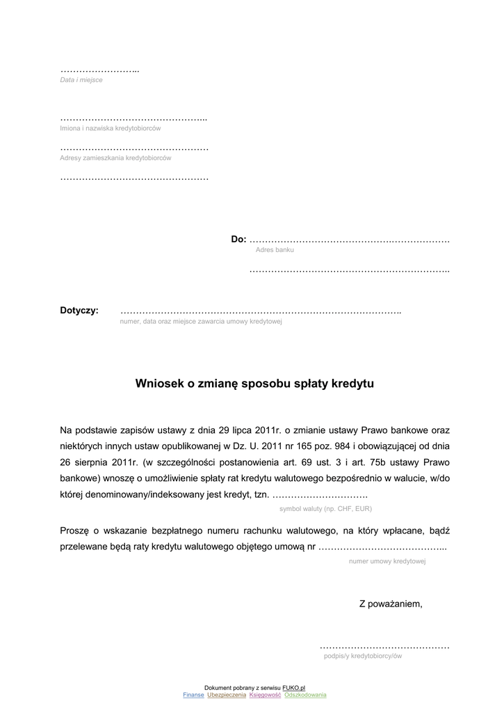 …………………….. Data i miejsce ………………………………………... Imiona i nazwiska kredytobiorców ………………………………………… Adresy zamieszkania kredytobiorców ………………………………………… Do: ……………………………………….………………. Adres banku ……………………………………………………….. Dotyczy: ………………………………………………………………………………. numer, data oraz miejsce zawarcia umowy kredytowej Wniosek o zmianę sposobu spłaty kredytu Na podstawie zapisów ustawy z dnia 29 lipca 2011r. o zmianie ustawy Prawo bankowe oraz niektórych innych ustaw opublikowanej w Dz. U. 2011 nr 165 poz. 984 i obowiązującej od dnia 26 sierpnia 2011r. (w szczególności postanowienia art. 69 ust. 3 i art. 75b ustawy Prawo bankowe) wnoszę o umożliwienie spłaty rat kredytu walutowego bezpośrednio w walucie, w/do której denominowany/indeksowany jest kredyt, tzn. …………………………. symbol waluty (np. CHF, EUR) Proszę o wskazanie bezpłatnego numeru rachunku walutowego, na który wpłacane, bądź przelewane będą raty kredytu walutowego objętego umową nr …………………………………... numer umowy kredytowej Z poważaniem, …………………………………… podpis/y kredytobiorcy/ów Dokument pobrany z serwisu FUKO.pl Finanse Ubezpieczenia Księgowość Odszkodowania