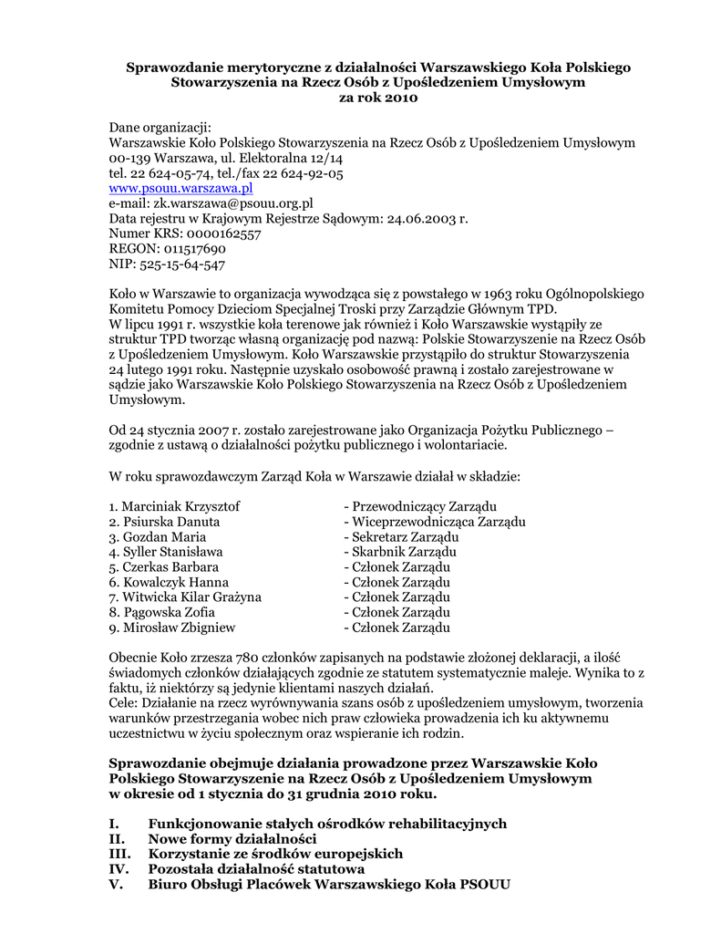 Sprawozdanie merytoryczne z działalności Warszawskiego Koła Polskiego Stowarzyszenia na Rzecz Osób z Upośledzeniem Umysłowym za rok 2010 Dane organizacji: Warszawskie Koło Polskiego Stowarzyszenia na Rzecz Osób z Upośledzeniem Umysłowym 00-139 Warszawa, ul. Elektoralna 12/14 tel. 22 624-05-74, tel./fax 22 624-92-05 www.psouu.warszawa.pl e-mail: [email protected] Data rejestru w Krajowym Rejestrze Sądowym: 24.06.2003 r. Numer KRS: 0000162557 REGON: 011517690 NIP: 525-15-64-547 Koło w Warszawie to organizacja wywodząca się z powstałego w 1963 roku Ogólnopolskiego Komitetu Pomocy Dzieciom Specjalnej Troski przy Zarządzie Głównym TPD. W lipcu 1991 r. wszystkie koła terenowe jak również i Koło Warszawskie wystąpiły ze struktur TPD tworząc własną organizację pod nazwą: Polskie Stowarzyszenie na Rzecz Osób z Upośledzeniem Umysłowym. Koło Warszawskie przystąpiło do struktur Stowarzyszenia 24 lutego 1991 roku. Następnie uzyskało osobowość prawną i zostało zarejestrowane w sądzie jako Warszawskie Koło Polskiego Stowarzyszenia na Rzecz Osób z Upośledzeniem Umysłowym. Od 24 stycznia 2007 r. zostało zarejestrowane jako Organizacja Pożytku Publicznego – zgodnie z ustawą o działalności pożytku publicznego i wolontariacie. W roku sprawozdawczym Zarząd Koła w Warszawie działał w składzie: 1. Marciniak Krzysztof 2. Psiurska Danuta 3. Gozdan Maria 4. Syller Stanisława 5. Czerkas Barbara 6. Kowalczyk Hanna 7. Witwicka Kilar Grażyna 8. Pągowska Zofia 9. Mirosław Zbigniew - Przewodniczący Zarządu - Wiceprzewodnicząca Zarządu - Sekretarz Zarządu - Skarbnik Zarządu - Członek Zarządu - Członek Zarządu - Członek Zarządu - Członek Zarządu - Członek Zarządu Obecnie Koło zrzesza 780 członków zapisanych na podstawie złożonej deklaracji, a ilość świadomych członków działających zgodnie ze statutem systematycznie maleje. Wynika to z faktu, iż niektórzy są jedynie klientami naszych działań. Cele: Działanie na rzecz wyrównywania szans osób z upośledzeniem umysłowym, tworzenia warunków przestrzegania wobec nich praw człowieka prowadzenia ich ku aktywnemu uczestnictwu w życiu społecznym oraz wspieranie ich rodzin. Sprawozdanie obejmuje działania prowadzone przez Warszawskie Koło Polskiego Stowarzyszenie na Rzecz Osób z Upośledzeniem Umysłowym w okresie od 1 stycznia do 31 grudnia 2010 roku. I. II. III. IV. V. Funkcjonowanie stałych ośrodków rehabilitacyjnych Nowe formy działalności Korzystanie ze środków europejskich Pozostała działalność statutowa Biuro Obsługi Placówek Warszawskiego Koła PSOUU I. Funkcjonowanie stałych ośrodków rehabilitacyjnych Ilość zatrudnionych pracowników ogółem Ilość zatrudnionych pracowników w przeliczeniu na pełne etaty Ilość zatrudnionych pracowników w ramach umów cywilno-prawnych Ilość zatrudnionych pracowników w ramach działalności gospodarczej Informacja o liczbie uczestników i zatrudnionych w poszczególnych ośrodkach prowadzonych w r. 2010 przez Warszawskie Koło PSOUU 1. Ośrodek RehabilitacyjnoEdukacyjnoWychowawczy ul. Wrzeciono 10c ul. Krasińskiego 38c Tel./fax 226338188 tel./fax 228356020 174 45 26,45 12 3 2. Środowiskowy Dom Samopomocy ul. Hoża 27 Tel./fax 226286043 25 6 5 1 3. Środowiskowy Dom Samopomocy ul. Grochowska 259 Tel./fax 228109481 44 14 8,5 5 - 4. Ośrodek Dzienny ul. Walecznych 25 m 10 Tel./fax 226176141 17 6 3 4 - 5. Dom Rodzinny ul. Mysłowicka 12 22-8332215 9 5 4 1 - 6. Zespół Rehabilitacyjny ul. Elektoralna 12/14 22-6240574 35 18 0,25 17 7. Mieszkanie Treningowe*) ul. Oszmiańska 10/3 22 4087711 16 3 - 3 Lp. Rodzaj placówki Adres do korespondencji telefon/fax. Liczba korzystających - *) Program pilotaŜowy w okresie 15.09 - 31.12.2010 r. 1. Ośrodek Rehabilitacyjno-Edukacyjno-Wychowawczy (OREW) Obejmował w ubiegłym roku systematyczną, kompleksową edukacją i rehabilitacją dzieci i młodzieŜ z głębokim i znacznym stopniem niepełnosprawności intelektualnej, z wadami sprzęŜonymi z niepełnosprawnością oraz deficytami neurologicznymi. W Ośrodku prowadzone były: - zajęcia rewalidacyjno-wychowawcze jako forma realizacji przez głęboko niepełnosprawne dzieci obowiązku szkolnego – 43 uczniów, - zajęcia uzupełniające stymulujące rozwój – 25 uczestników - zajęcia z zakresu wczesnego wspomagania rozwoju – 21 dzieci - oraz prowadzona w ramach NZOZ-u Ośrodka Rehabilitacyjnego i kontraktu z NFZ, rehabilitacja dzieci z zaburzeniami wieku rozwojowego – razem 174 pacjentów Głównym zadaniem podejmowanych w Ośrodku zabiegów było spowodowanie lepszego funkcjonowania dzieci i zapewnienie im szerszego udziału w Ŝyciu ich najbliŜszego otoczenia. Przez cały rok ośrodek zajmował się równieŜ wspieraniem rodzin, udzielał szeroko pojętej pomocy psychologicznej, rzeczowej i prawnej współpracował z organizacjami pozarządowymi oraz organami samorządu terytorialnego. W ramach zajęć rewalidacyjno-wychowawczych prowadzone były zajęcia usprawniające róŜne sfery aktywności: - muzykoterapia – kształtująca u dzieci świadomość muzyczną - zajęcia logopedyczne – wykorzystujące pozawerbalne formy komunikacji - usprawnianie małej motoryki – ze szczególnym naciskiem na zabawy manipulacyjne - usprawnianie duŜej motoryki – z ćwiczeniami Metodą Ruchu Rozwijającego – W. Sherborne umoŜliwiającymi bezpieczne poznawanie przestrzeni i bezpośredni kontakt z nauczycielem - rozwijanie zainteresowania otoczeniem – kształtowanie umiejętności funkcjonowania w nim - elementy z zakresu integracji sensorycznej – stymulującej układ przedsionkowy, słuchowy, proprioceptywny i wzrokowy. Głównym celem zajęć dodatkowych było rozwijanie autonomii ucznia, jego socjalizacja oraz wyposaŜenie w maksymalną niezaleŜność Ŝyciową w zakresie zaspokojenia podstawowych potrzeb: - młodzieŜ uczyła się radzenia sobie w sytuacjach zagraŜających zdrowiu i Ŝyciu - kształtowała